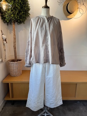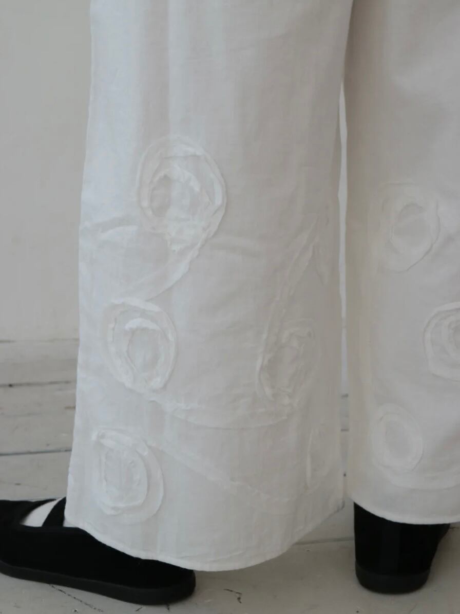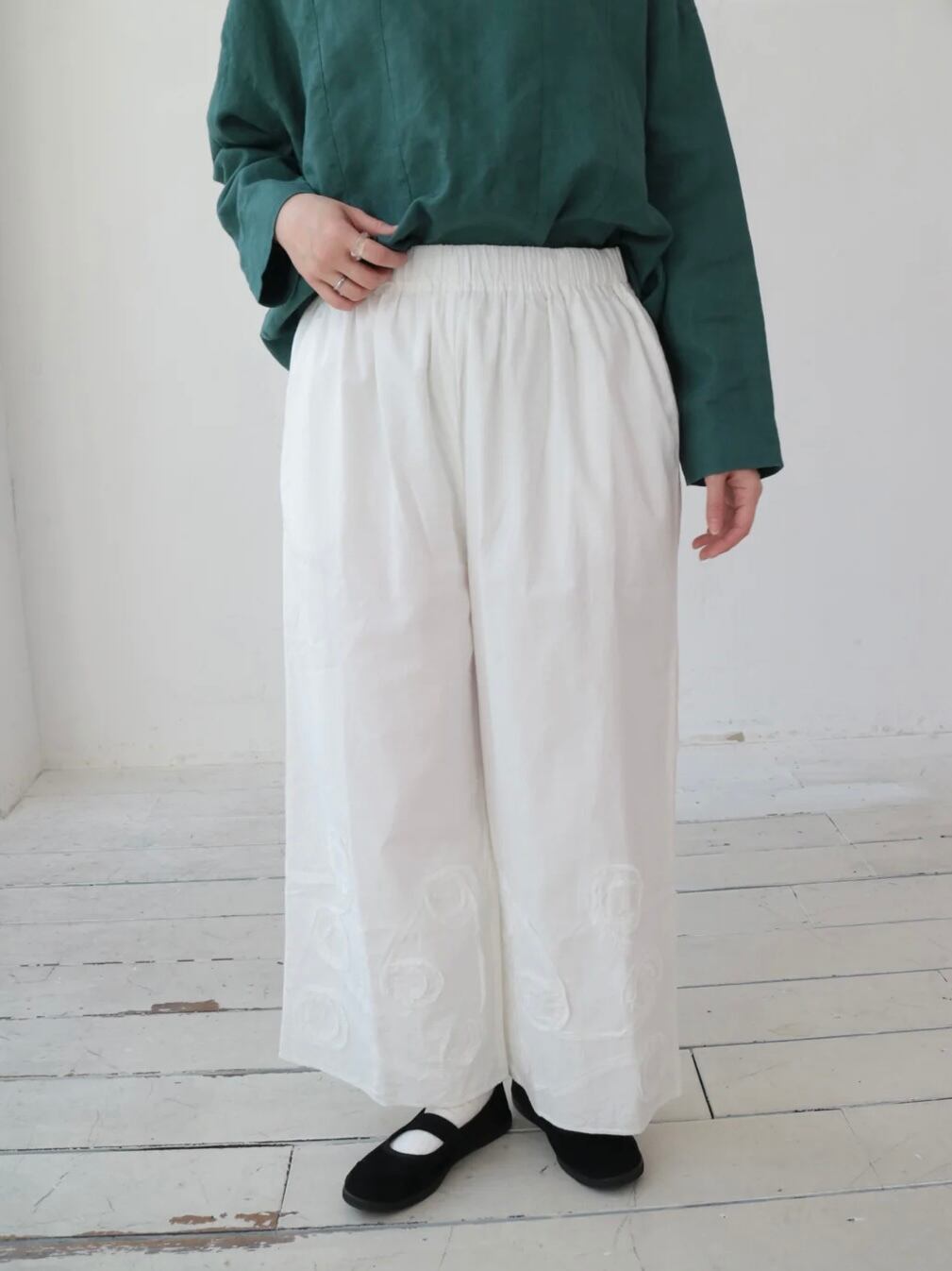 クラフト感あふれるテープ刺繍を裾に施したコットンボイル生地のパンツです