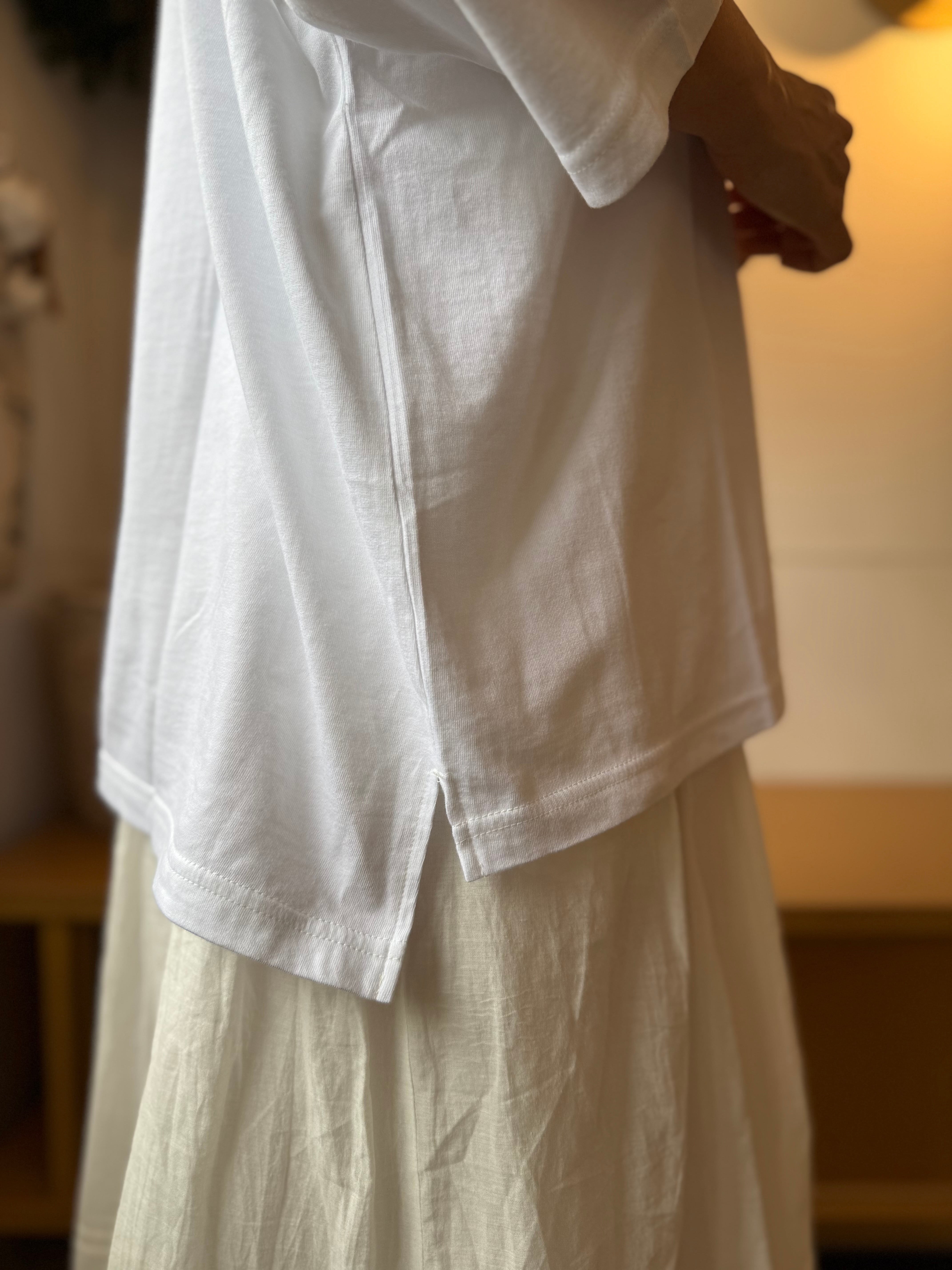 生地が薄手で柔らかいため長めの着丈でドレープが入るシルエット◎