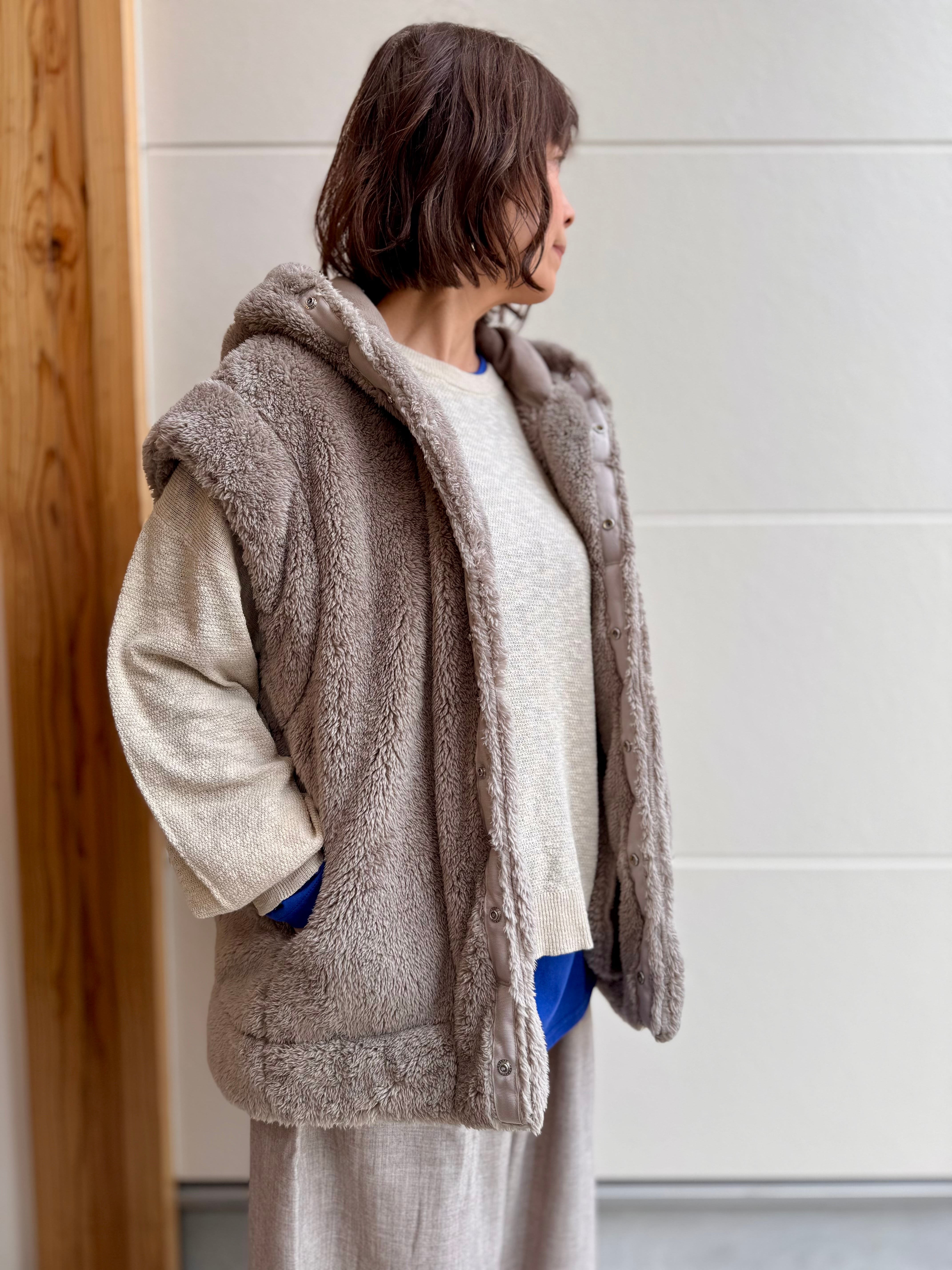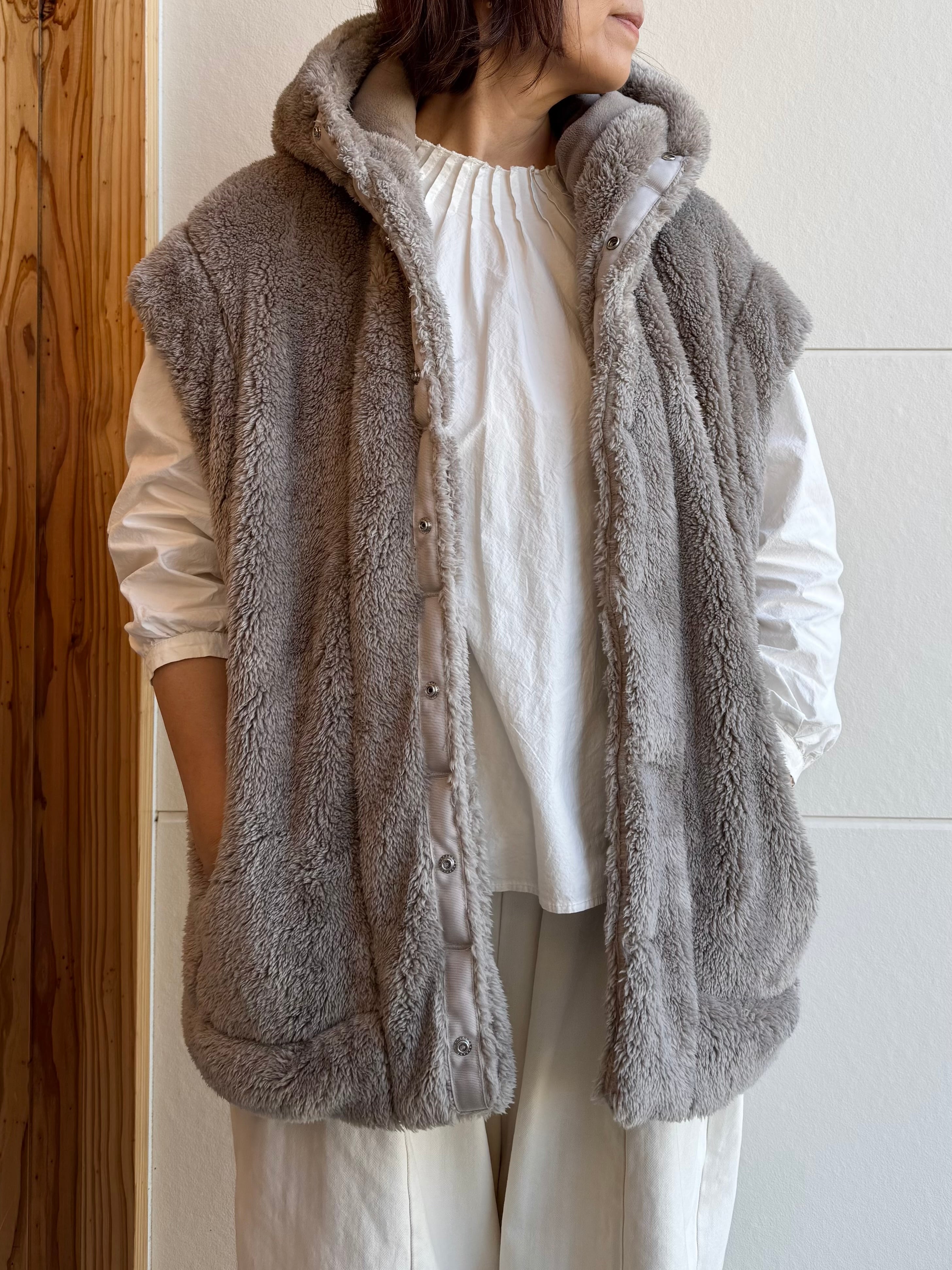 前あきのフードパーカーをジレのようなノースリーブに仕立てています