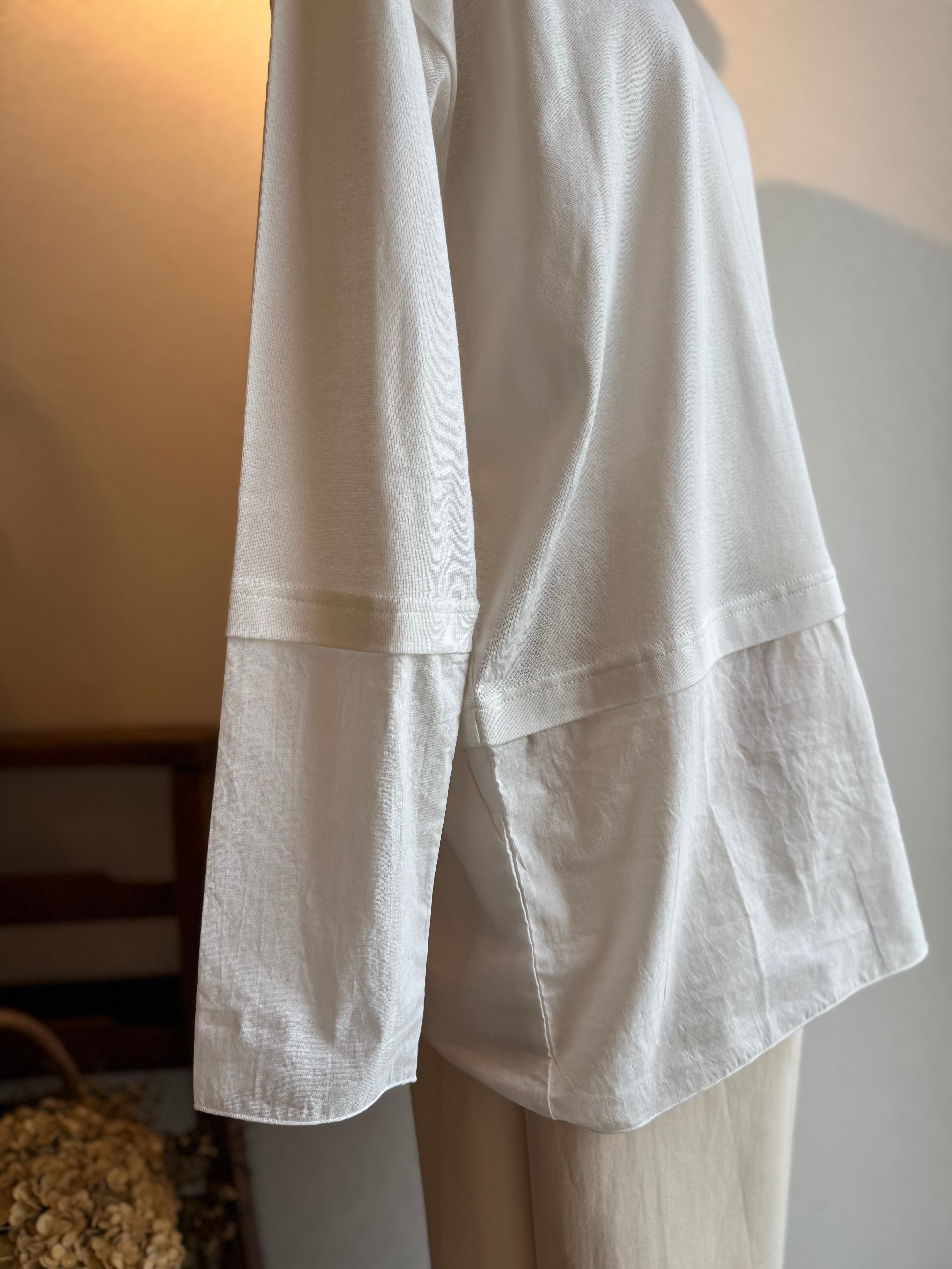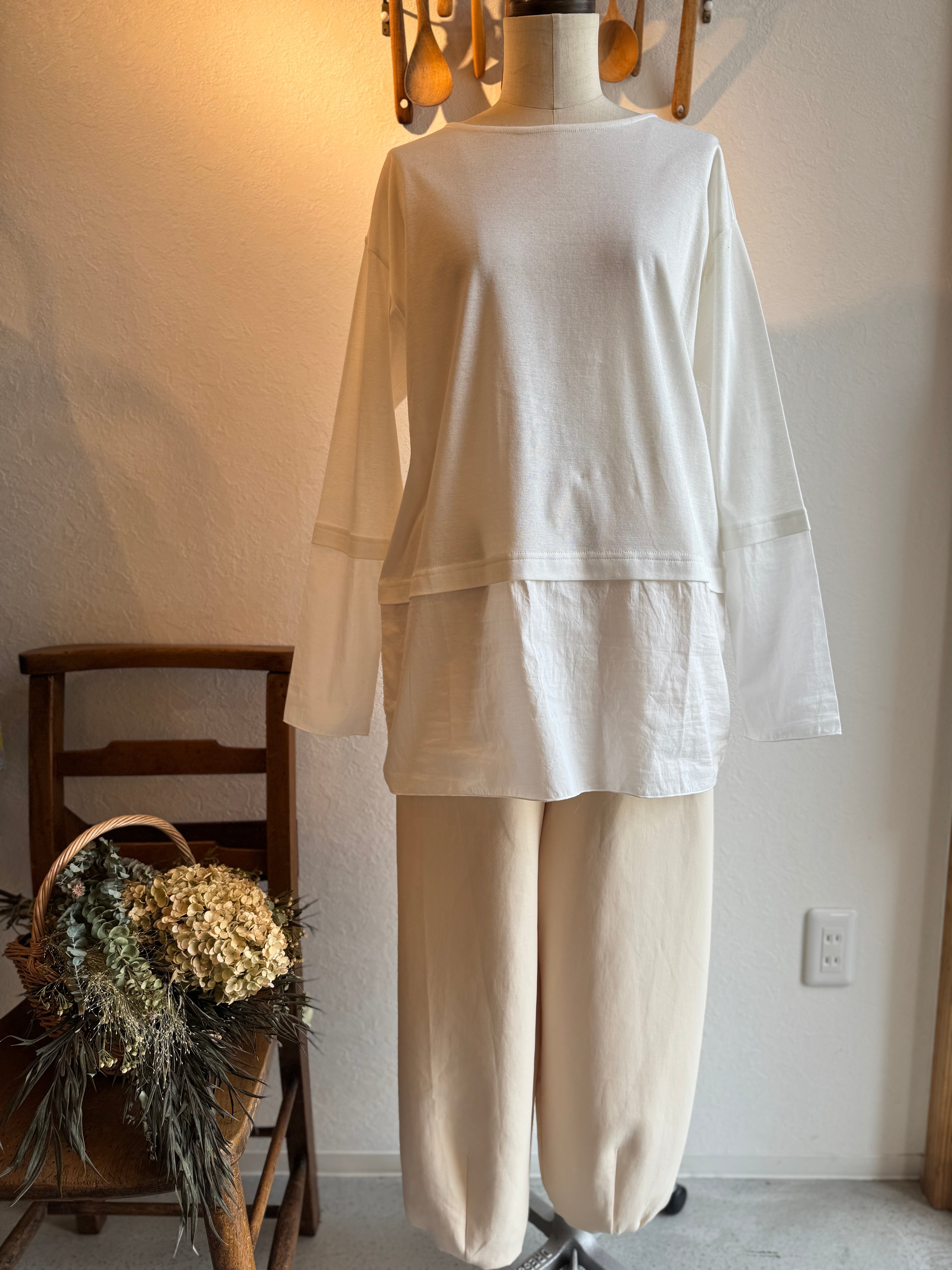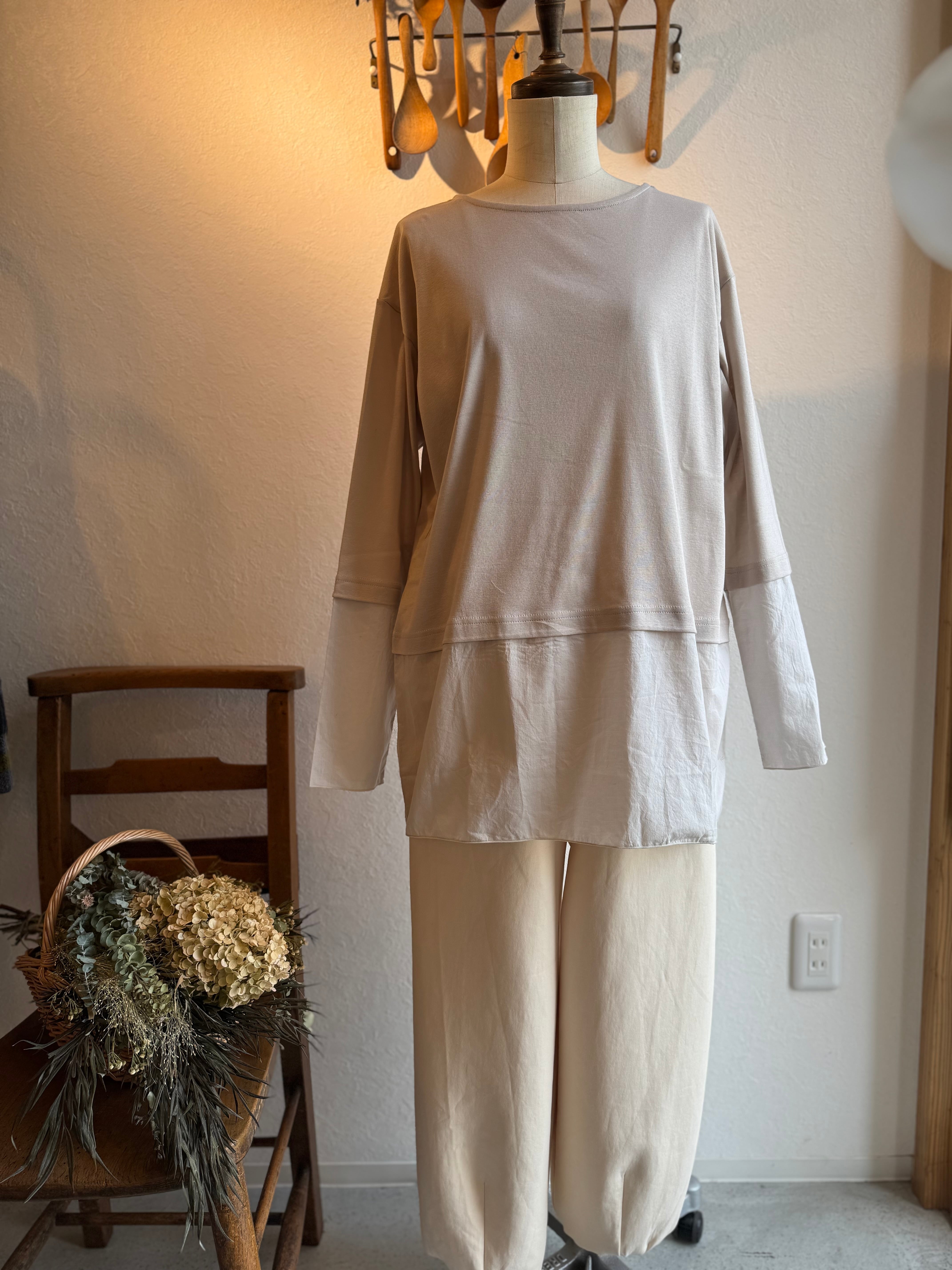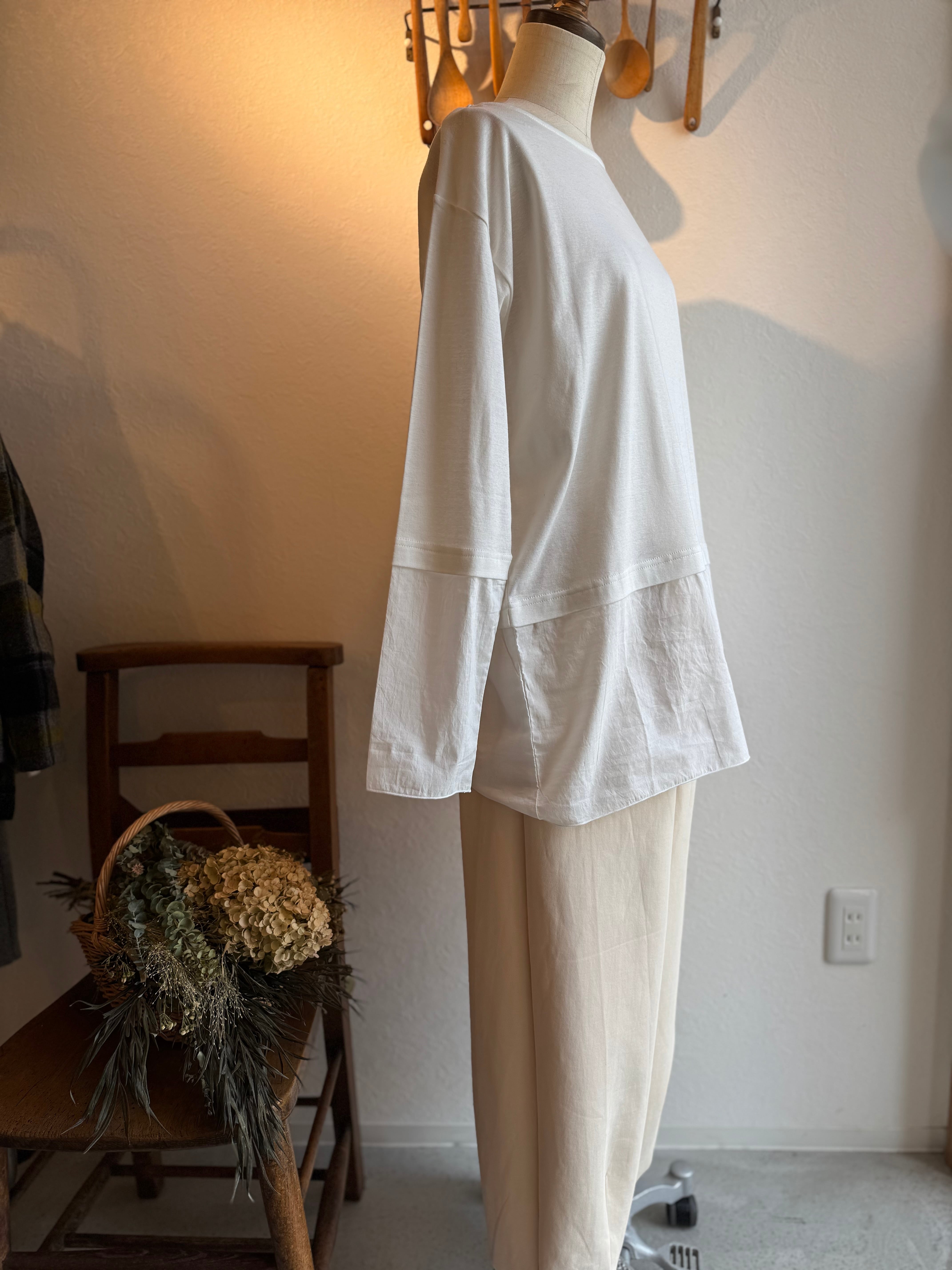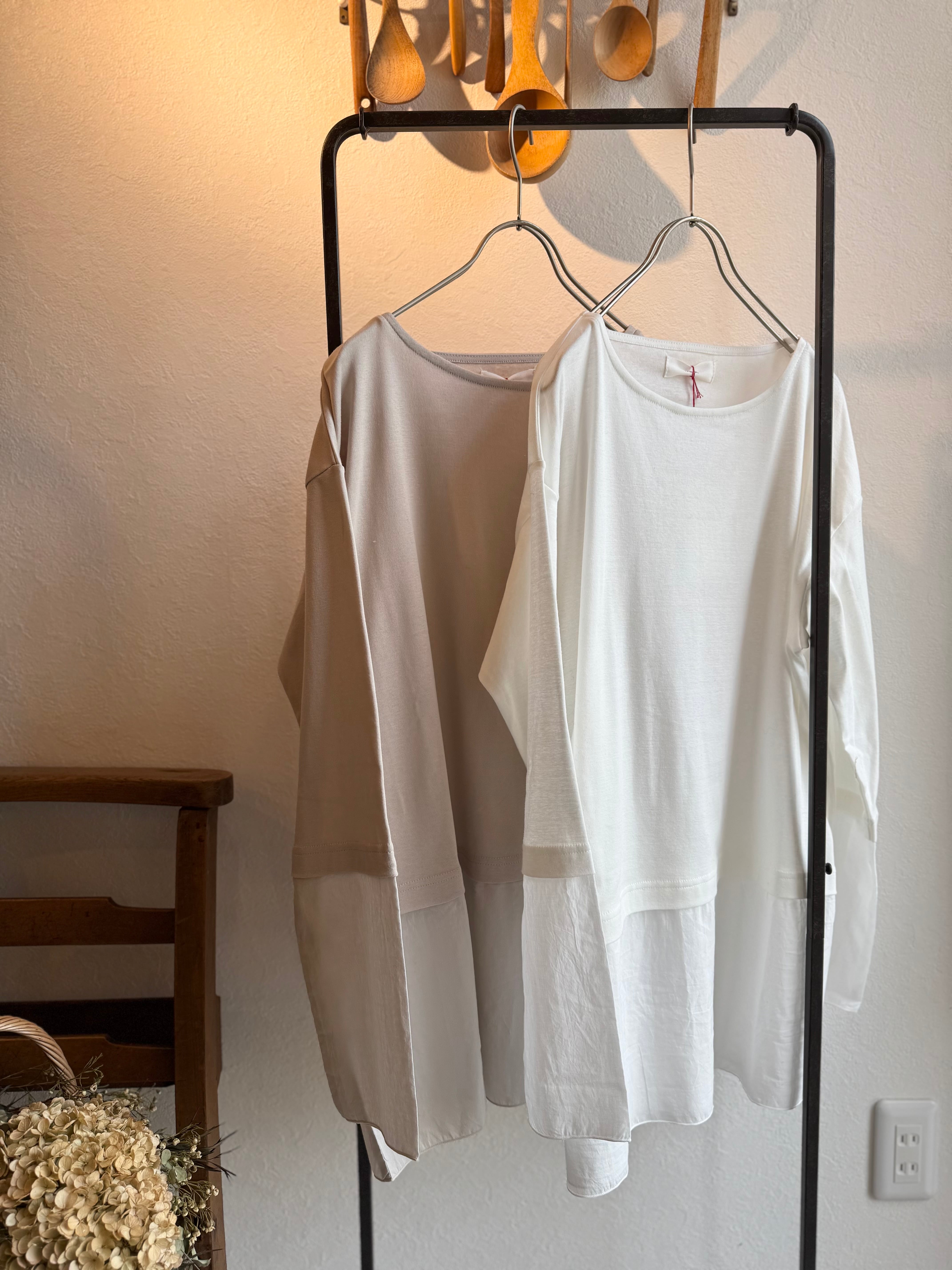 身ごろはカットソー素材で着心地よく、裾と袖はさらりとしたコットン生地でやや長めになっています