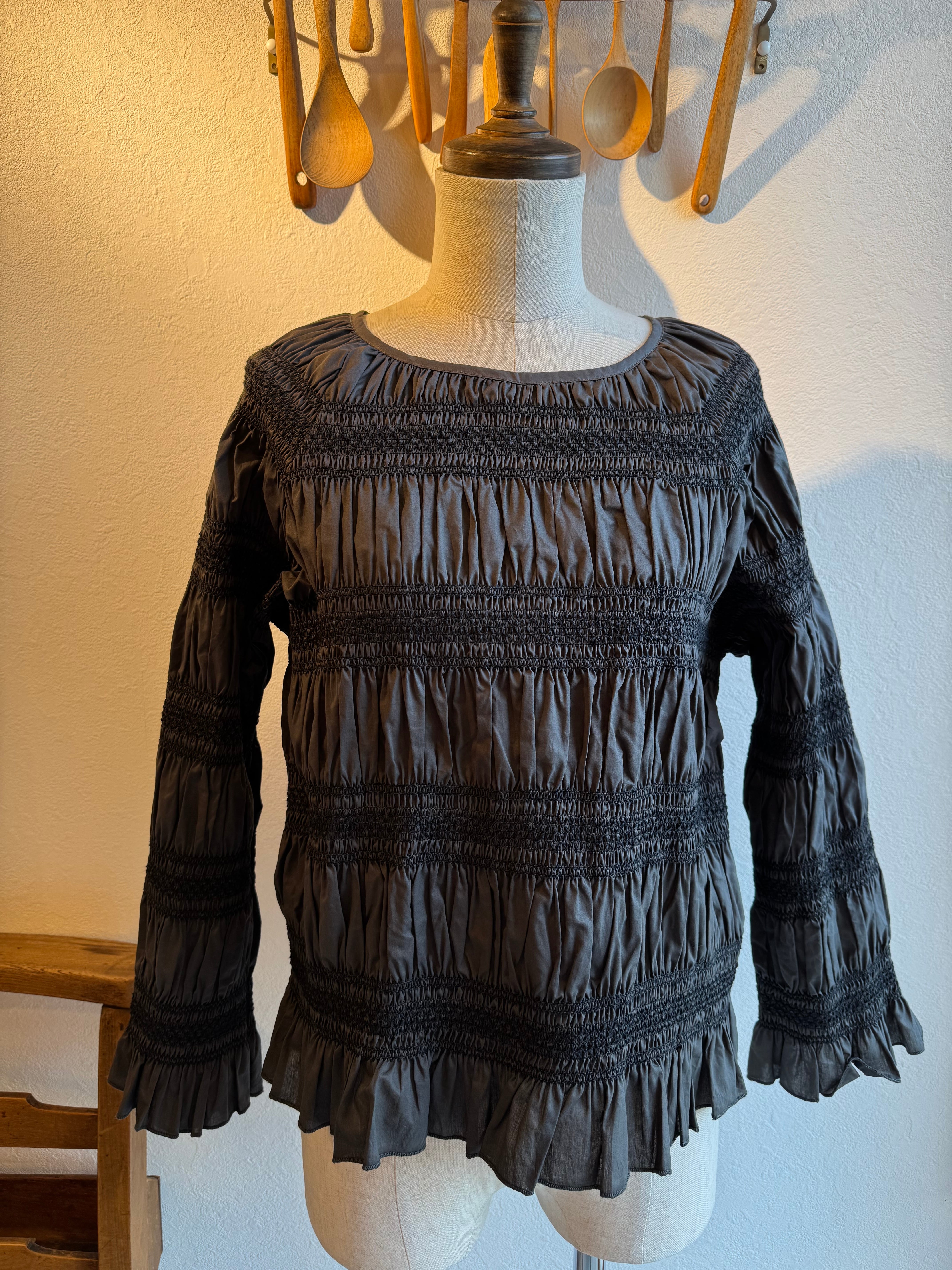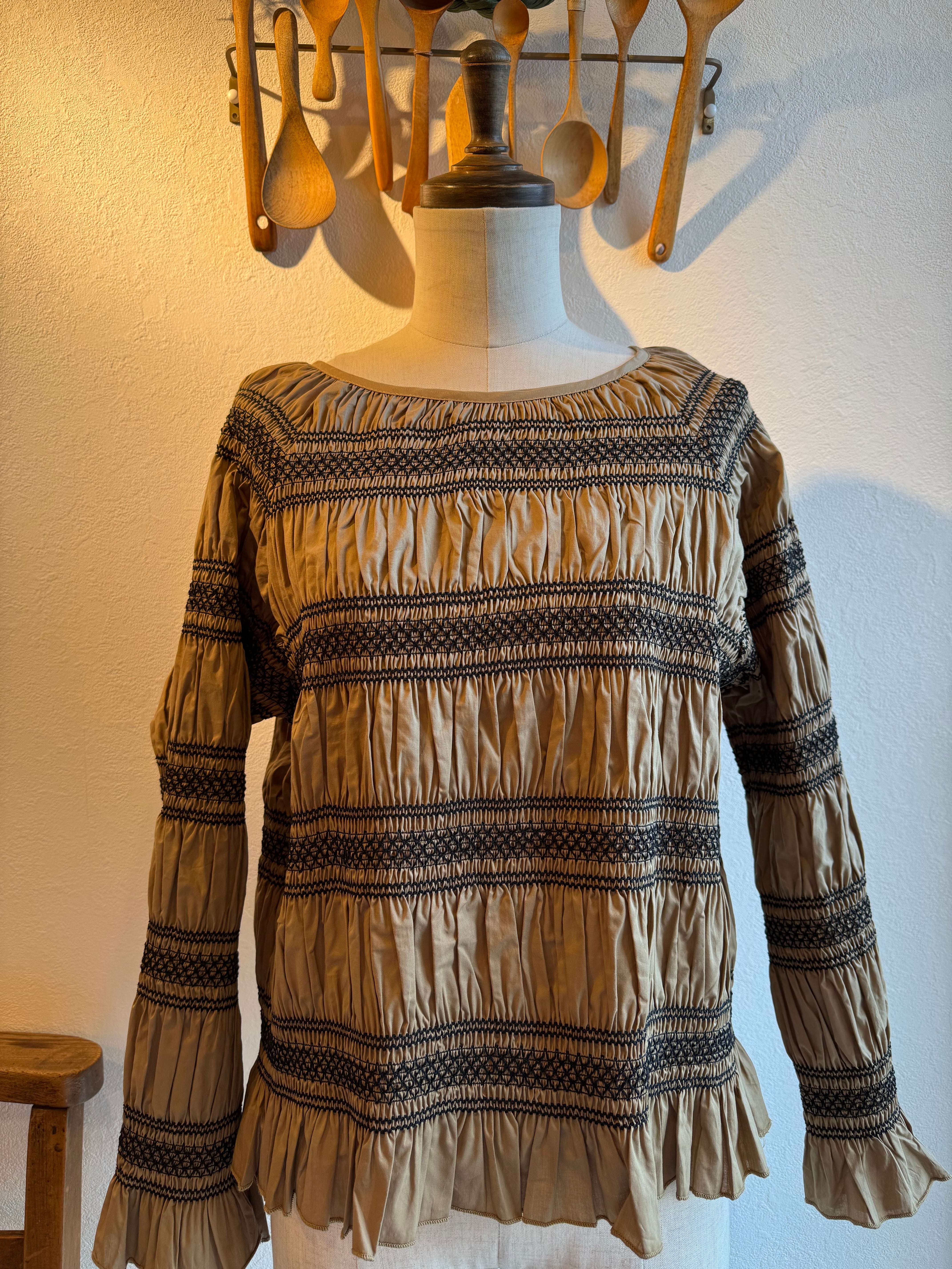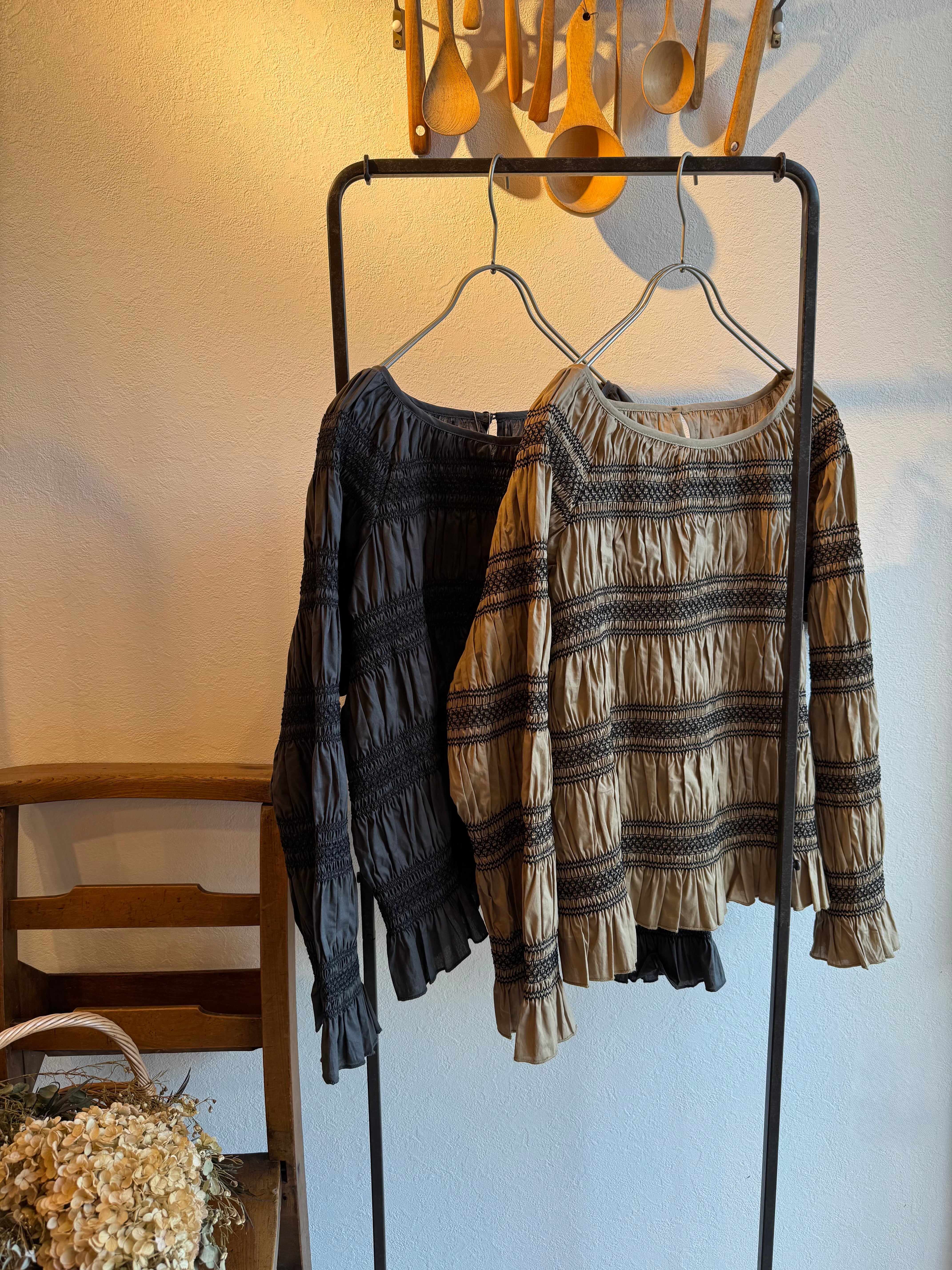 スモッキングをボーダー状に施したデザインのブラウスです
