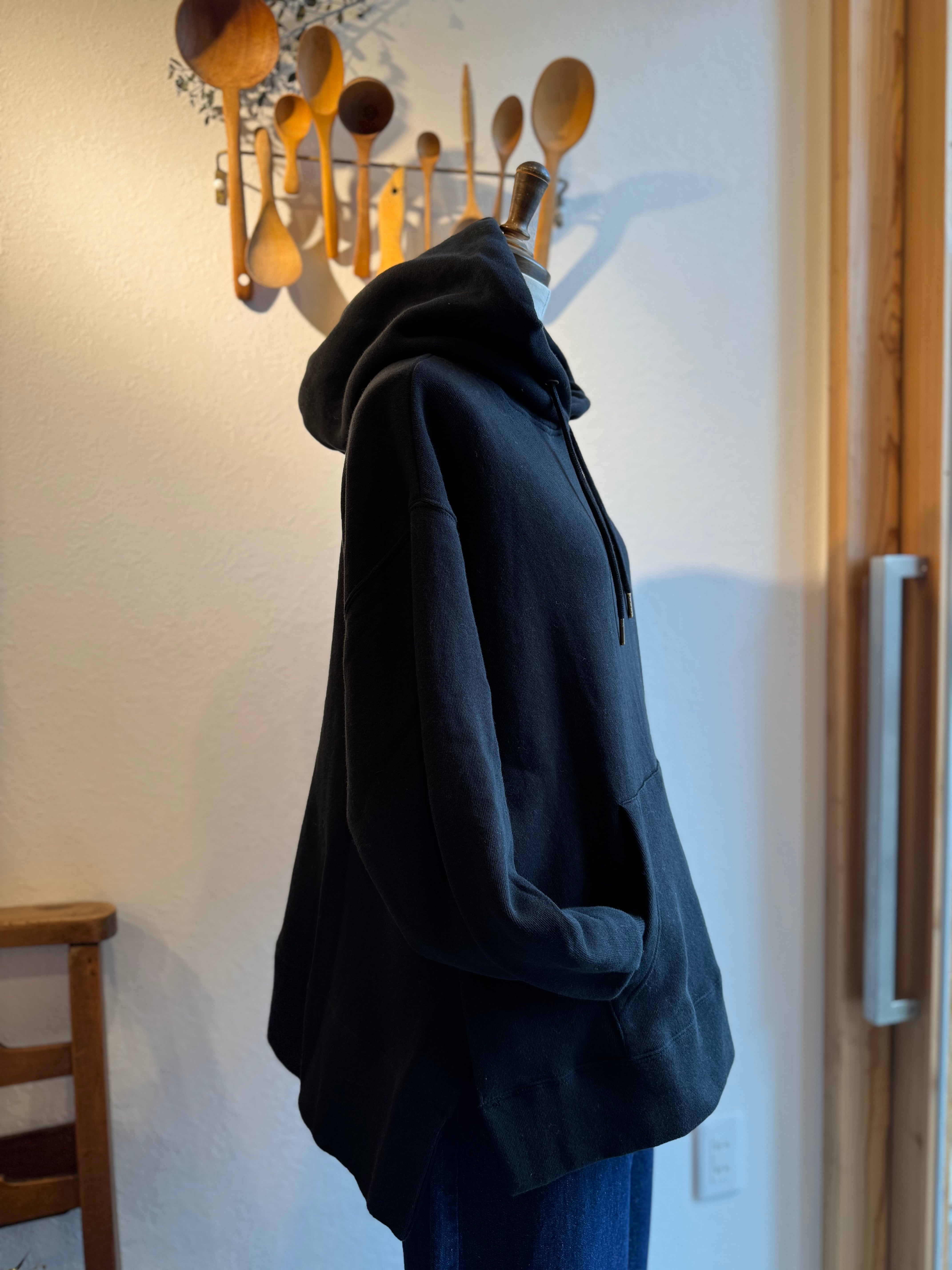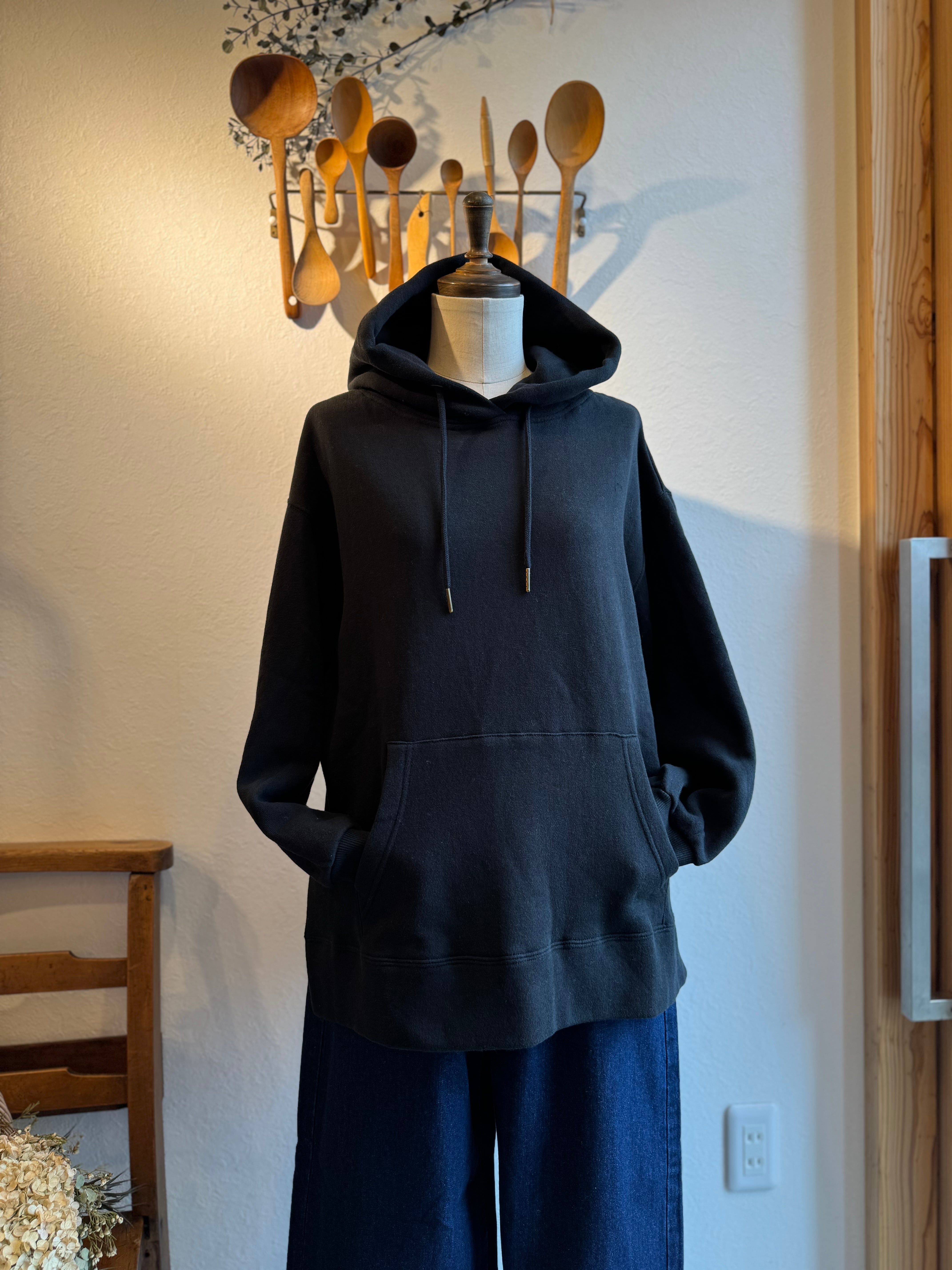 いっけんシンプルで普通かなと思われるフーディですが、こちらは希少な吊り編み機でふっくらと編み立てた丁寧な作りの裏毛プルオーバーです