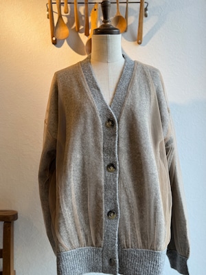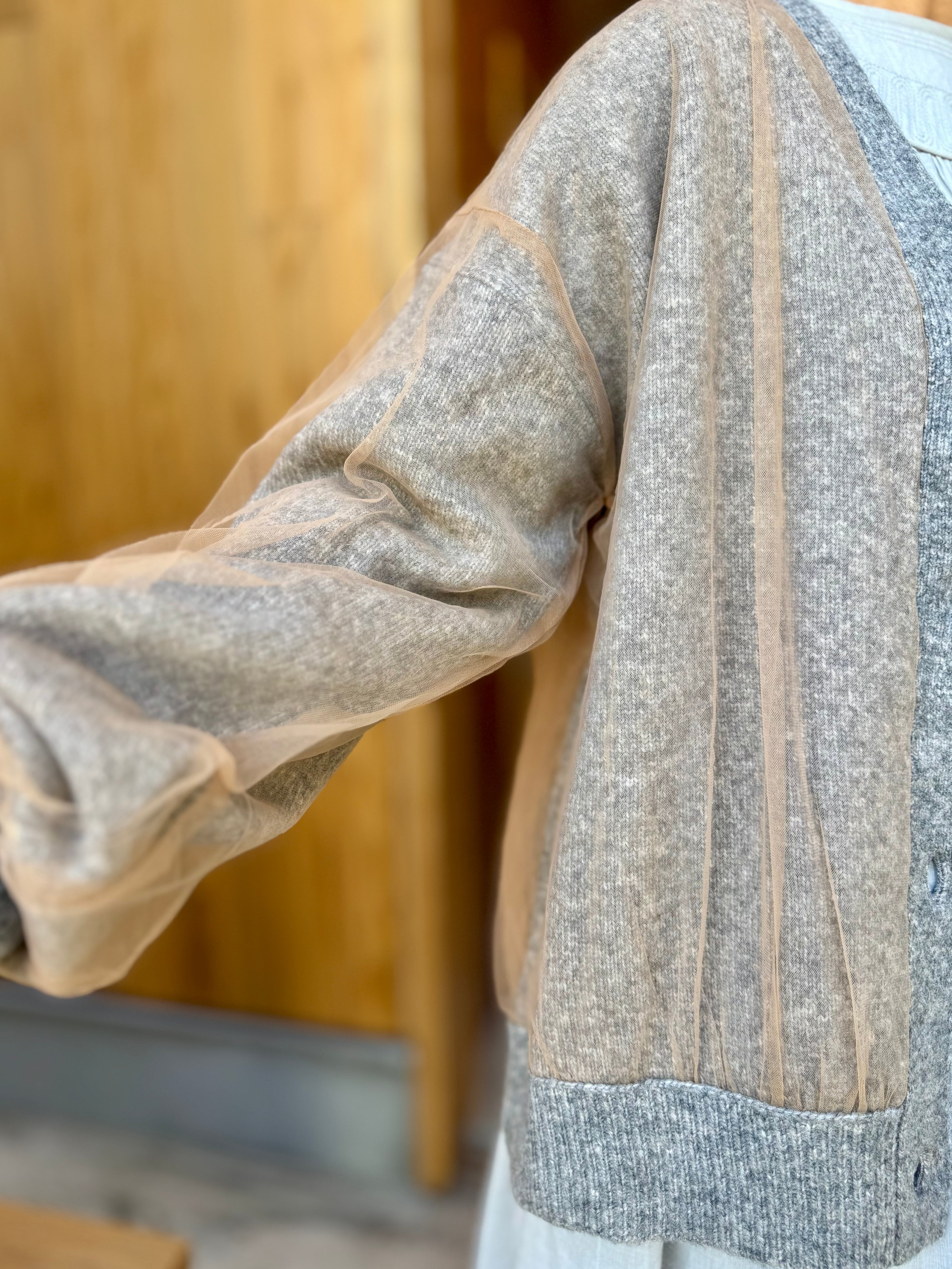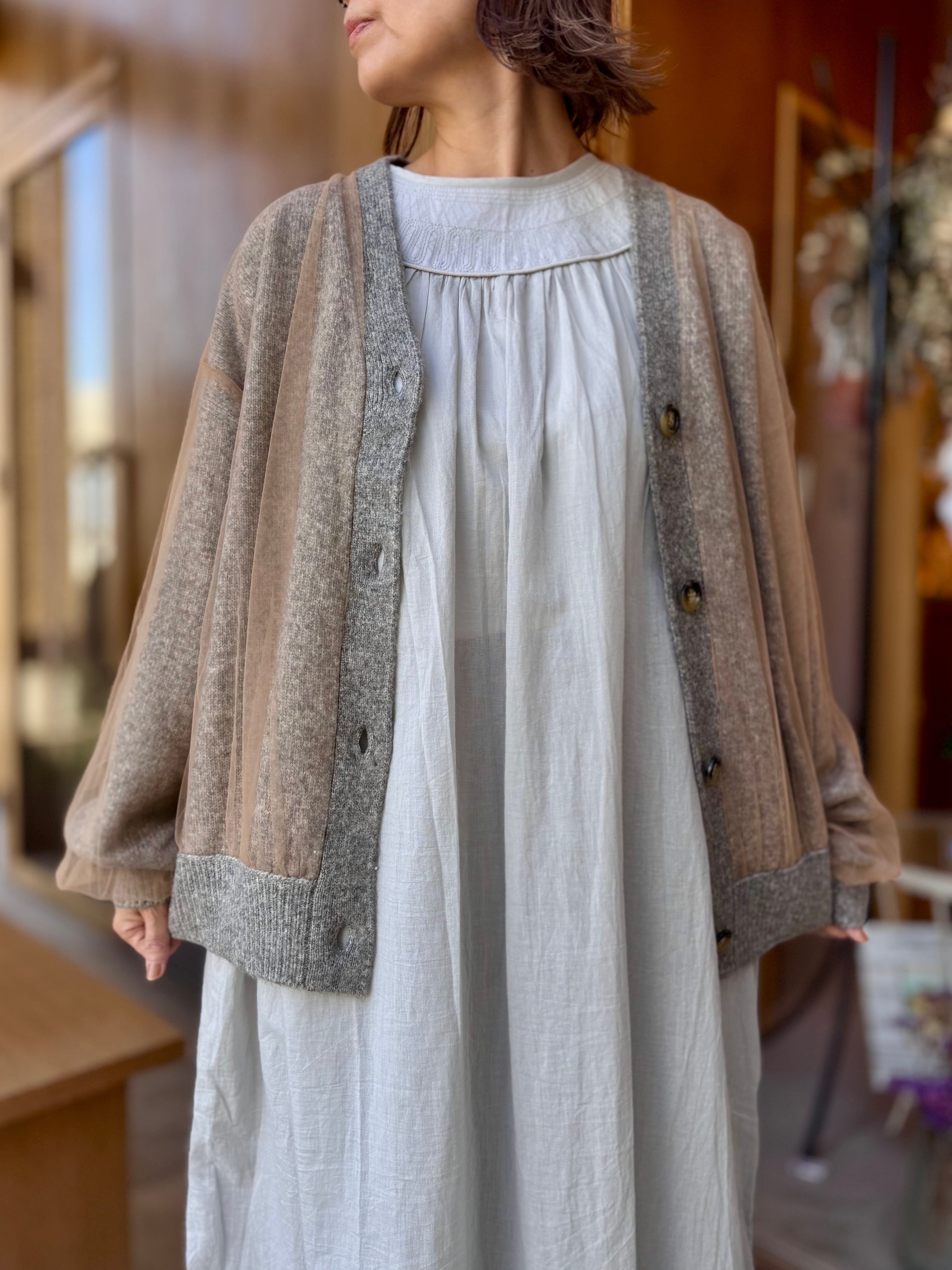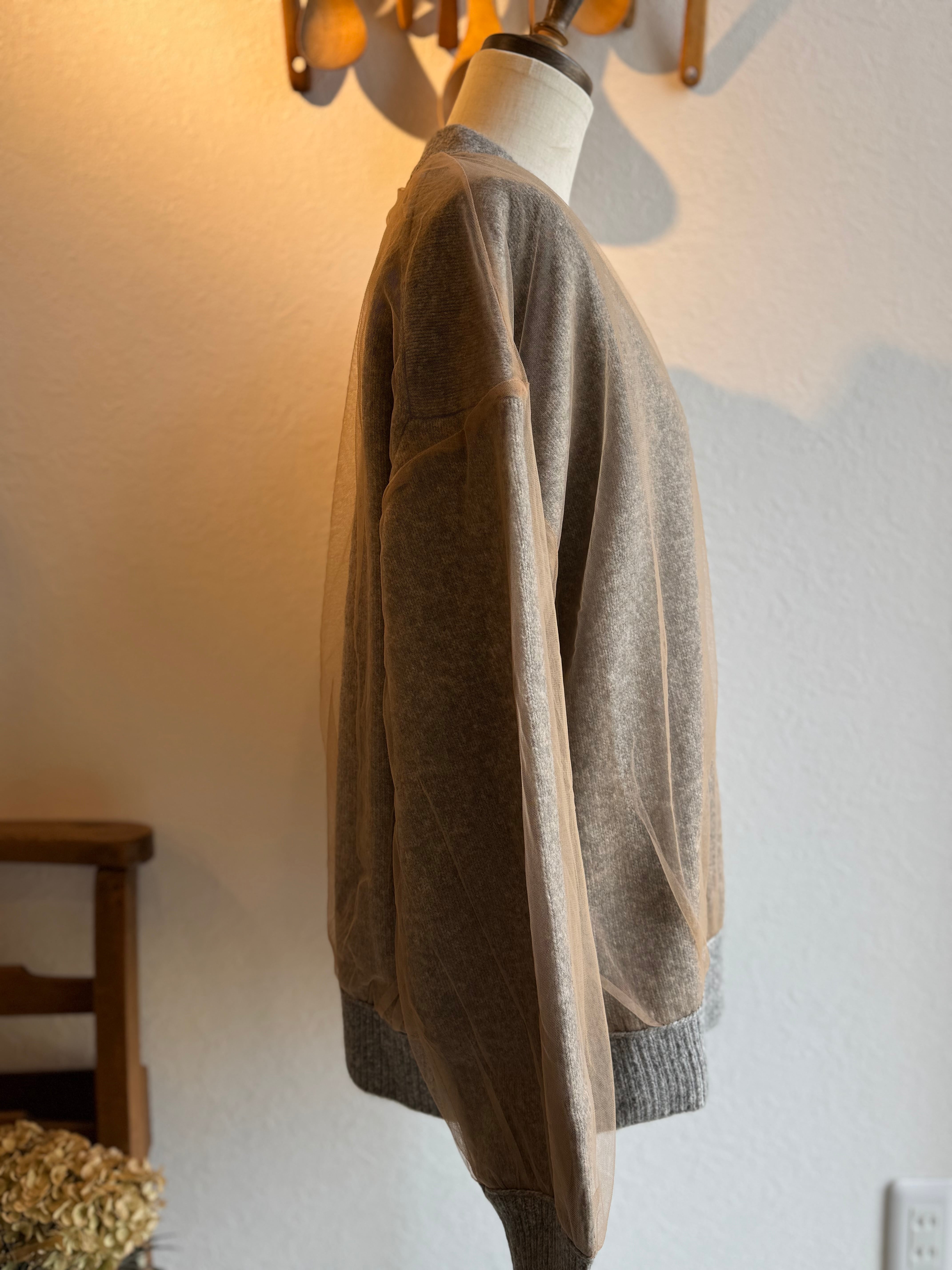 ざっくりとしたオーバーシルエットのニットカーディガンにチュールを重ねたレイヤードデザイン
