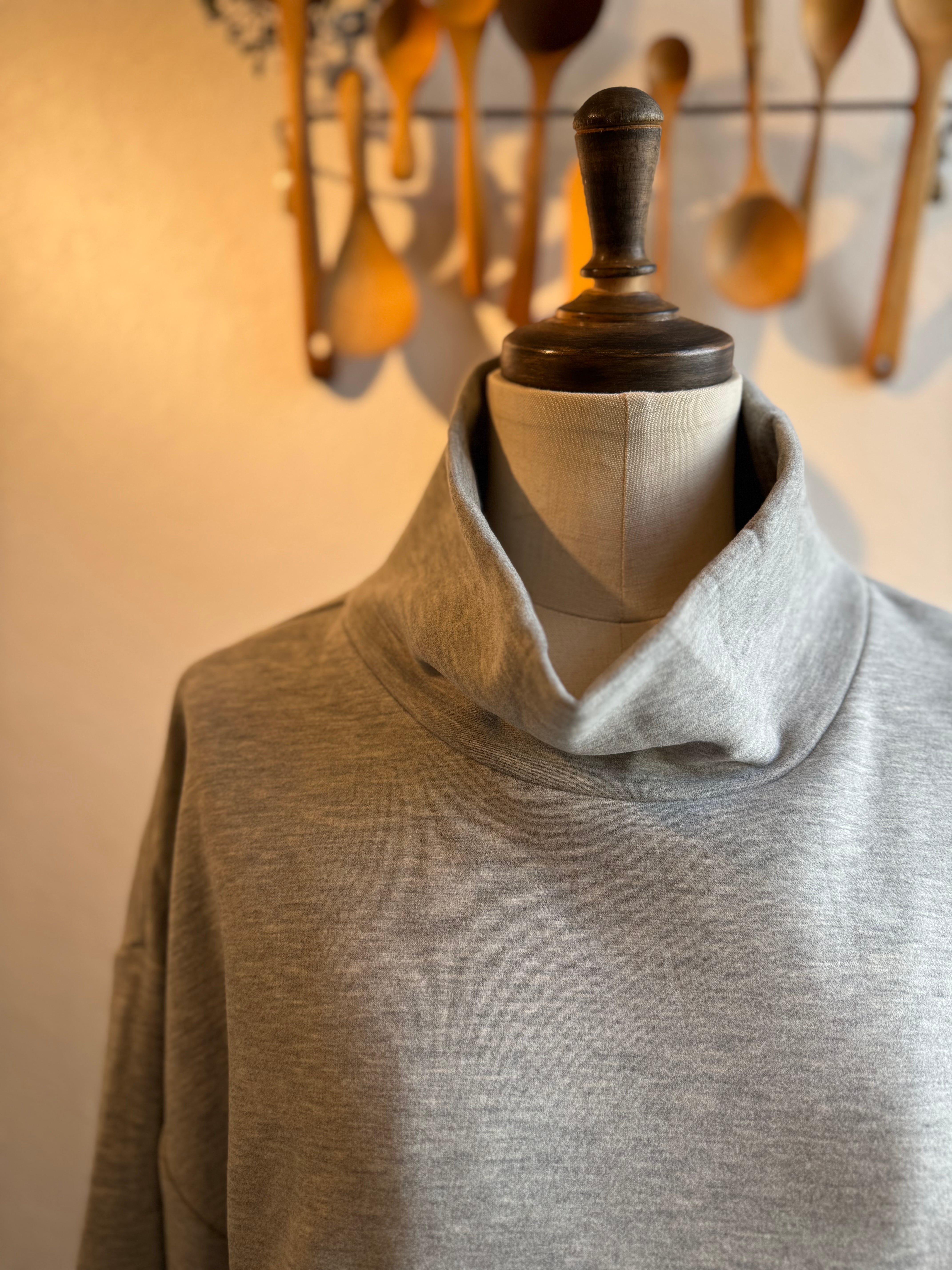 ゆるめのハイネックやギャザーでふっくらしたお袖などでシンプルすぎないシルエットに仕上がっています