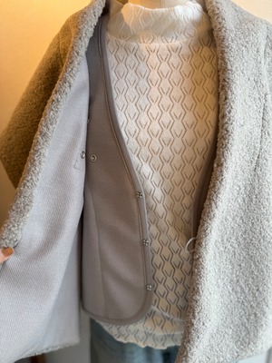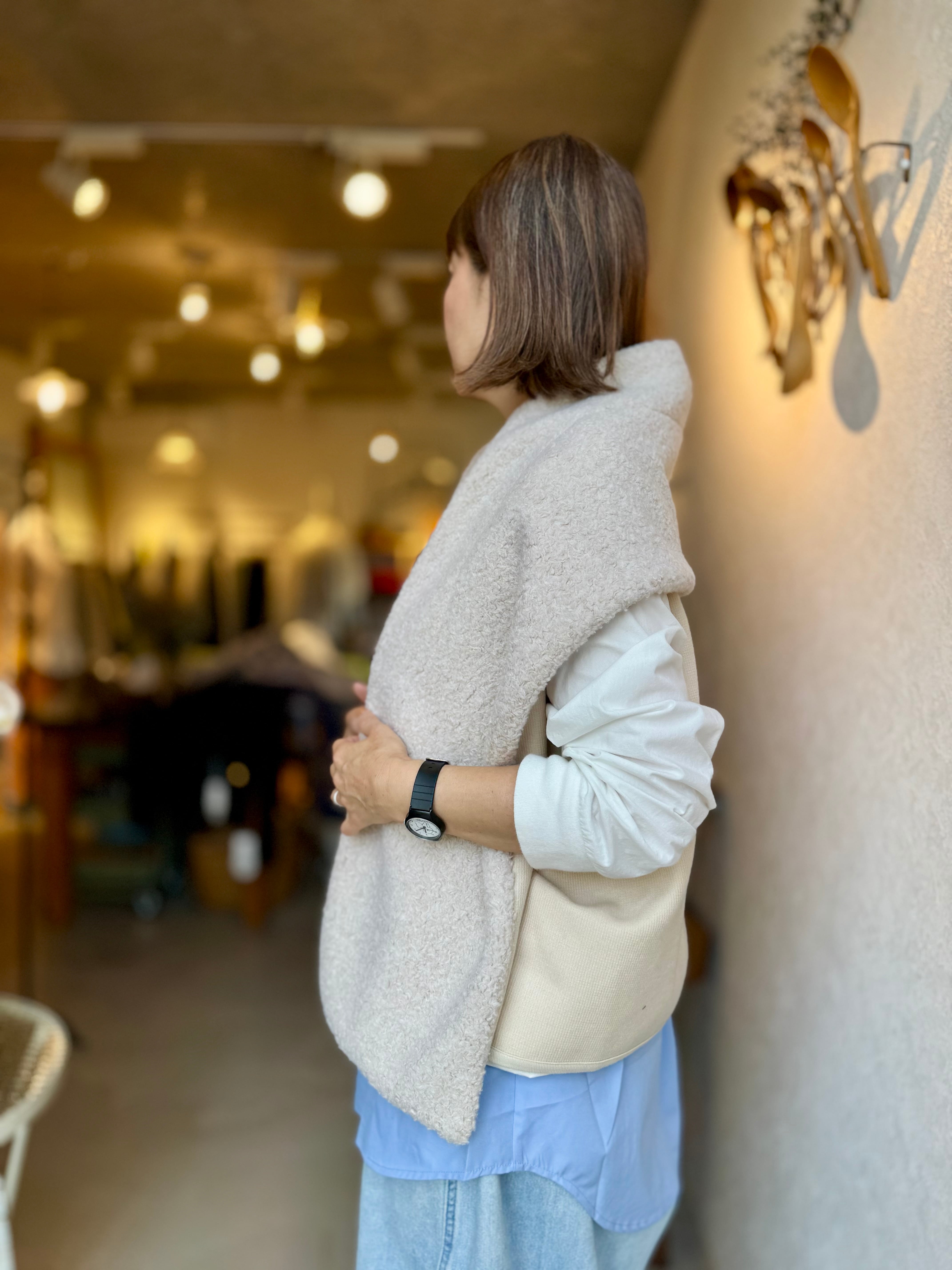 シープボアのストールとベストをボタン留めしているので動いてもズレたりせず綺麗に着られます