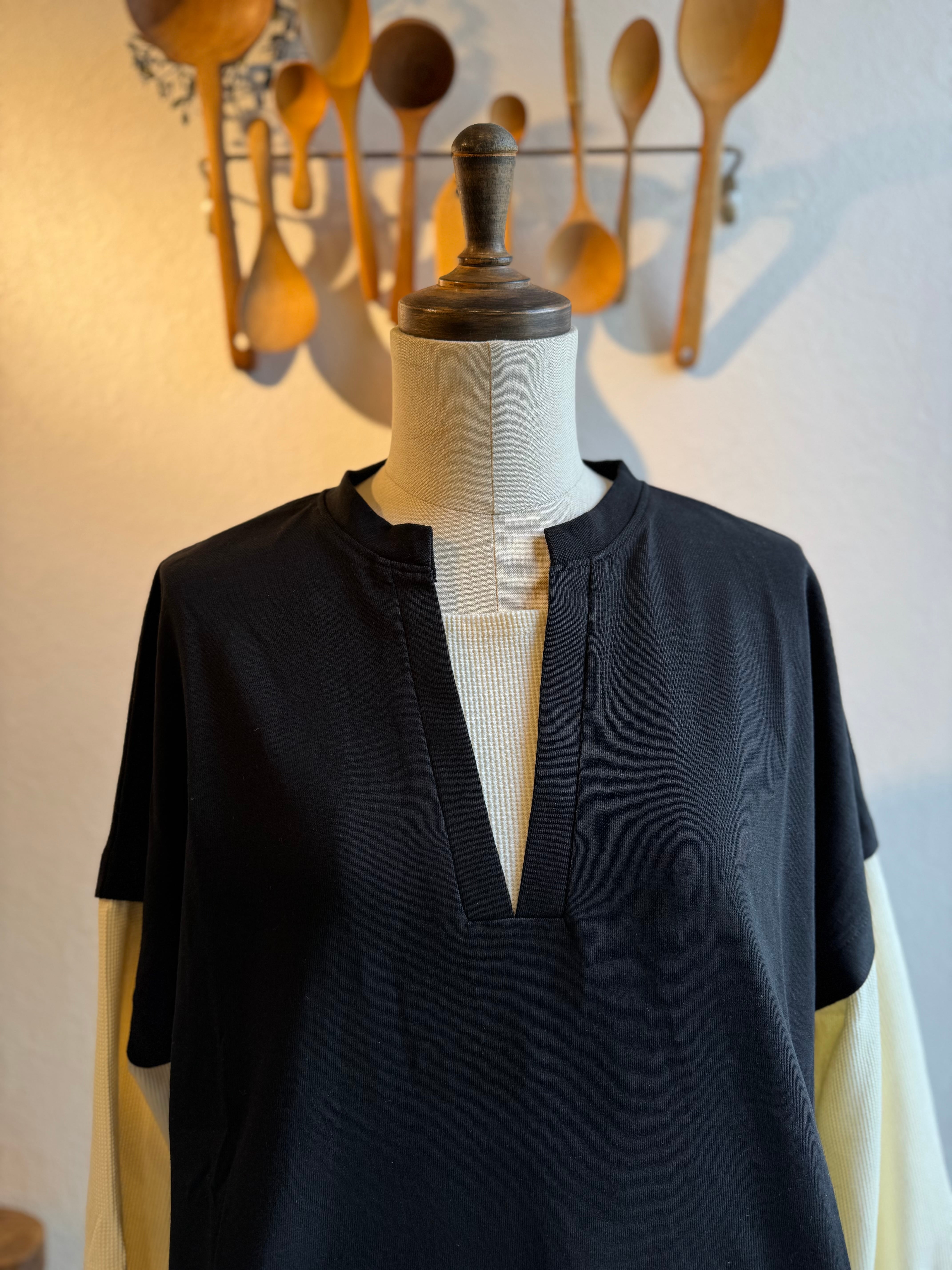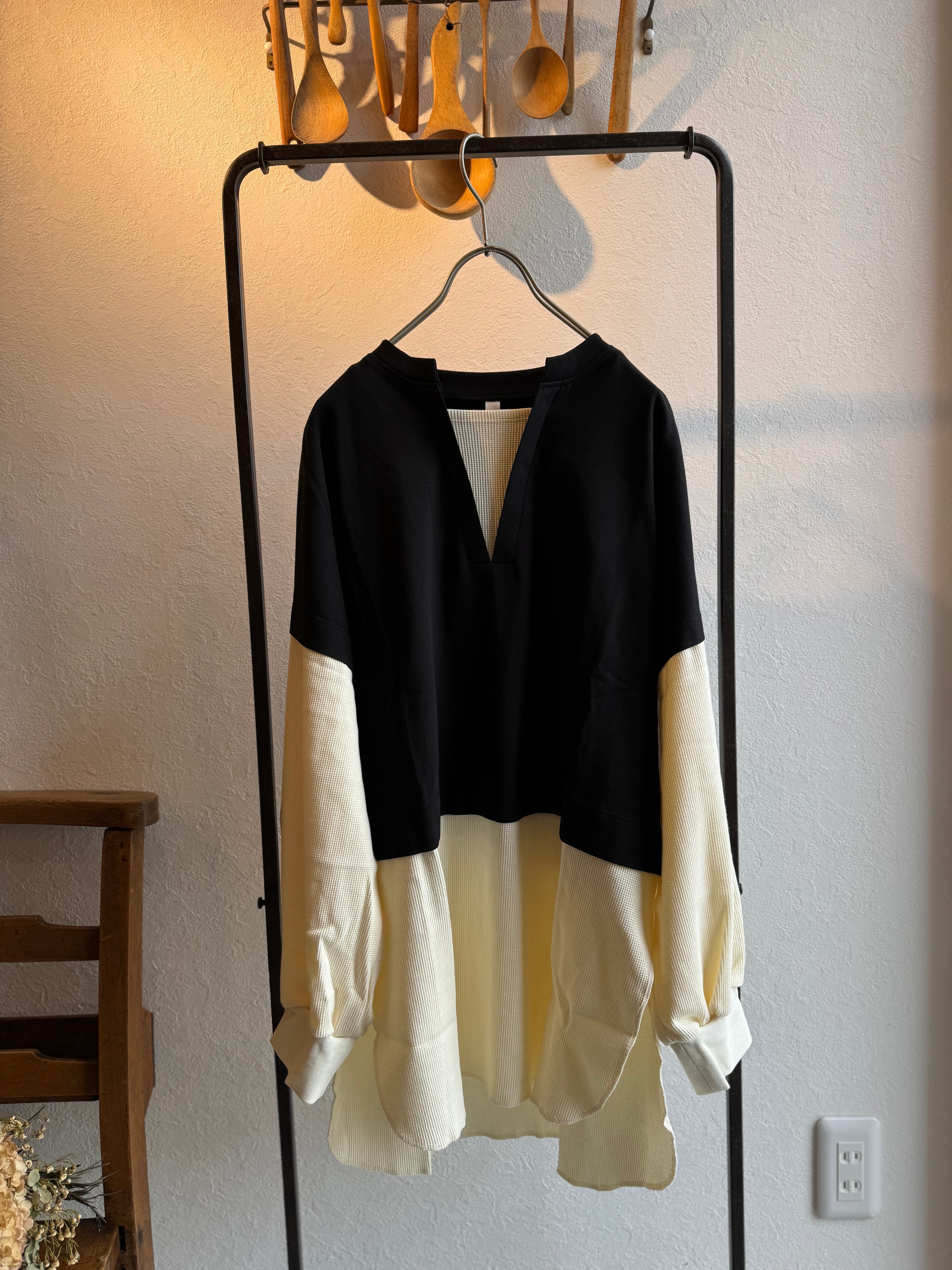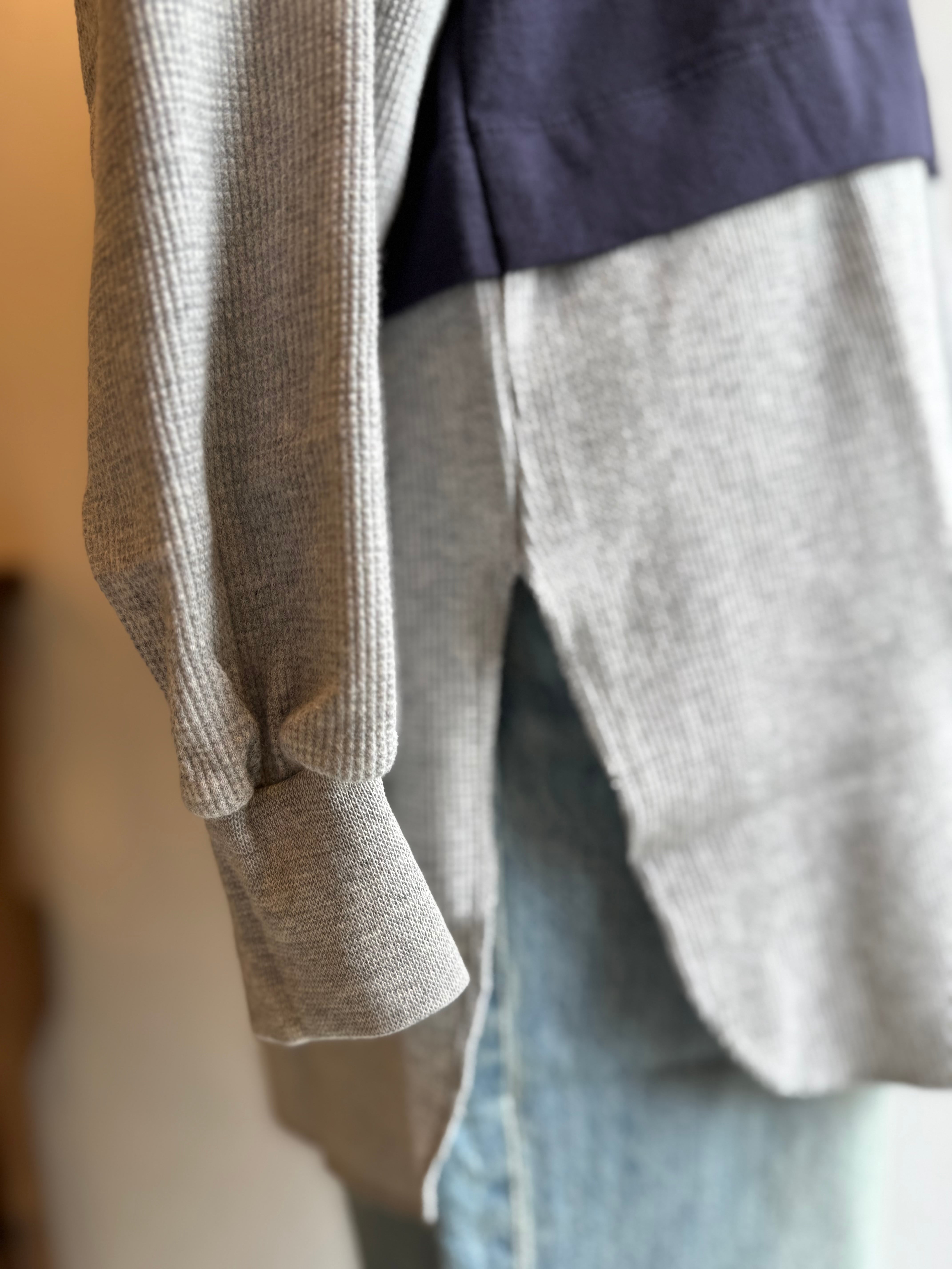 Vネックの中にもワッフルが切り替えてあり、1枚でレイヤードスタイルが完成しています!
