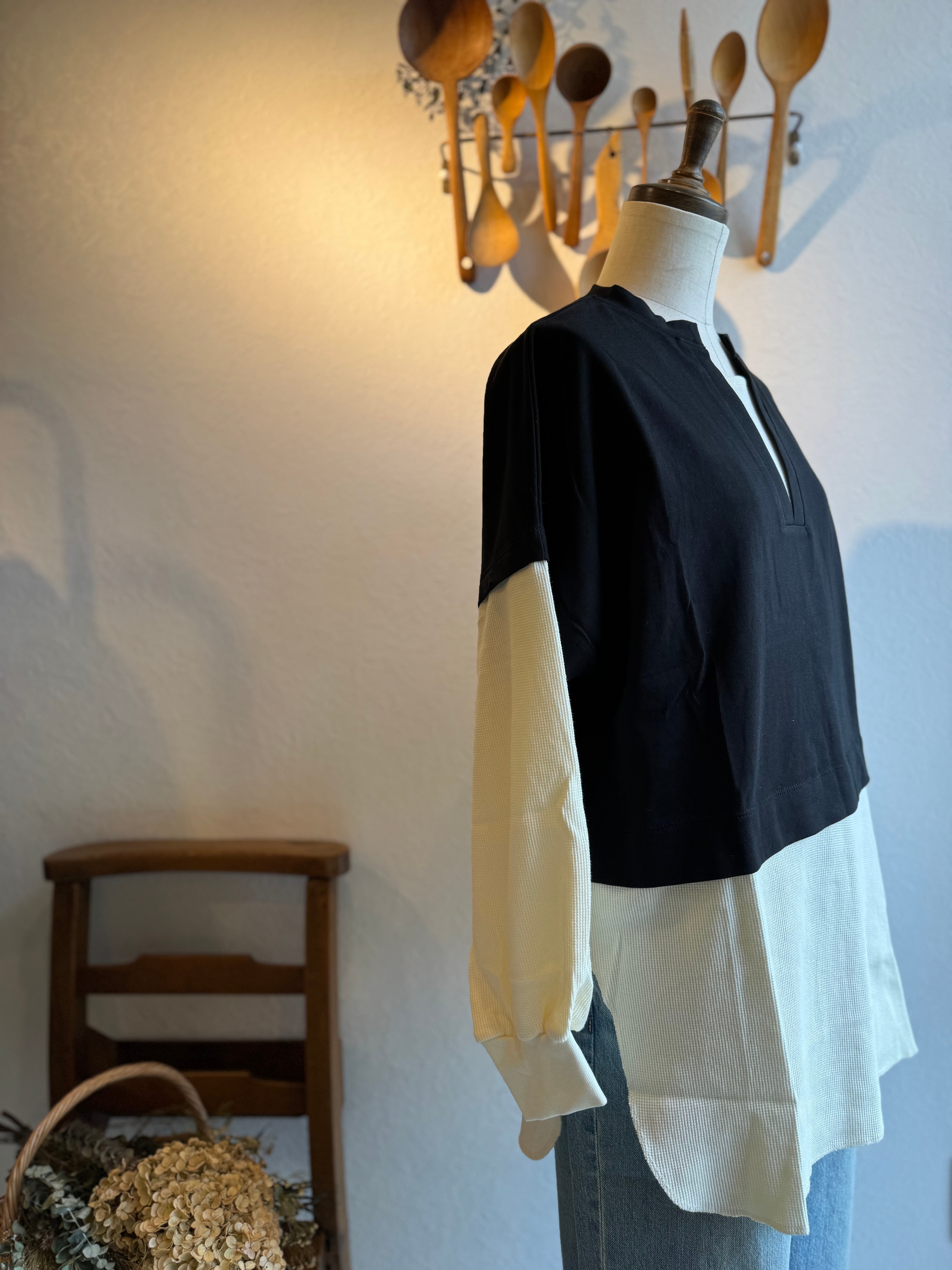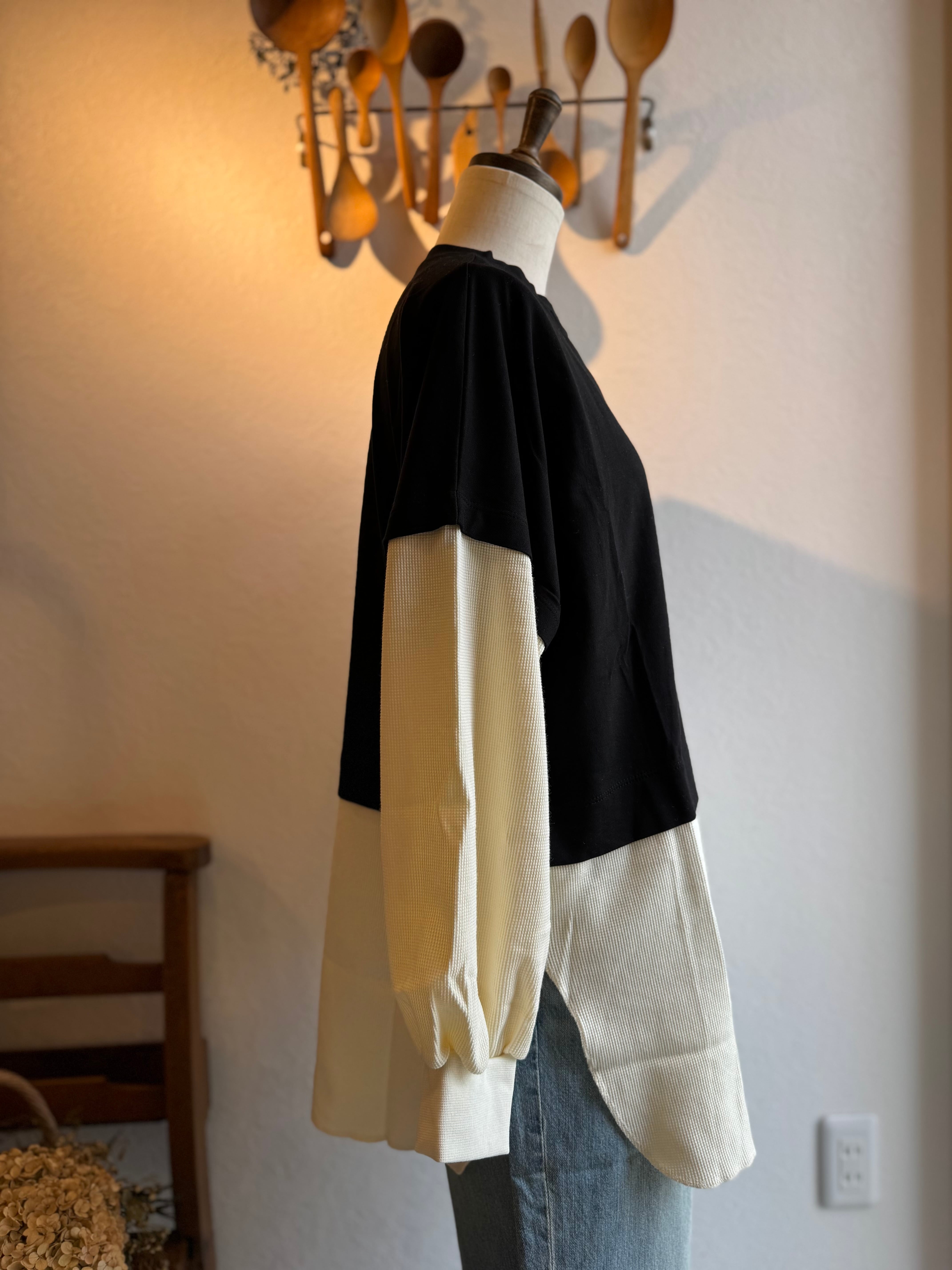 身ごろはしっかりめのカットソー素材、袖と裾がワッフル素材になっています