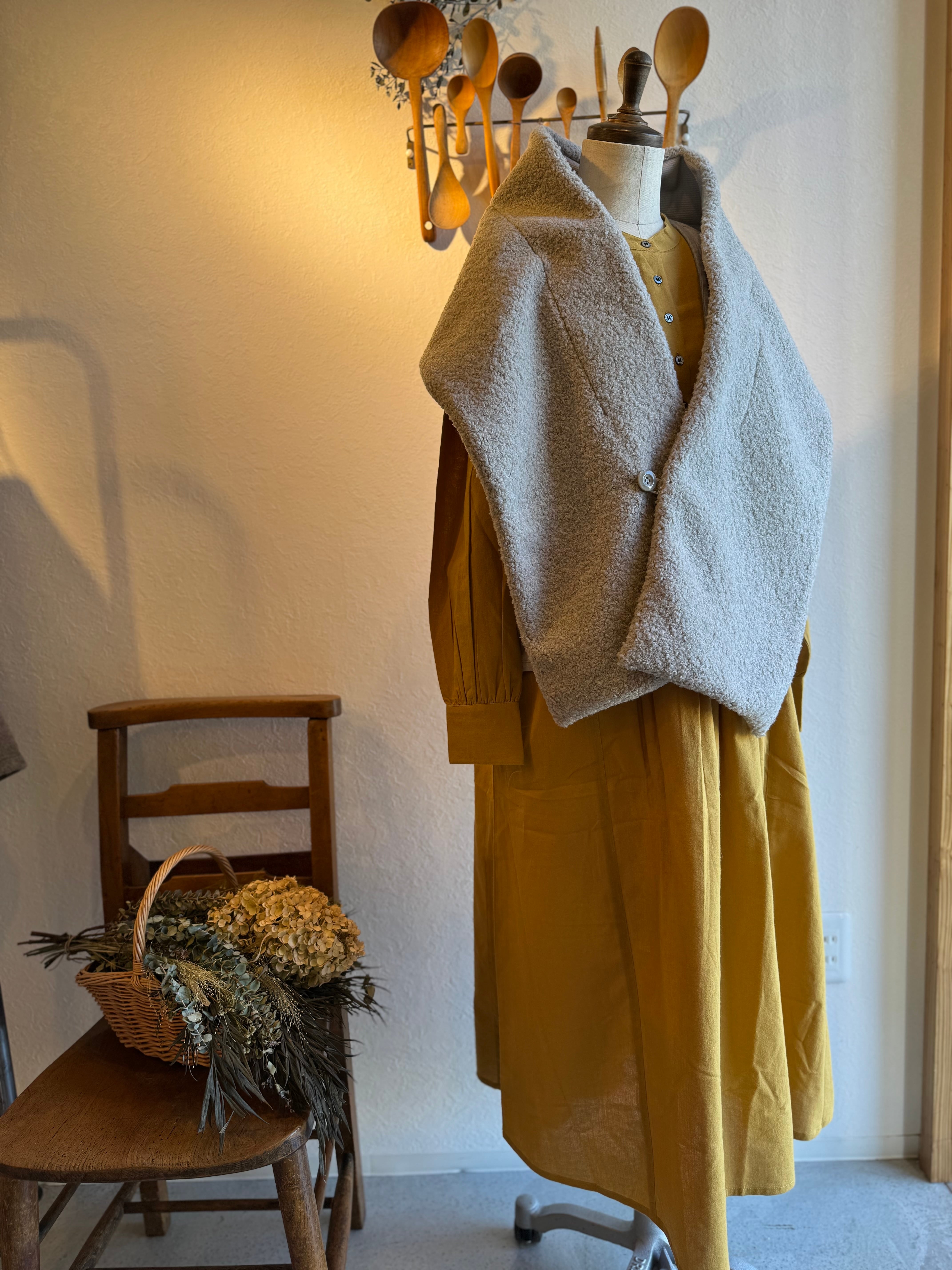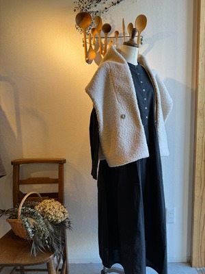 たっぷりしたストール付きベストを大人っぽく合わせたり、鹿の子編みサンカクストールを合わせてささっとお出かけもおすすめです!