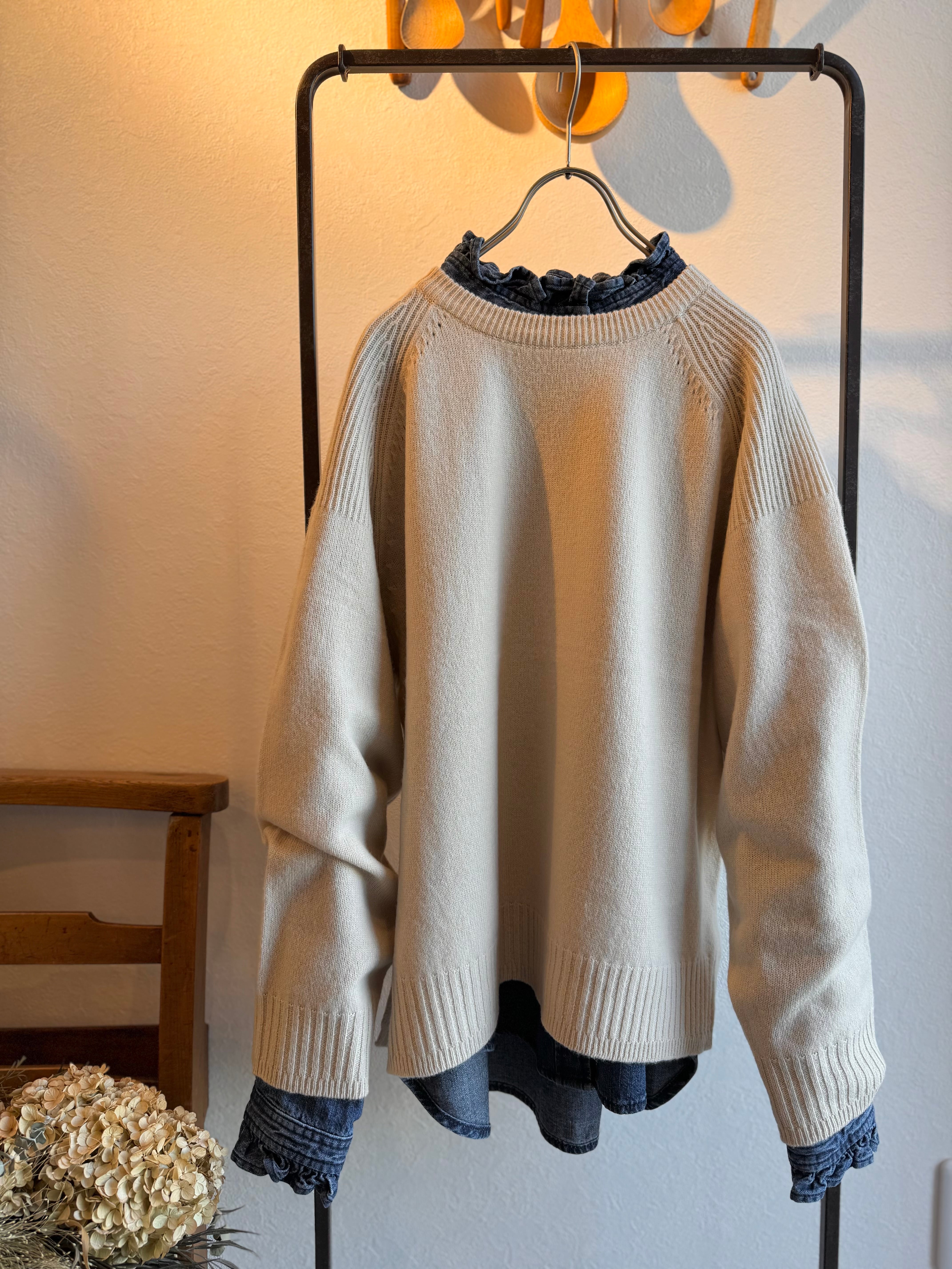 カジュアルなデニム素材のシャツにフリルカラーを合わせました。