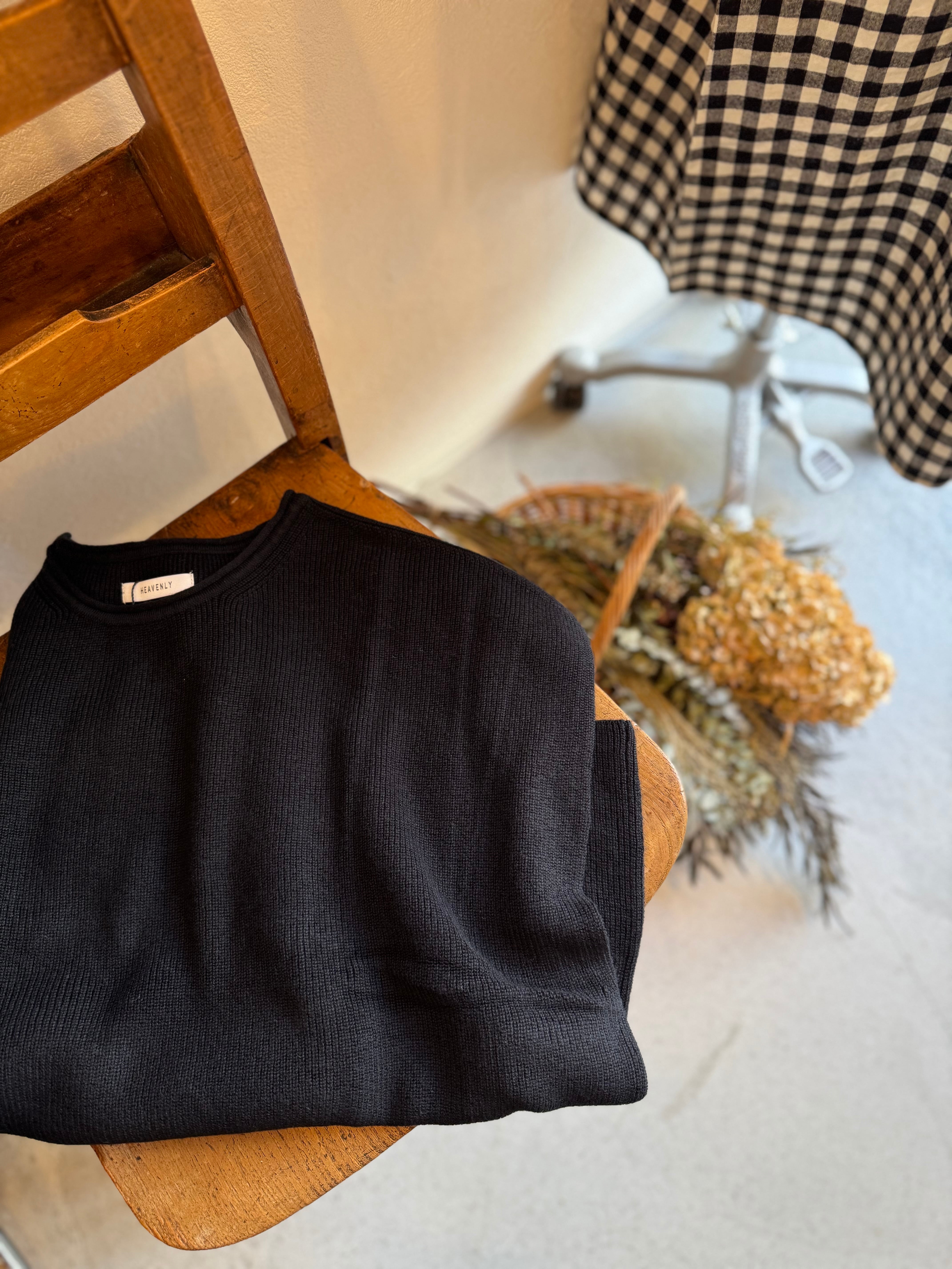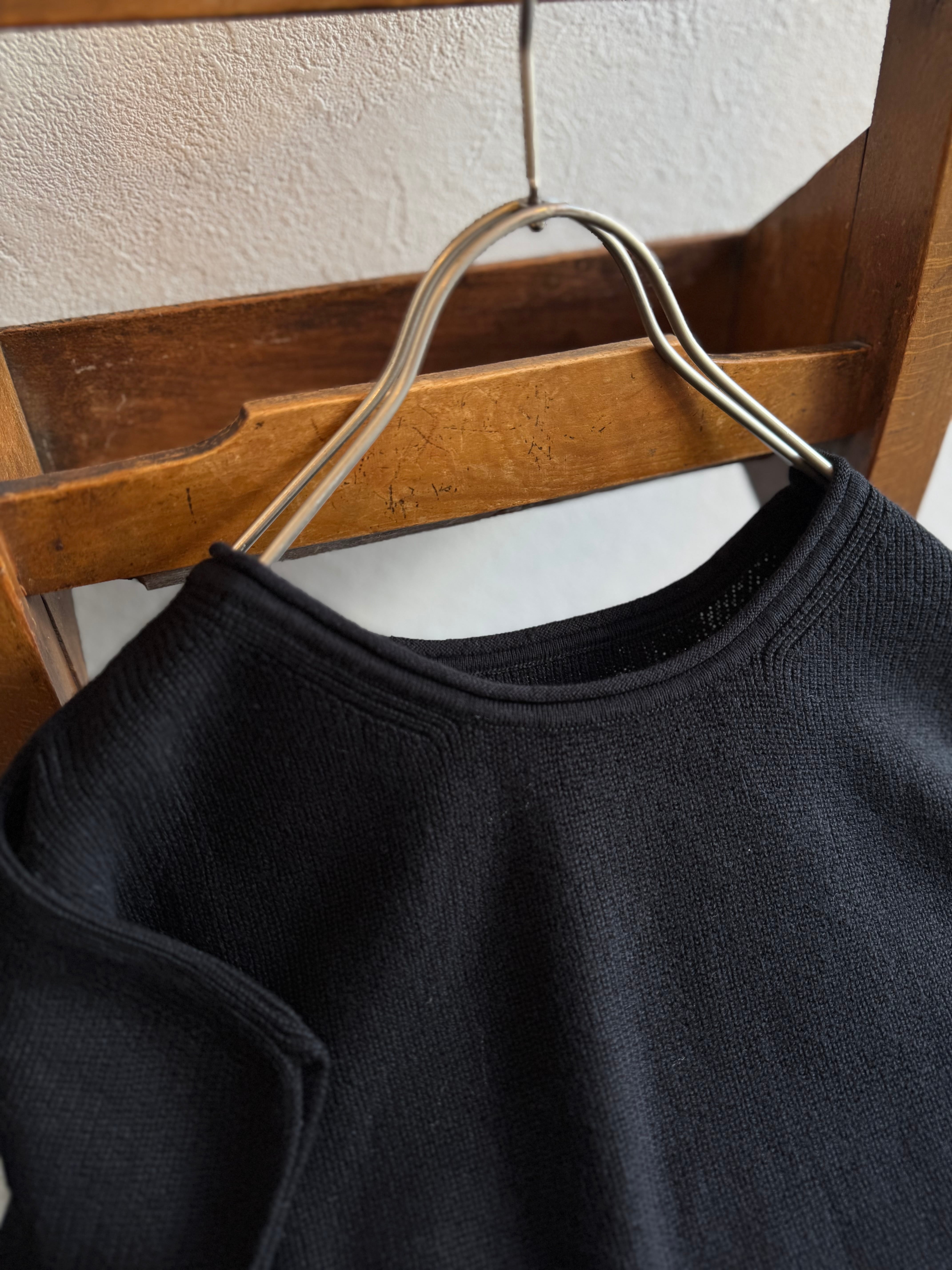 袖やすそにはリブなどを付けず編み地のままシンプルに仕上げています