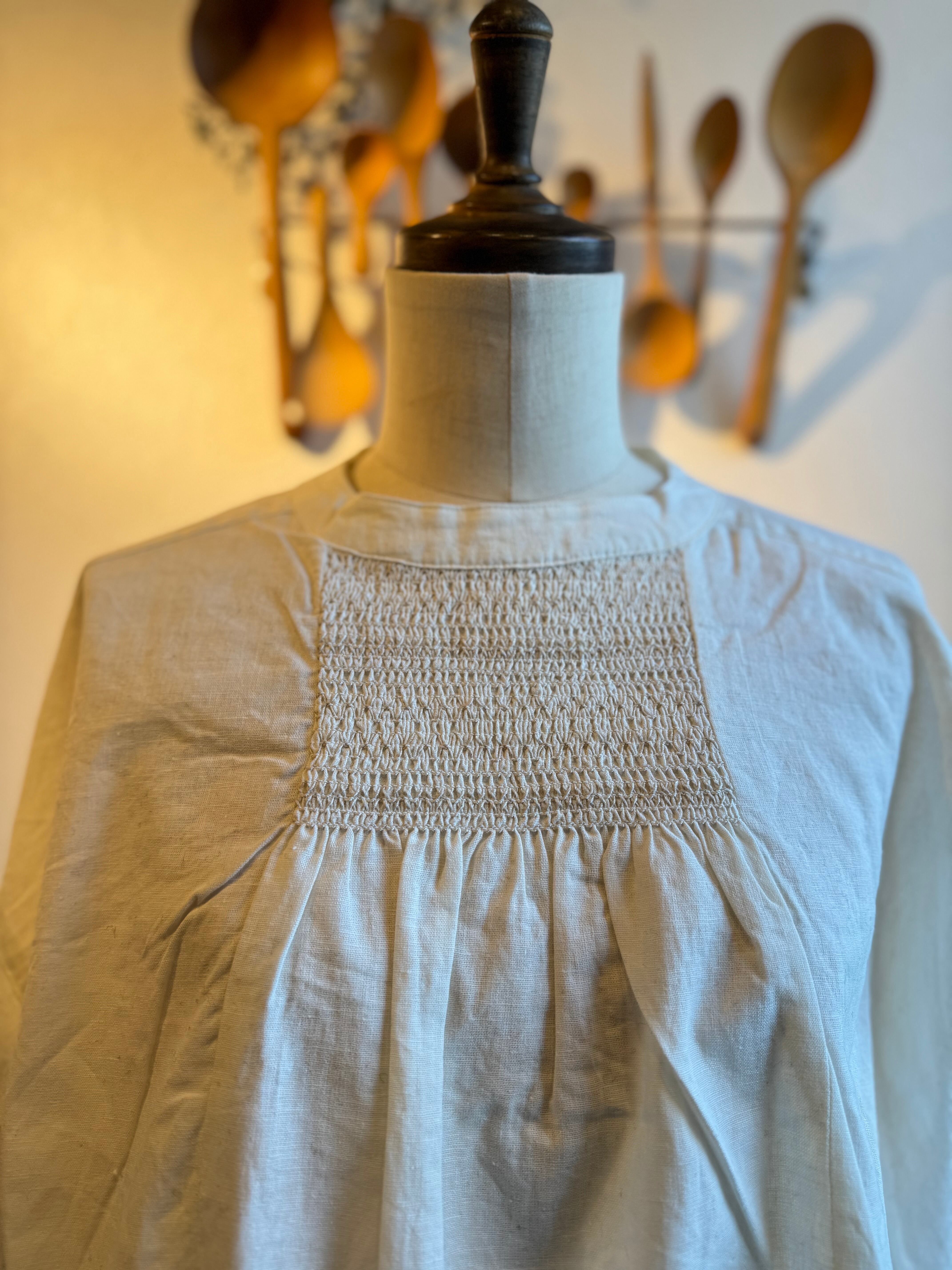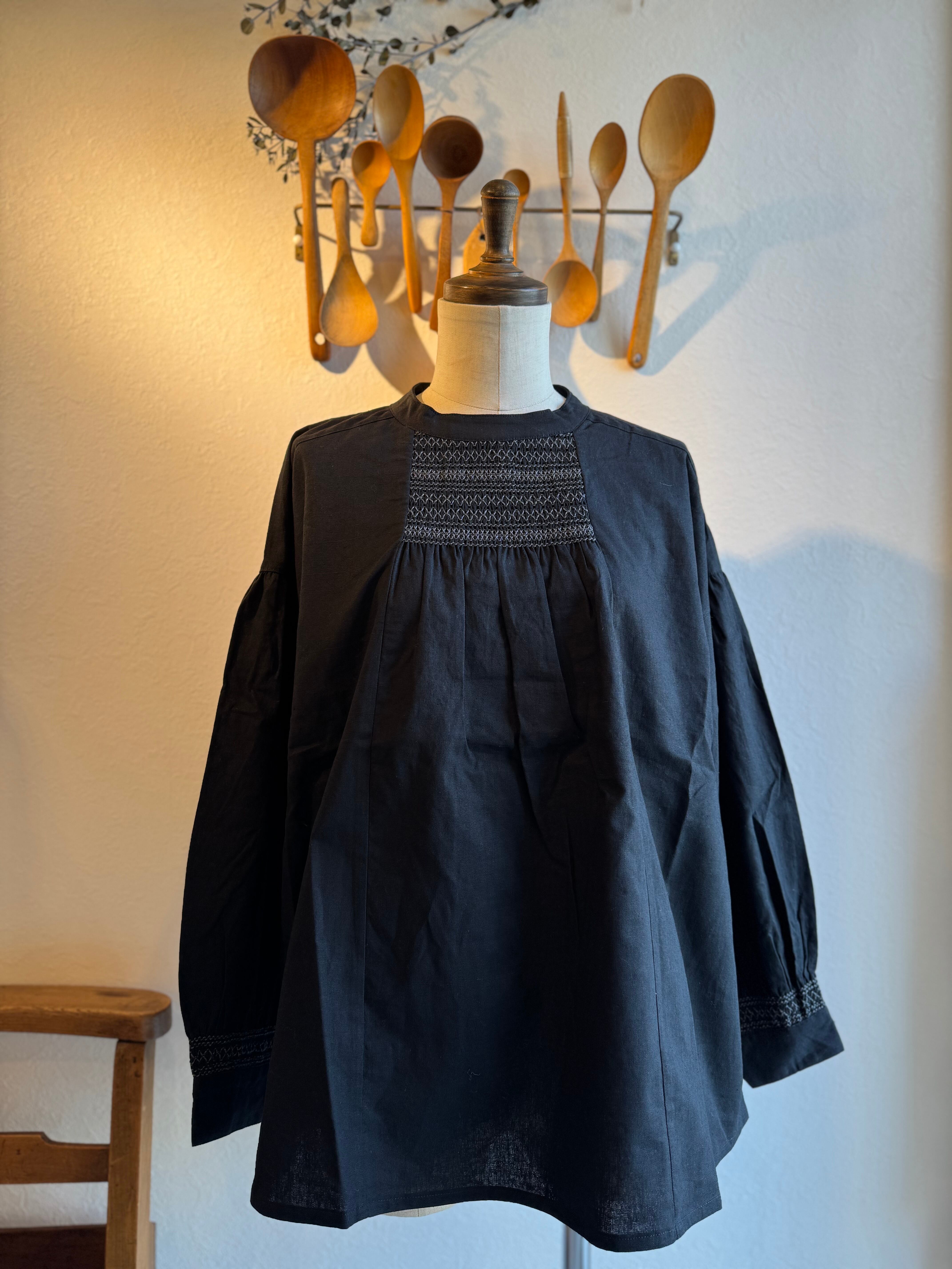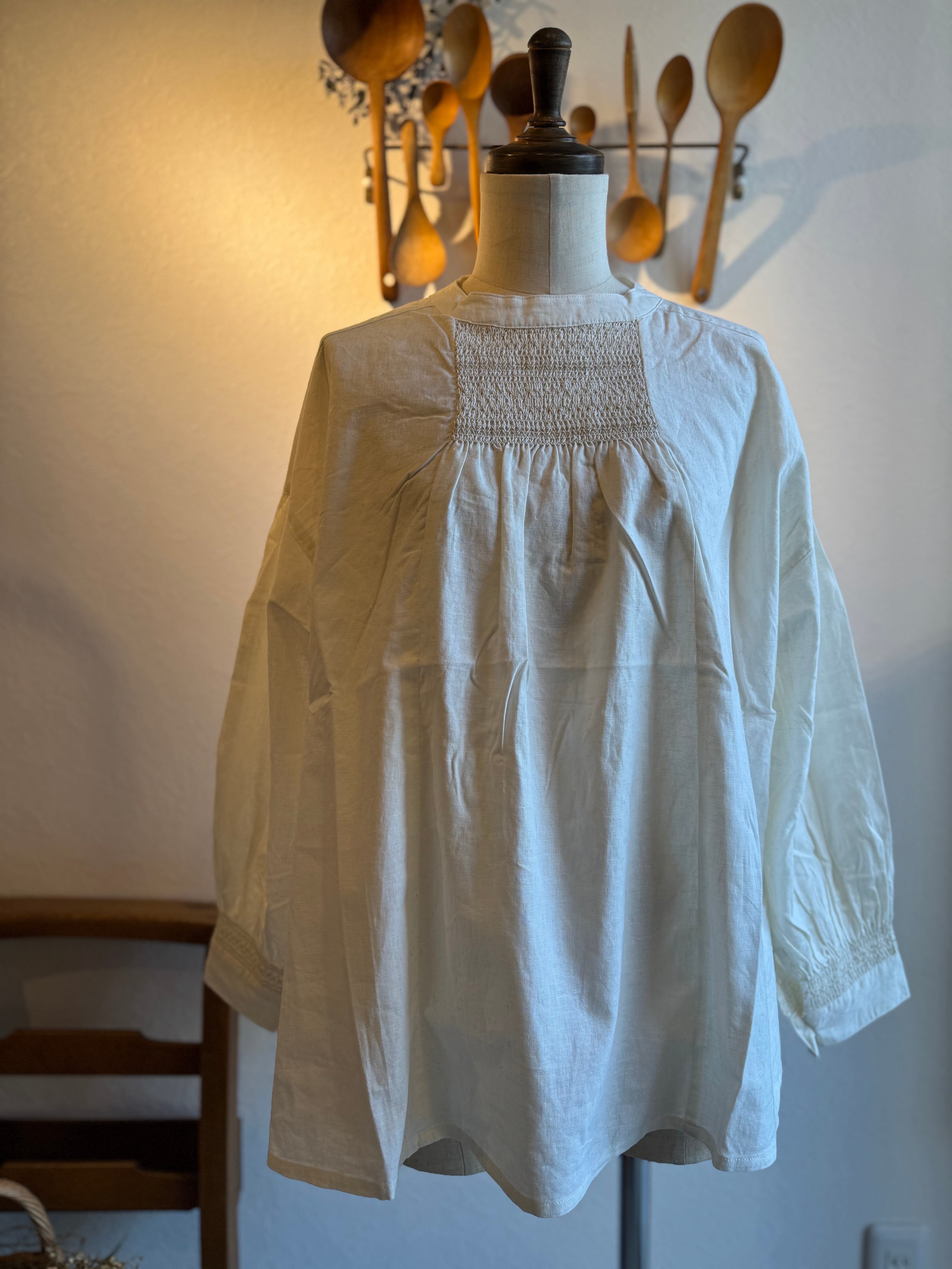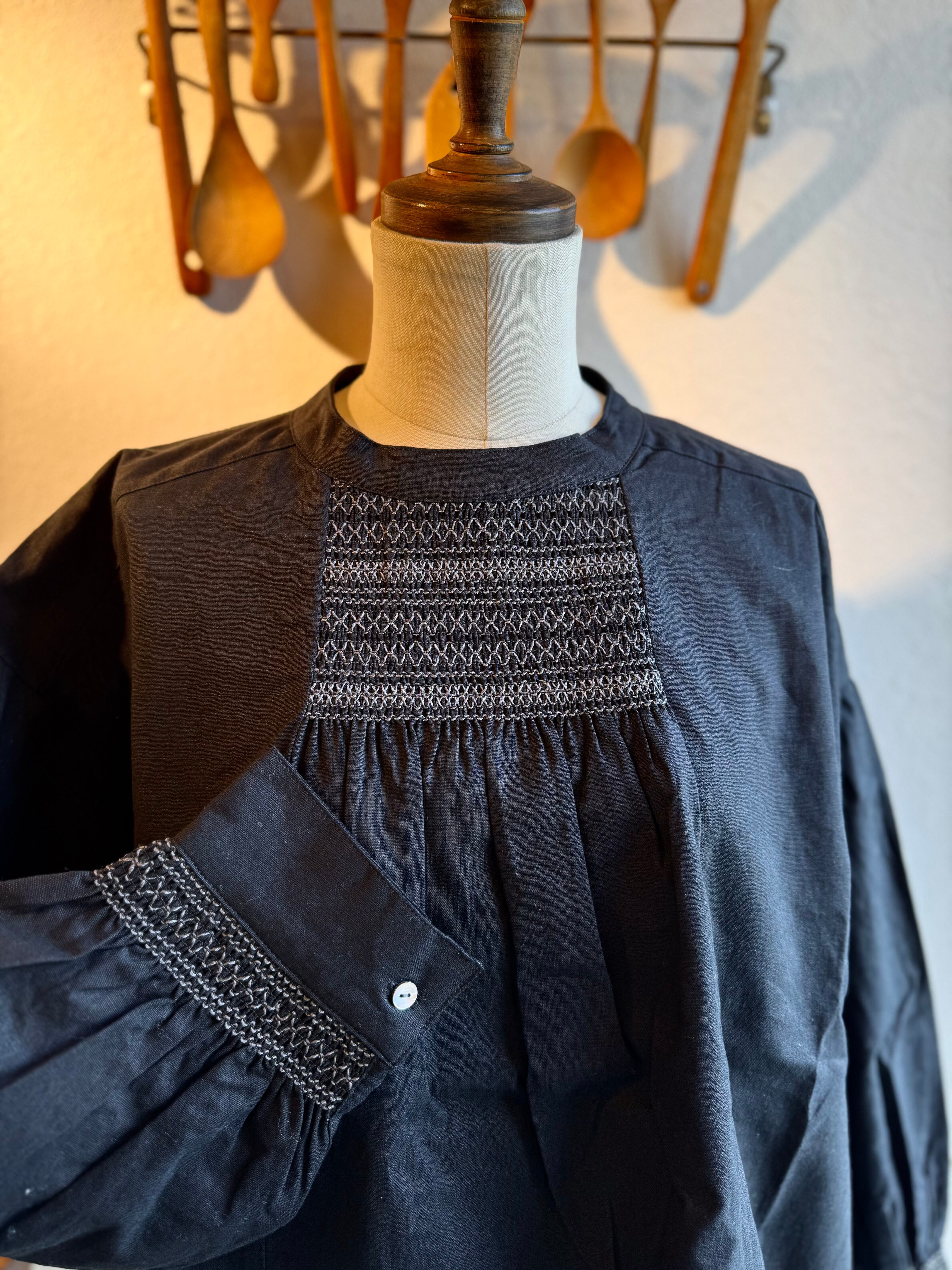 胸もとと袖口にたっぷりとスモッキングの刺繍を施したブラウスです