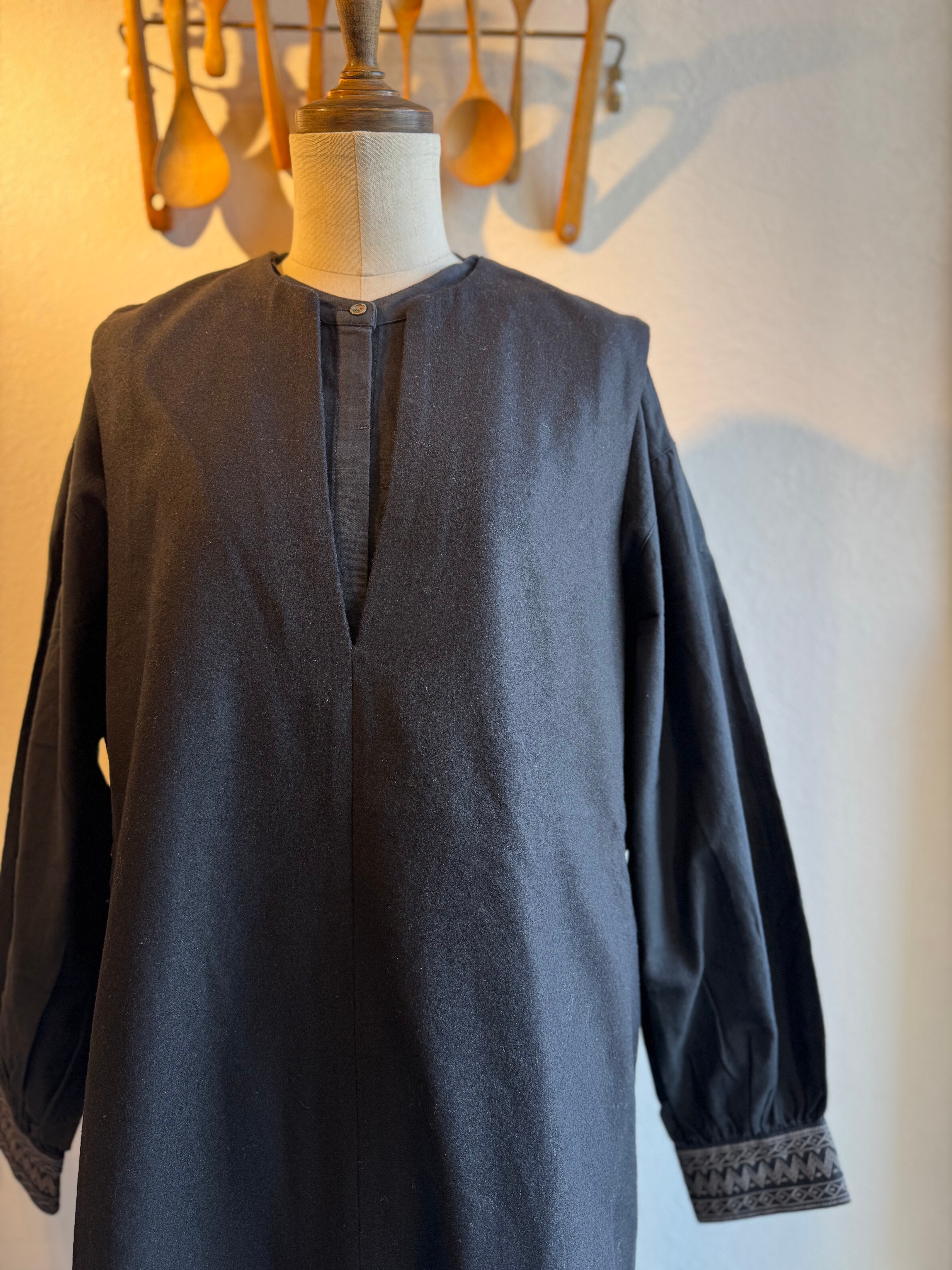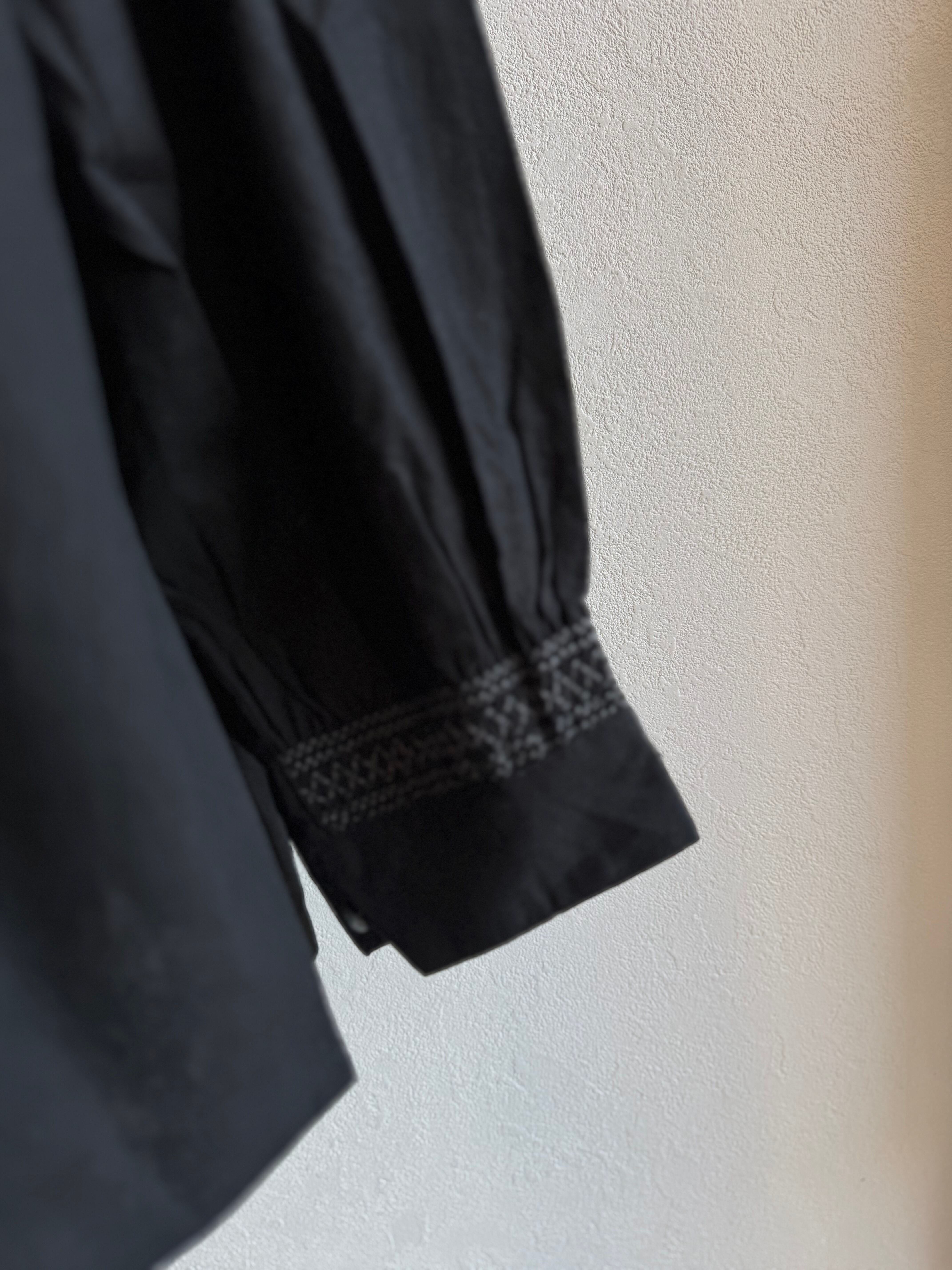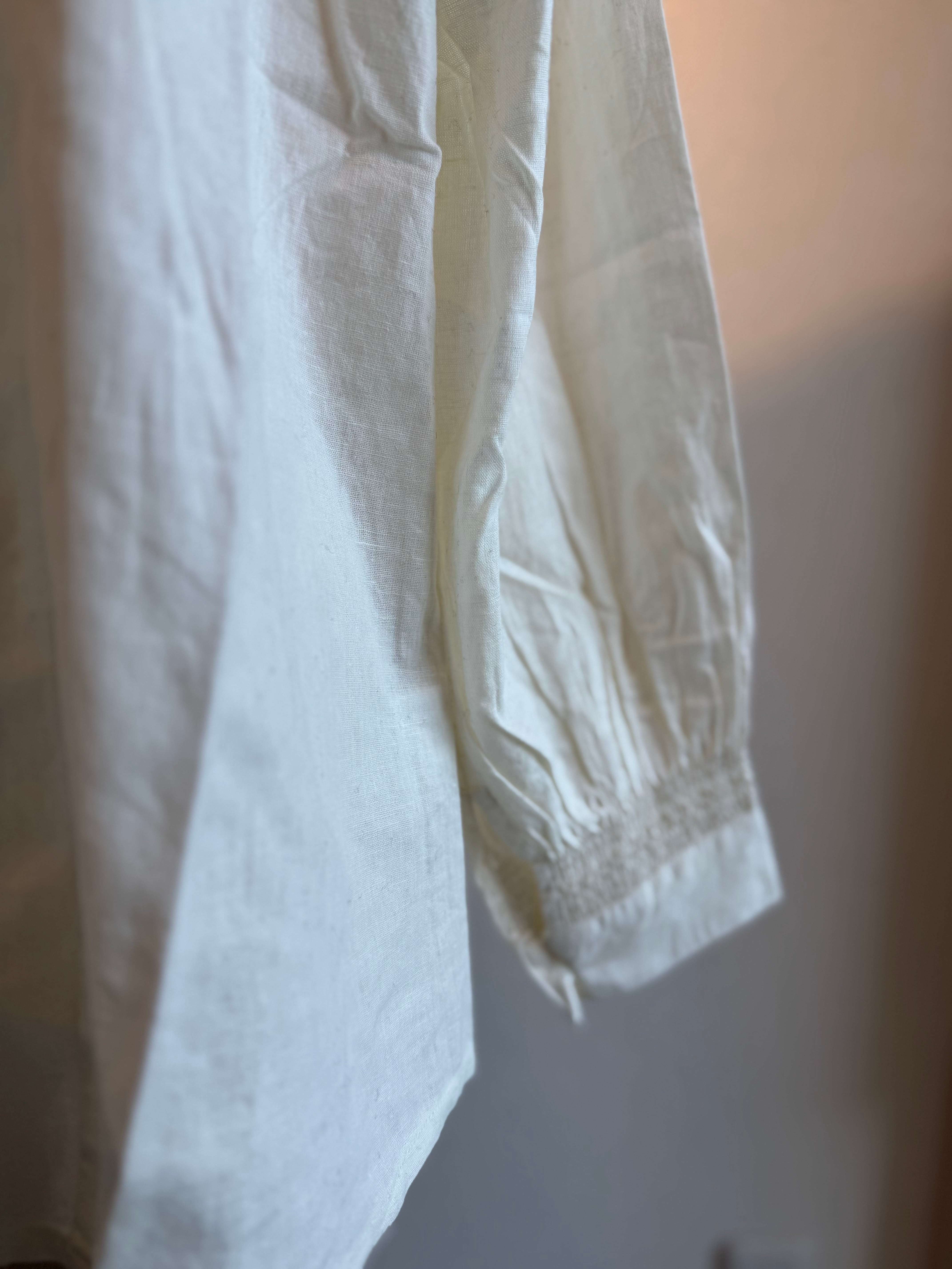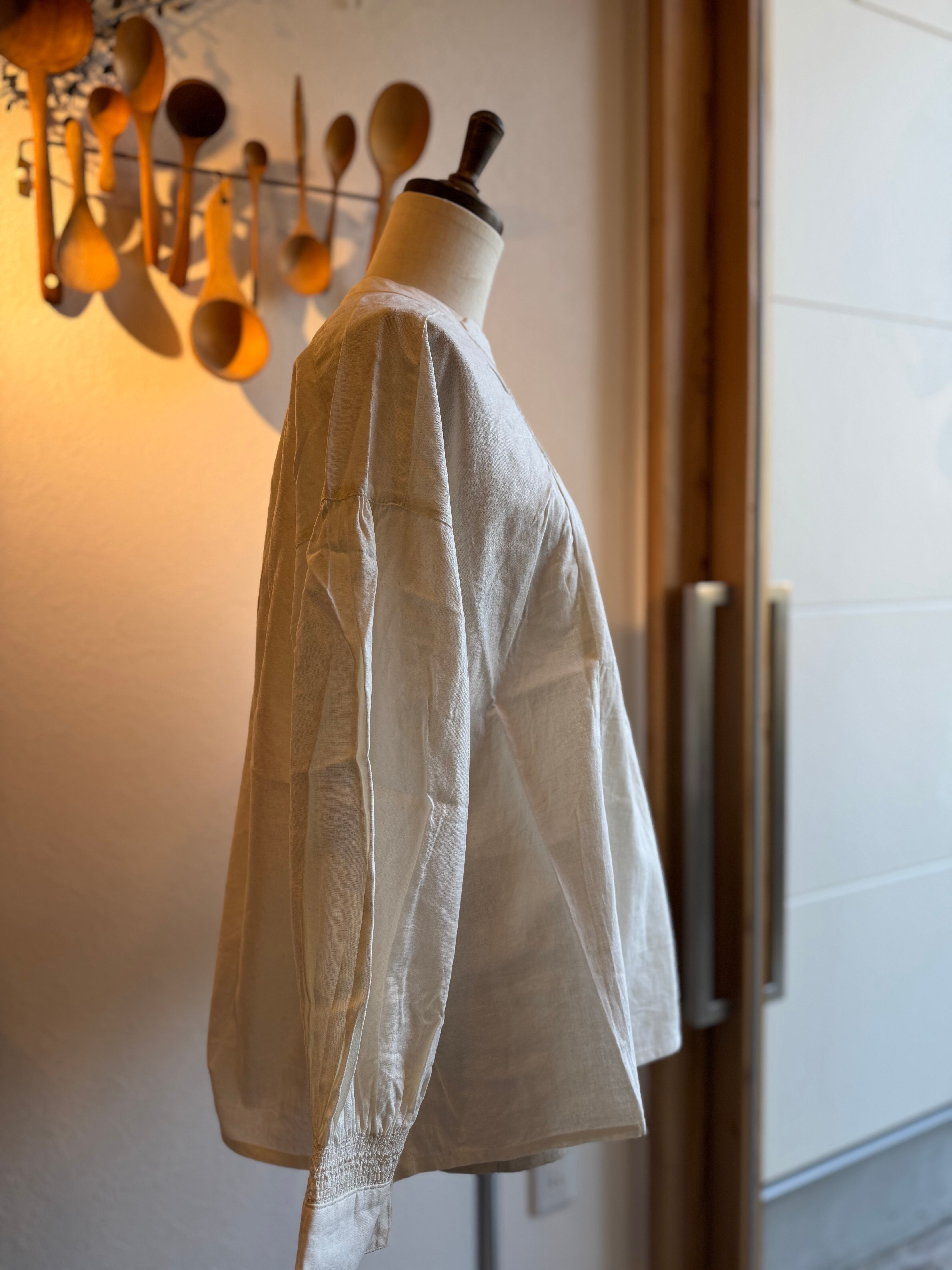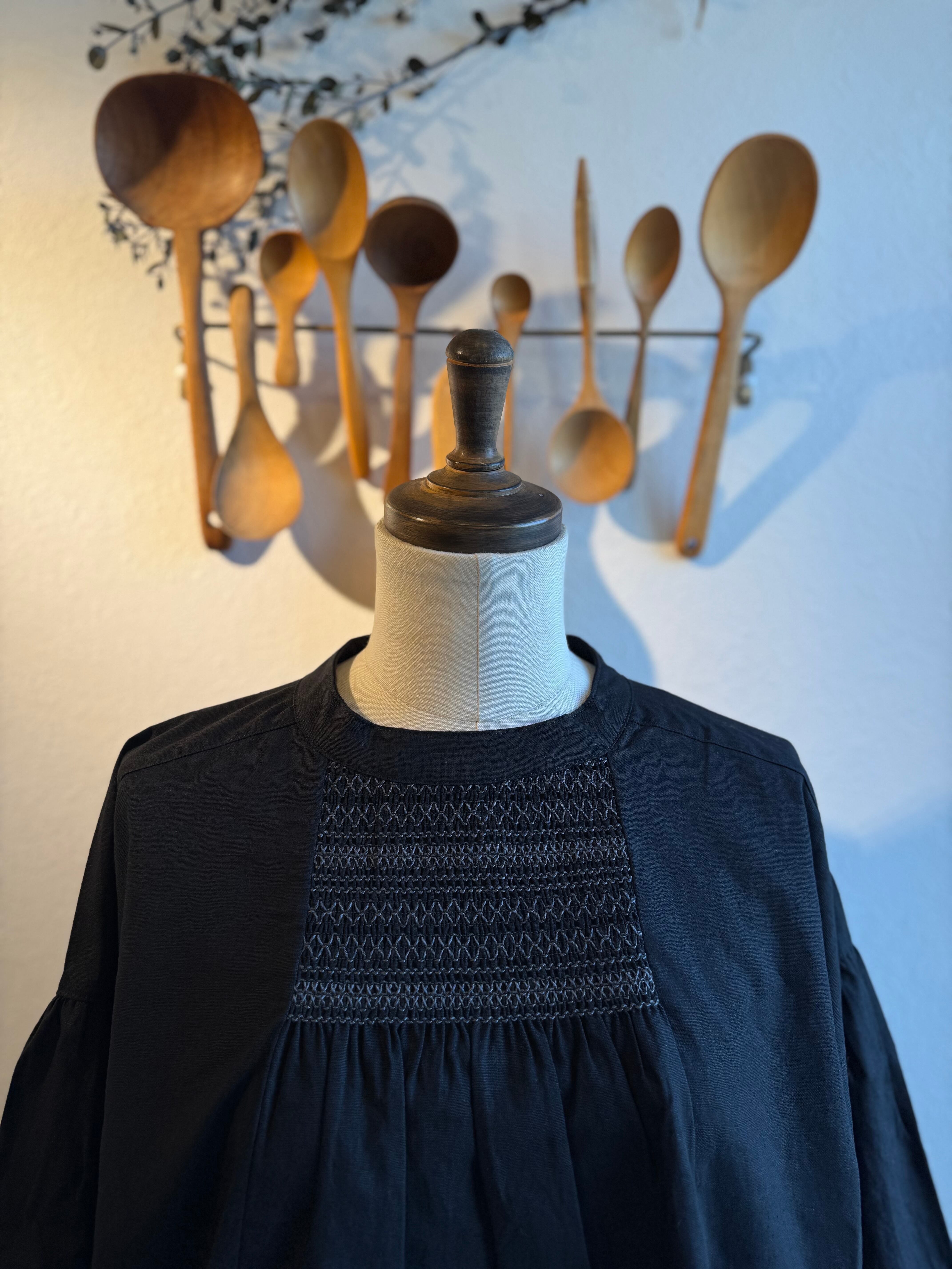 胸もとと袖口にたっぷりとスモッキングの刺繍を施したブラウスです