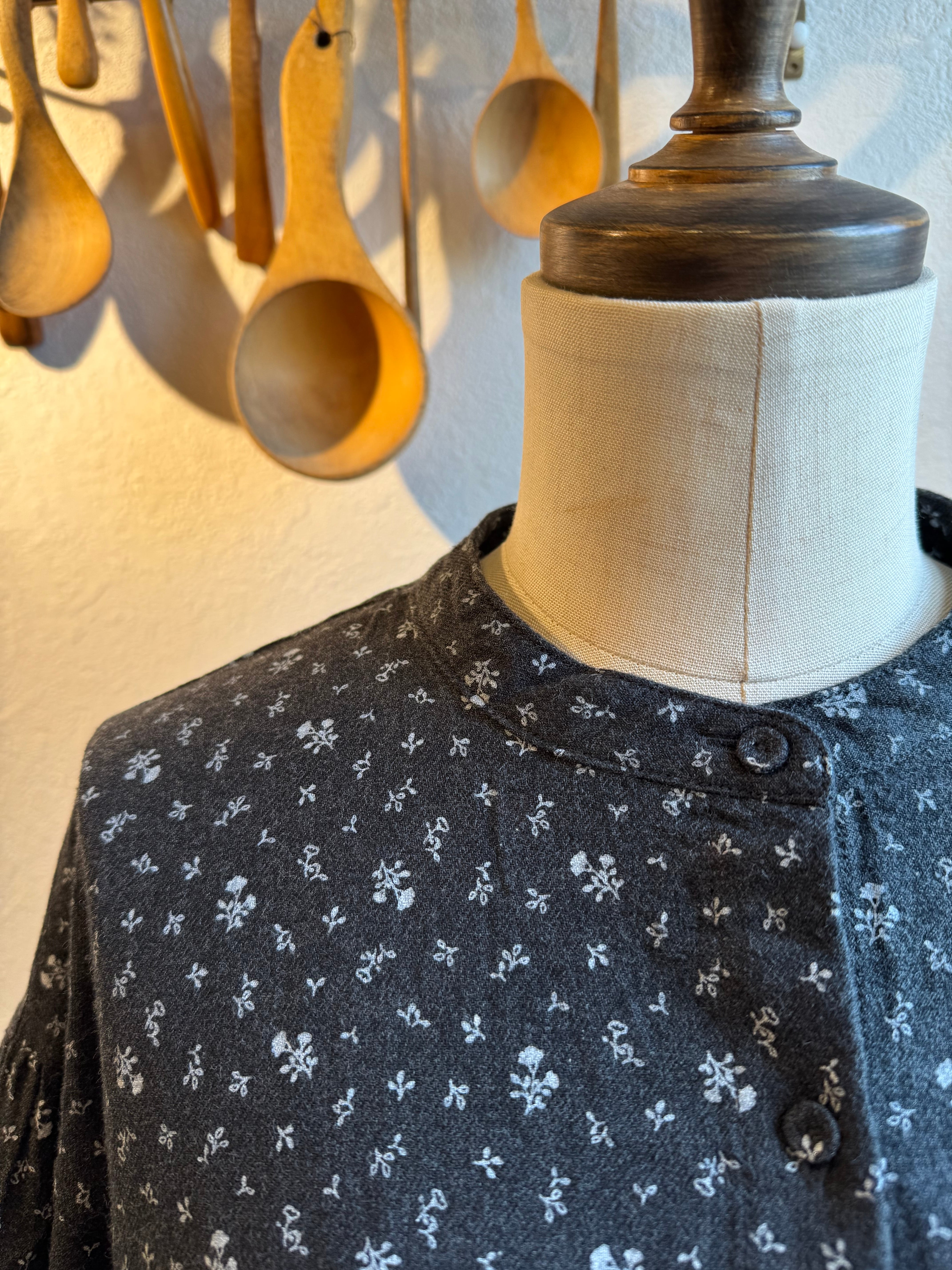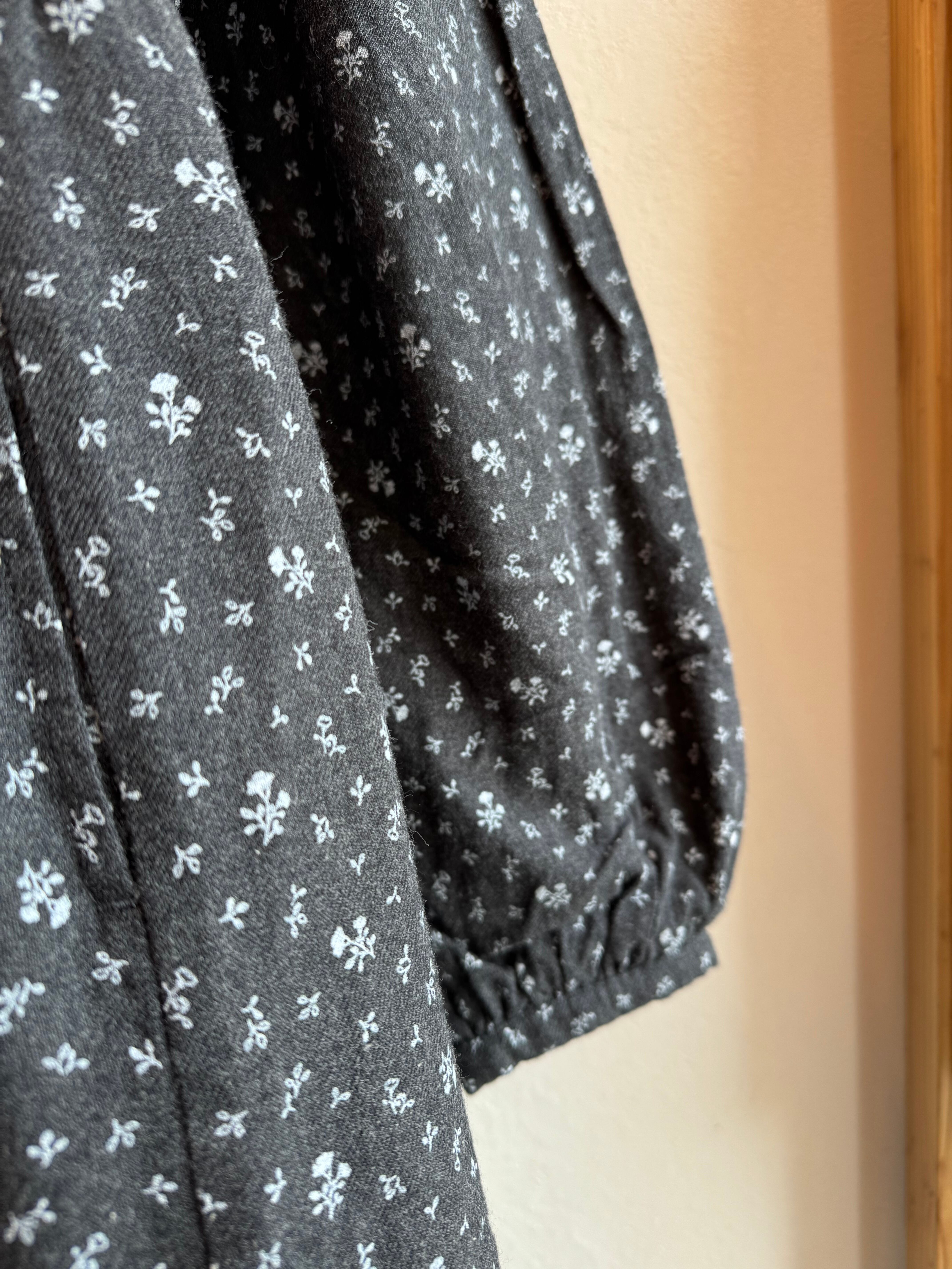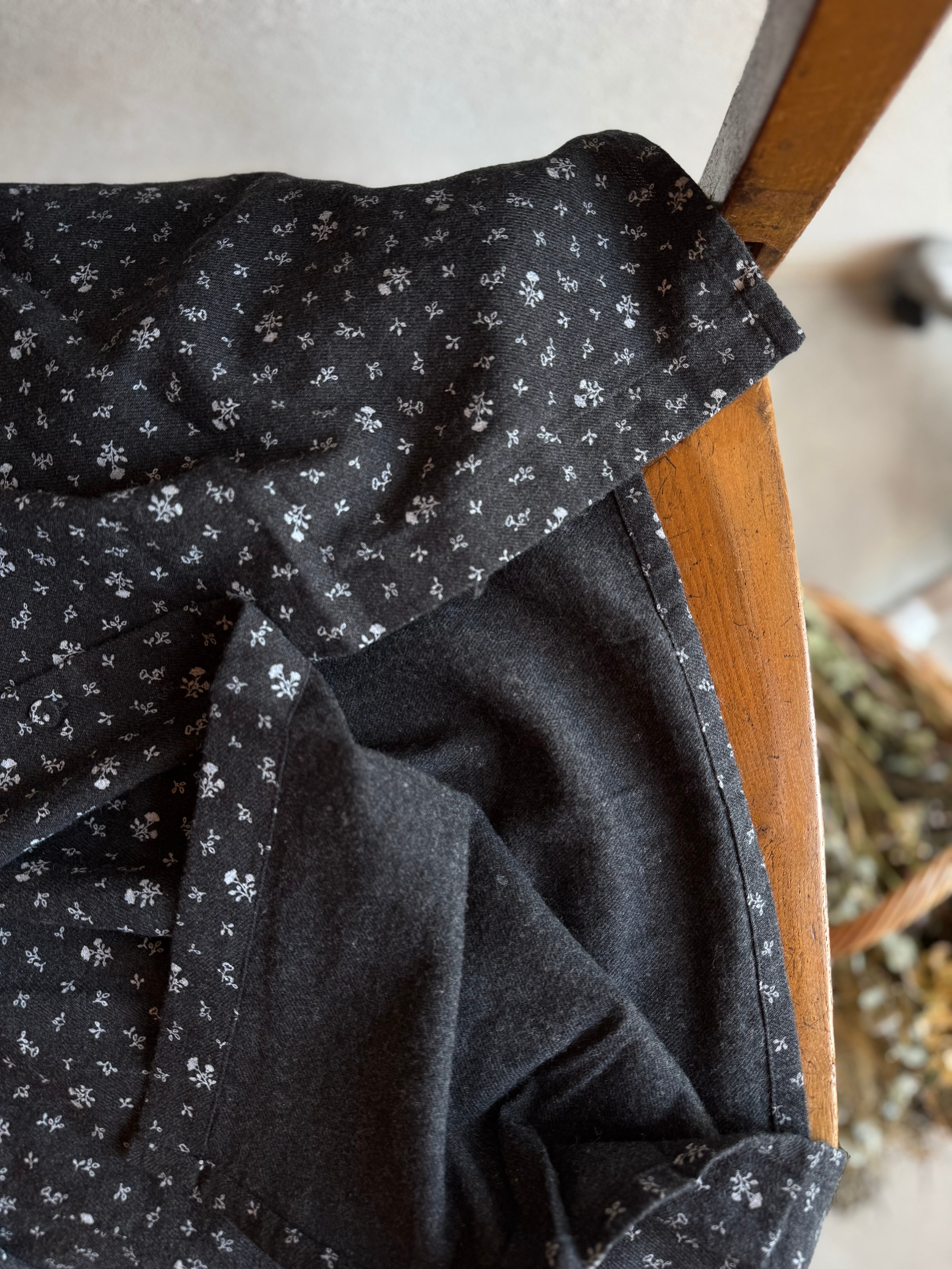 チャコールにシロで花柄がプリントされています