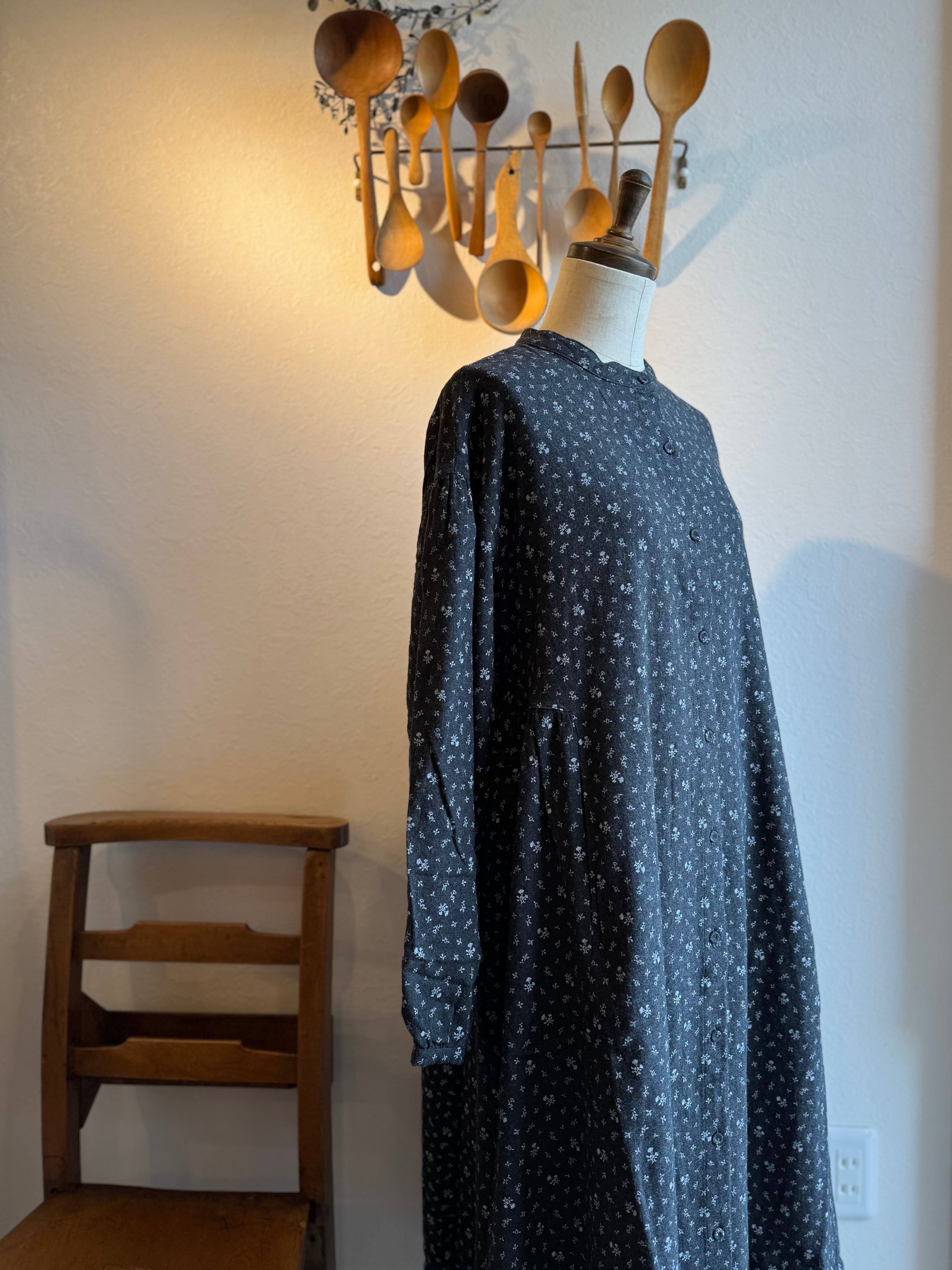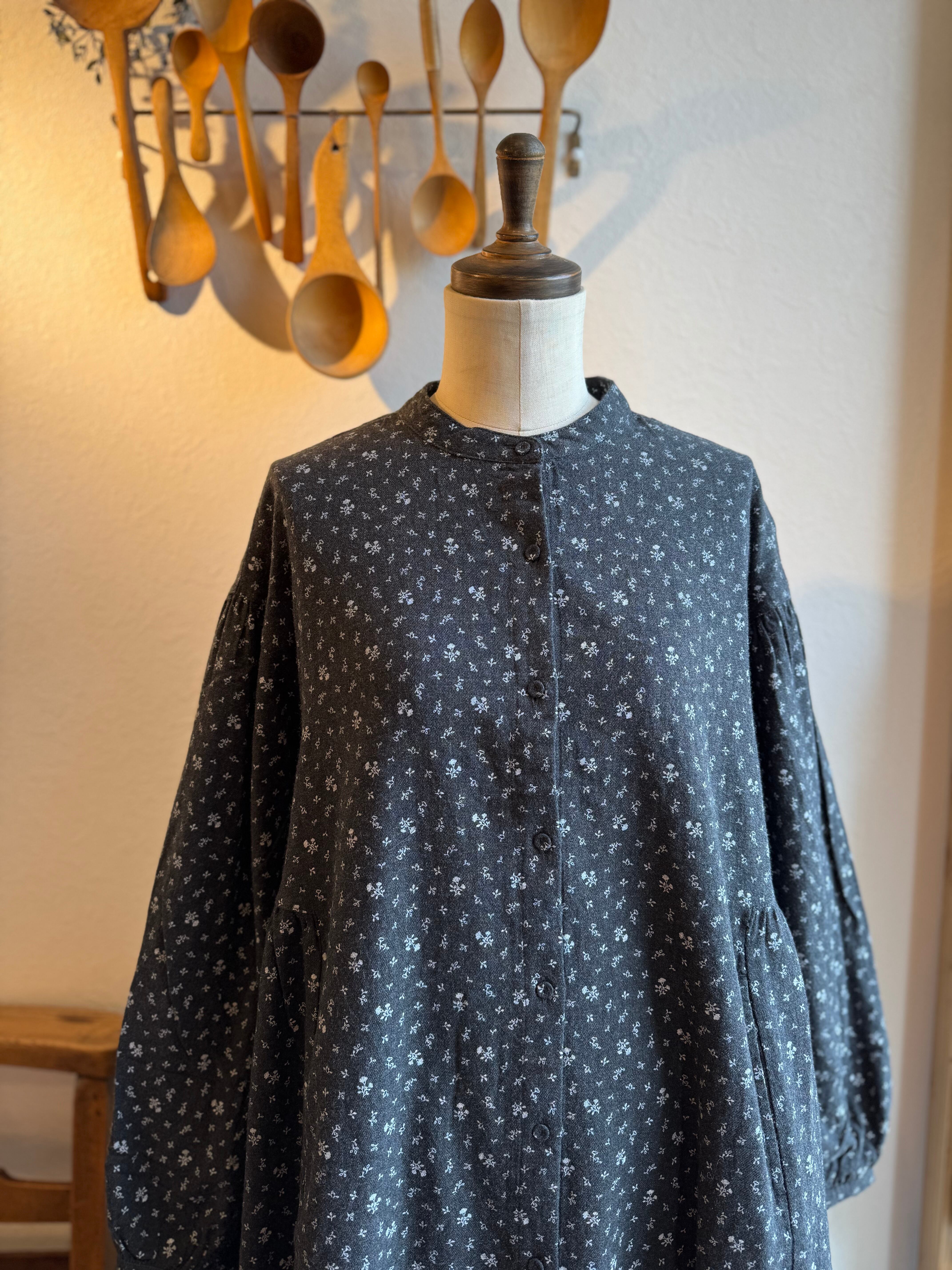 襟周りはシンプルなバンドカラー、前は下までボタンでプルオープンにも出来ます。