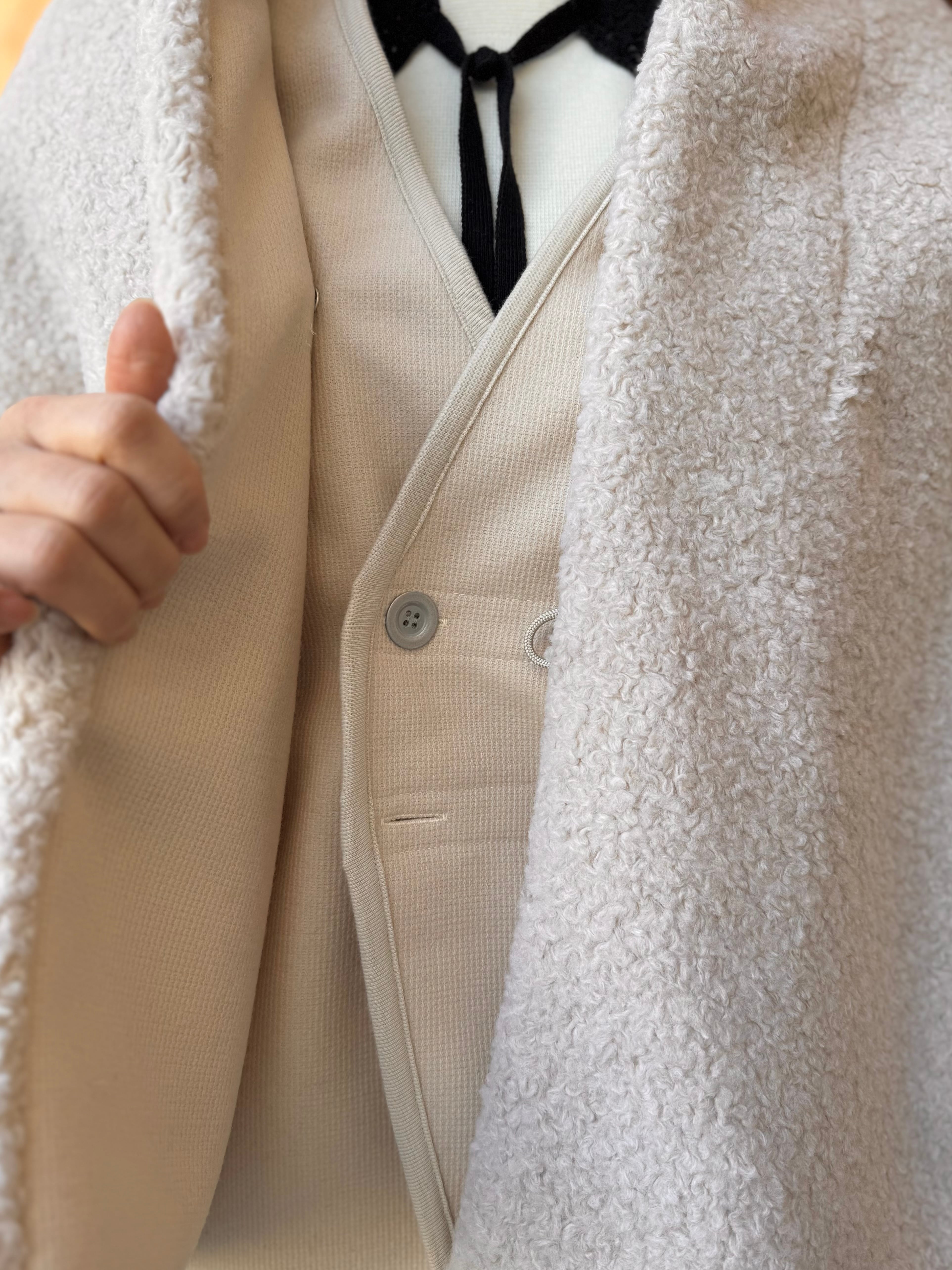 ボアストールとベストがボタン留めで一体化するという画期的なデザインで、高級感と可愛らしさを兼ね備えたロングベスト◎