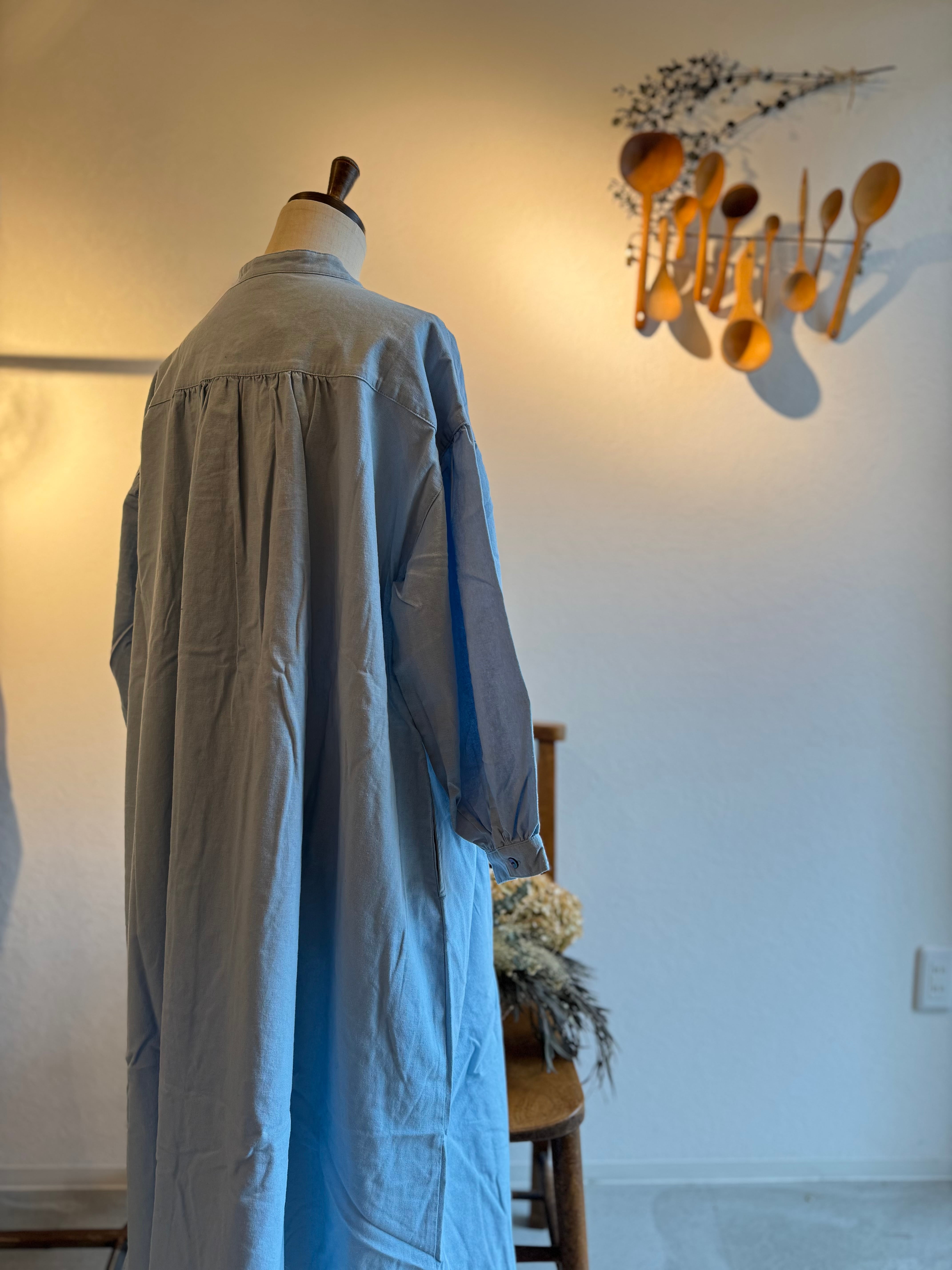 淡いアンティークブルーが雰囲気よく、ナチュラルに着られる大人のワンピースです