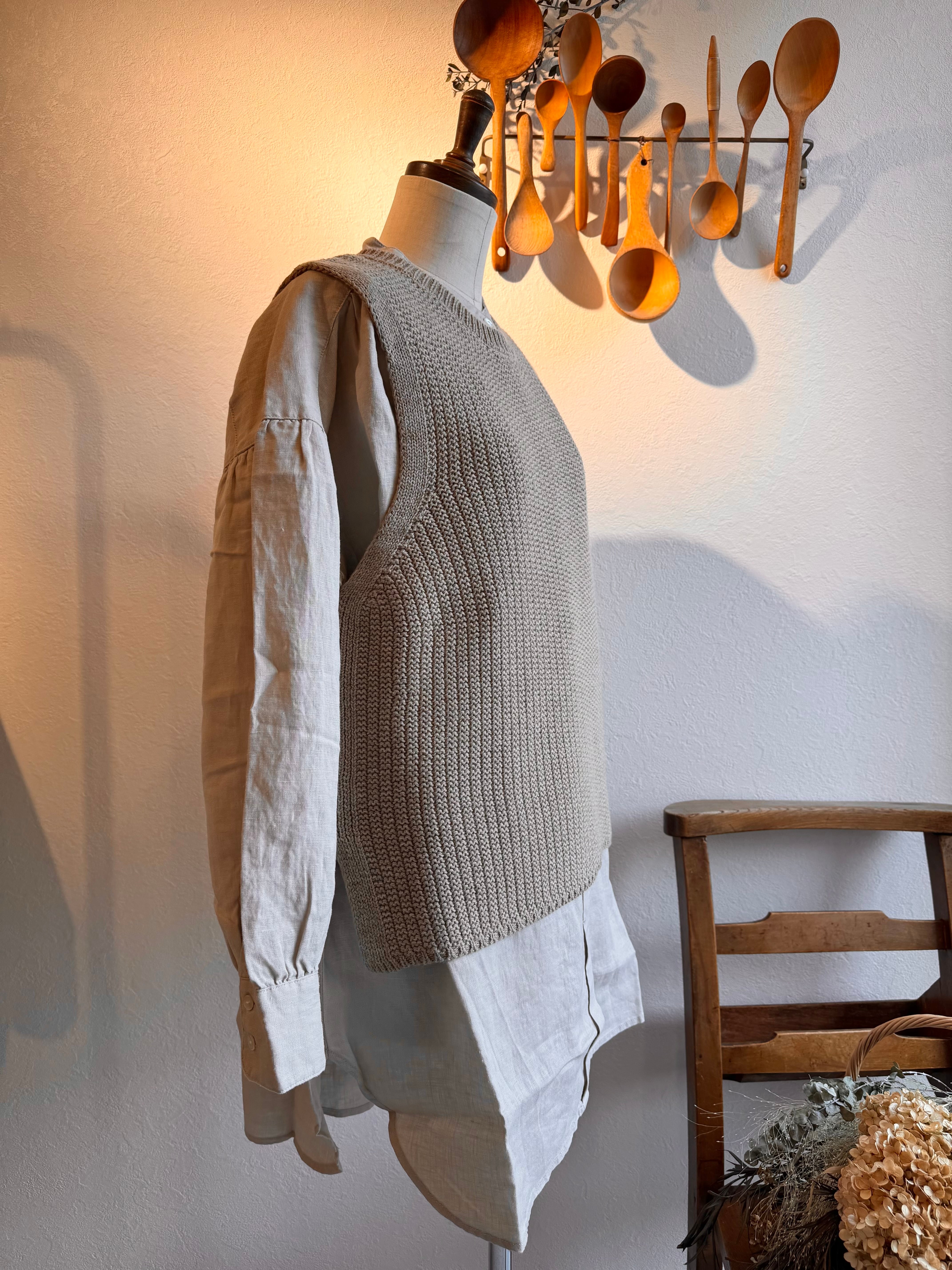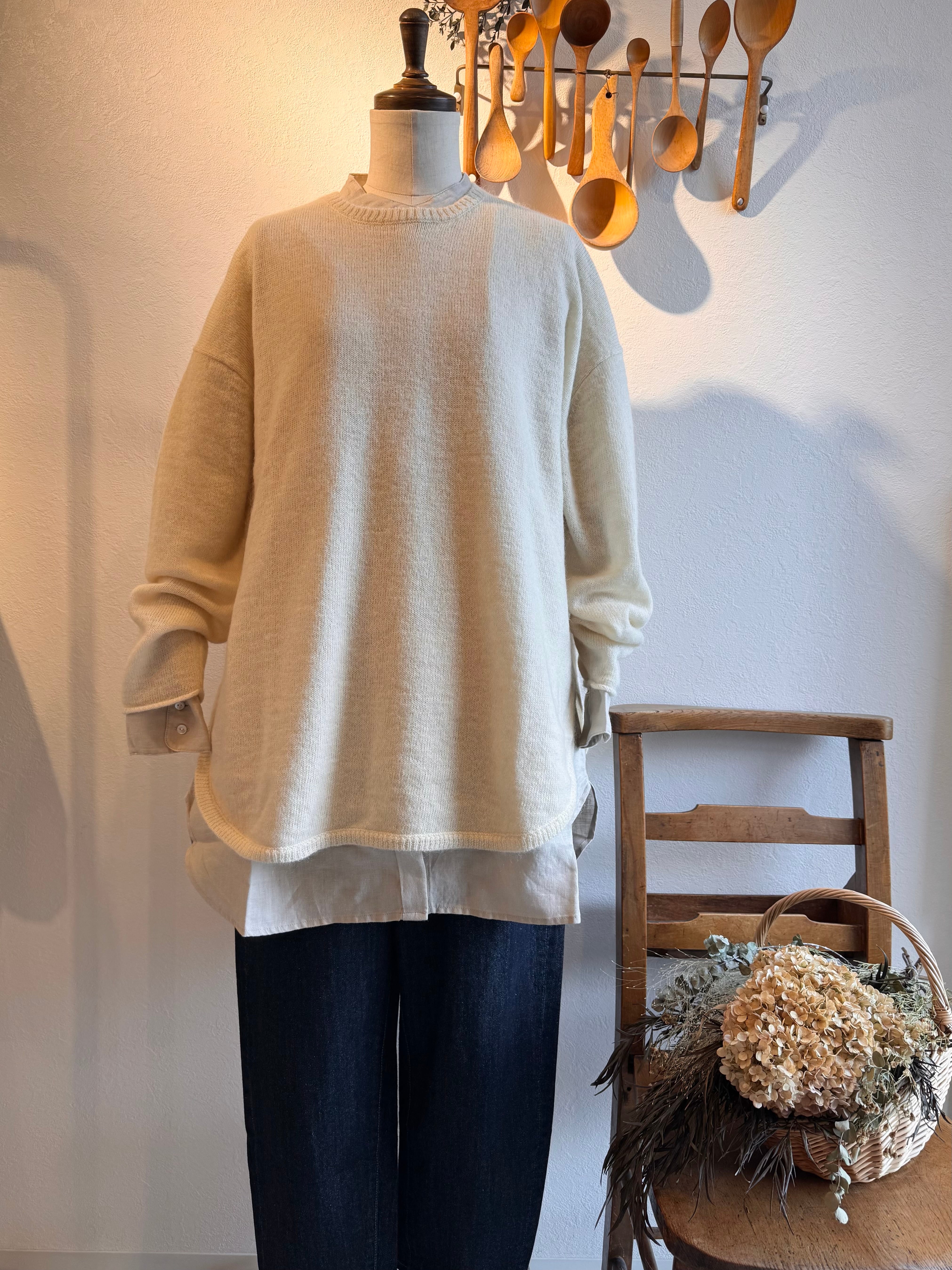 すそが長めなのでニットなどに重ねて雰囲気を作れるデザイン