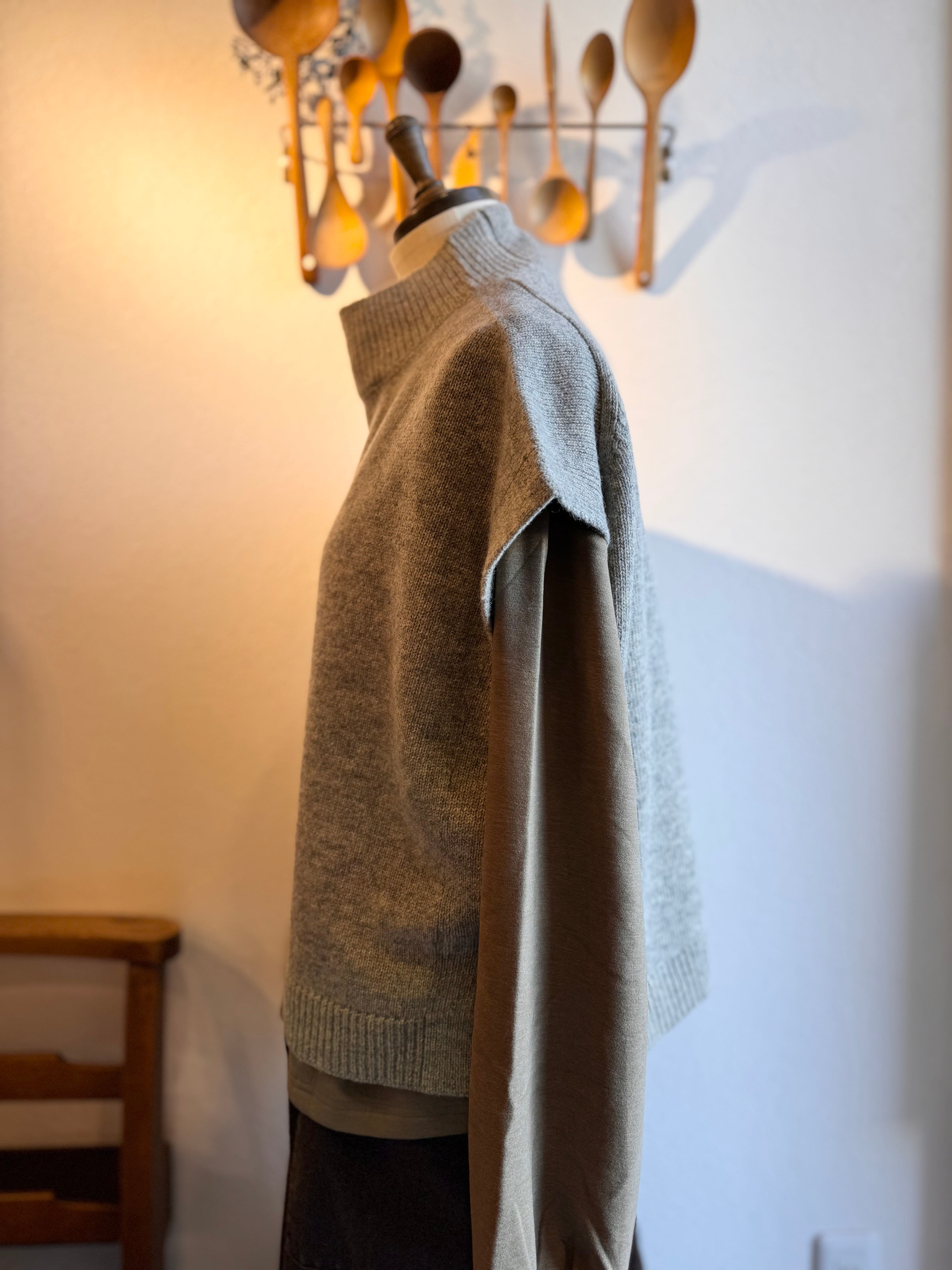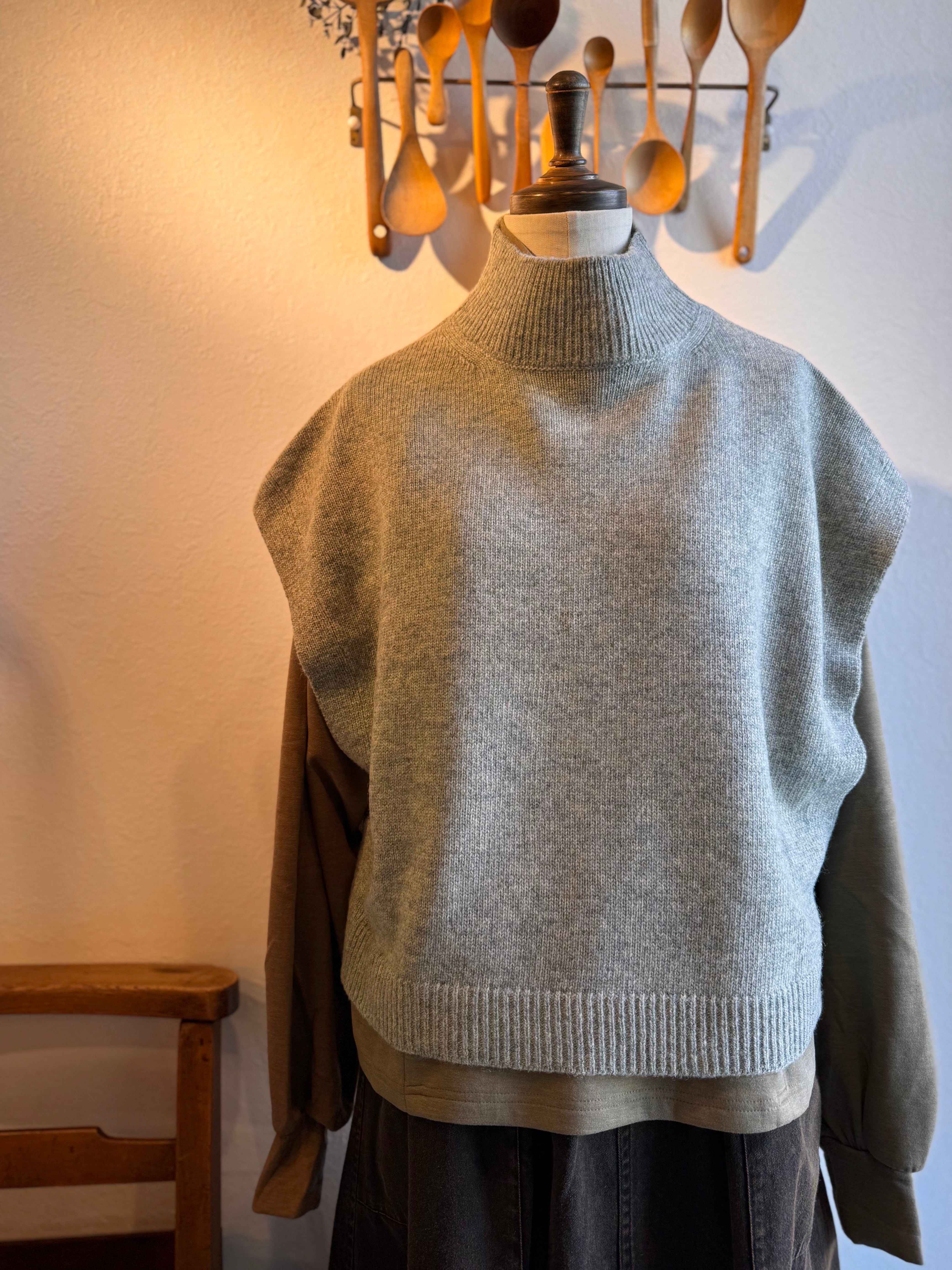 締め付けすぎないハイネックはリブもやわらかでシャツやタートルと重ねやすくなっています
