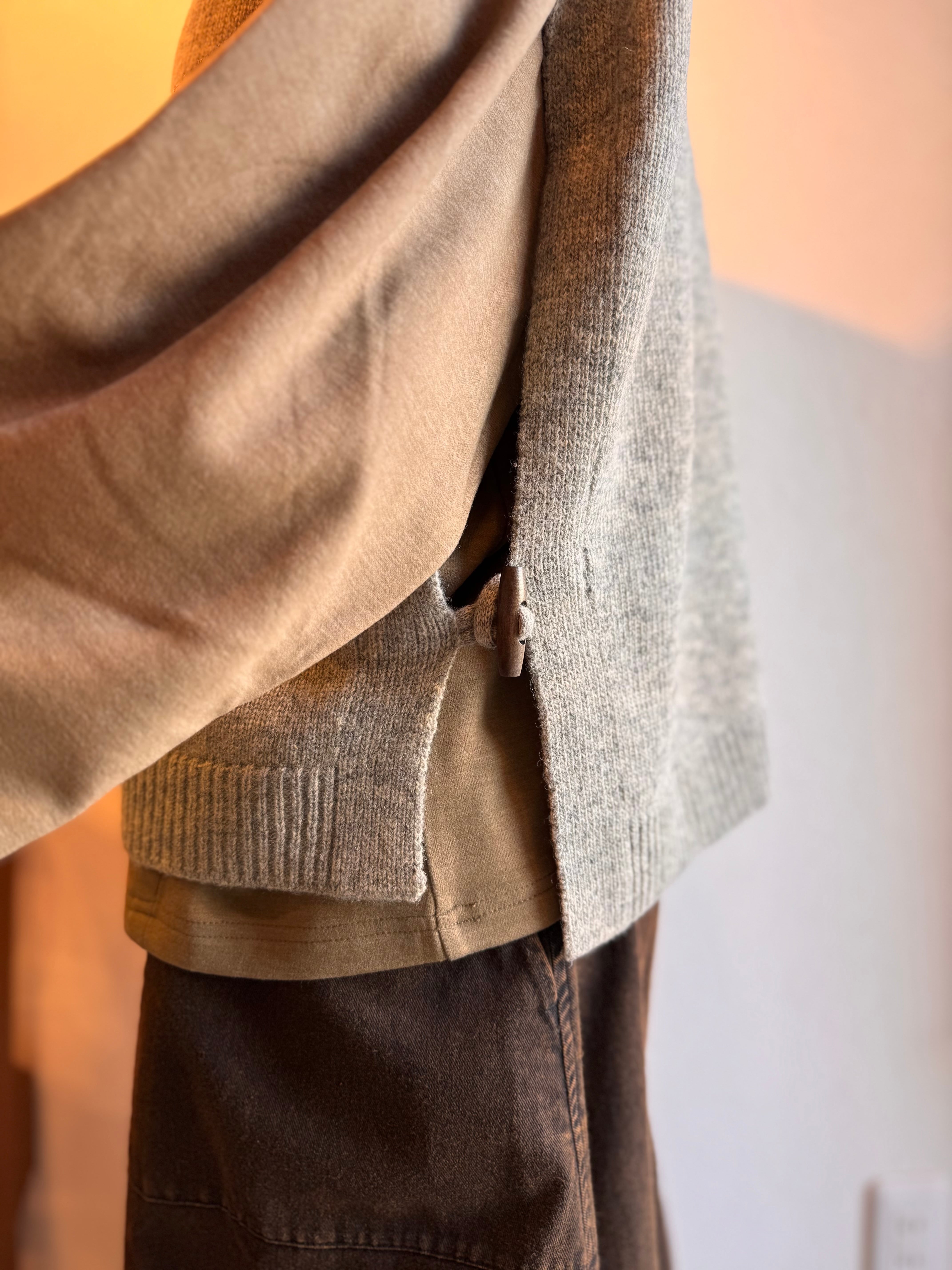 ウッドボタンで留めるデザインです