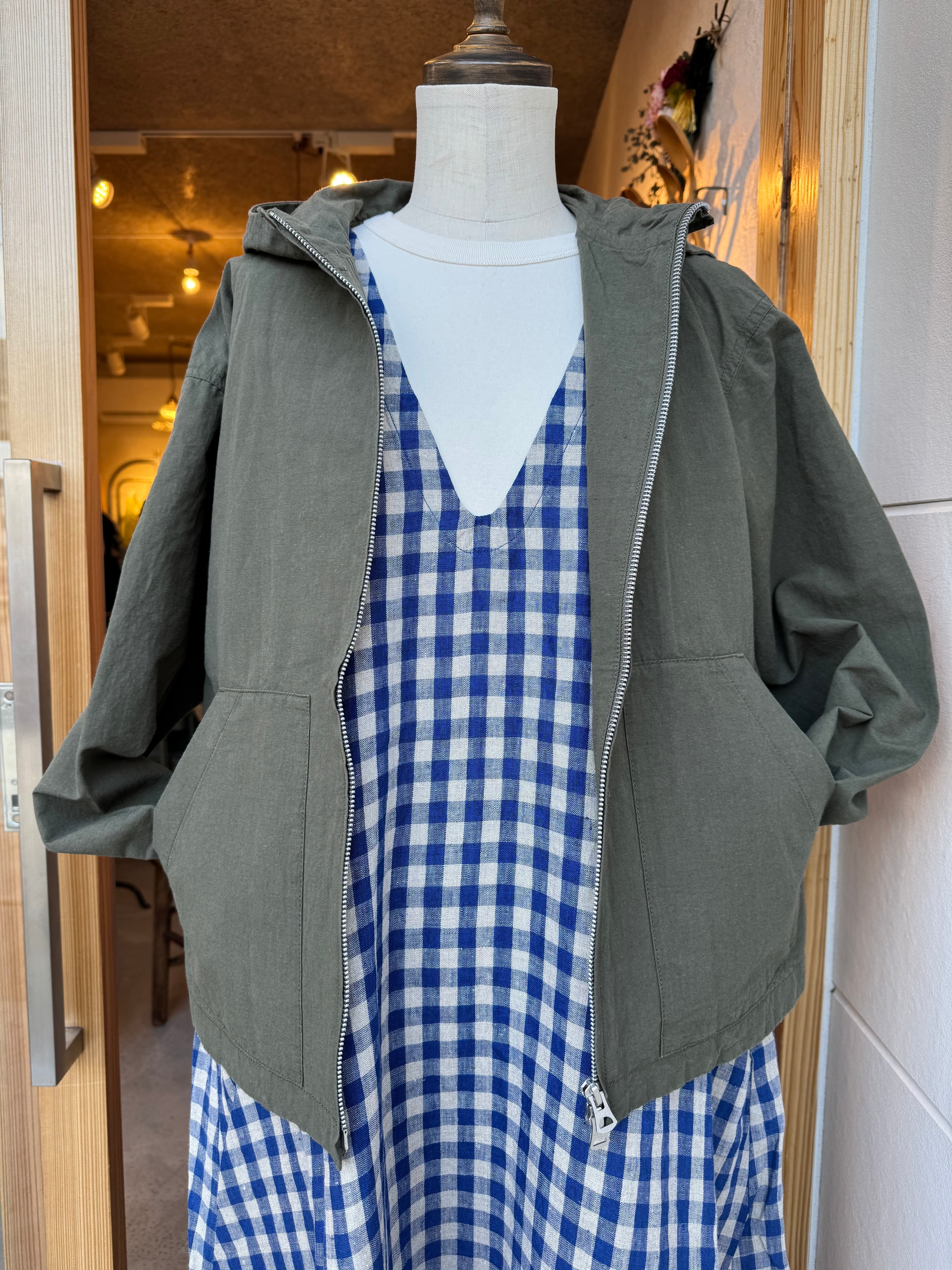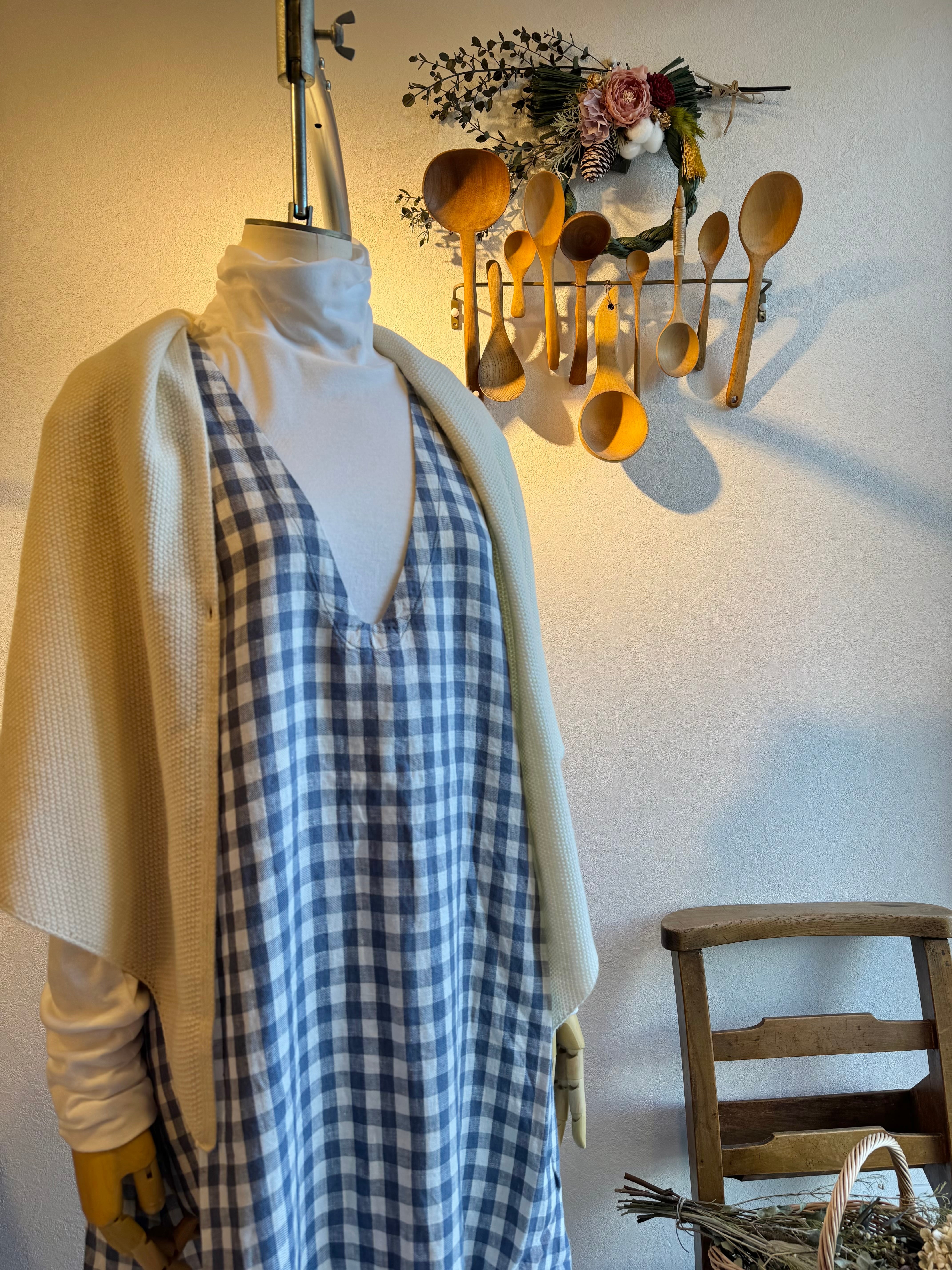 フロントは深いVネックで切り替えなしのすっきりフレア。バッグは腰で切り替えと少しのギャザーでふんわりとした後ろ姿にしています。