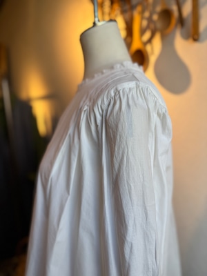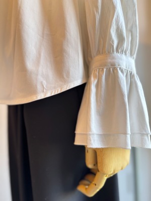 クルーネックの襟に細かなフリルを施し袖にはふんわりとラッフルをつけたデザイン