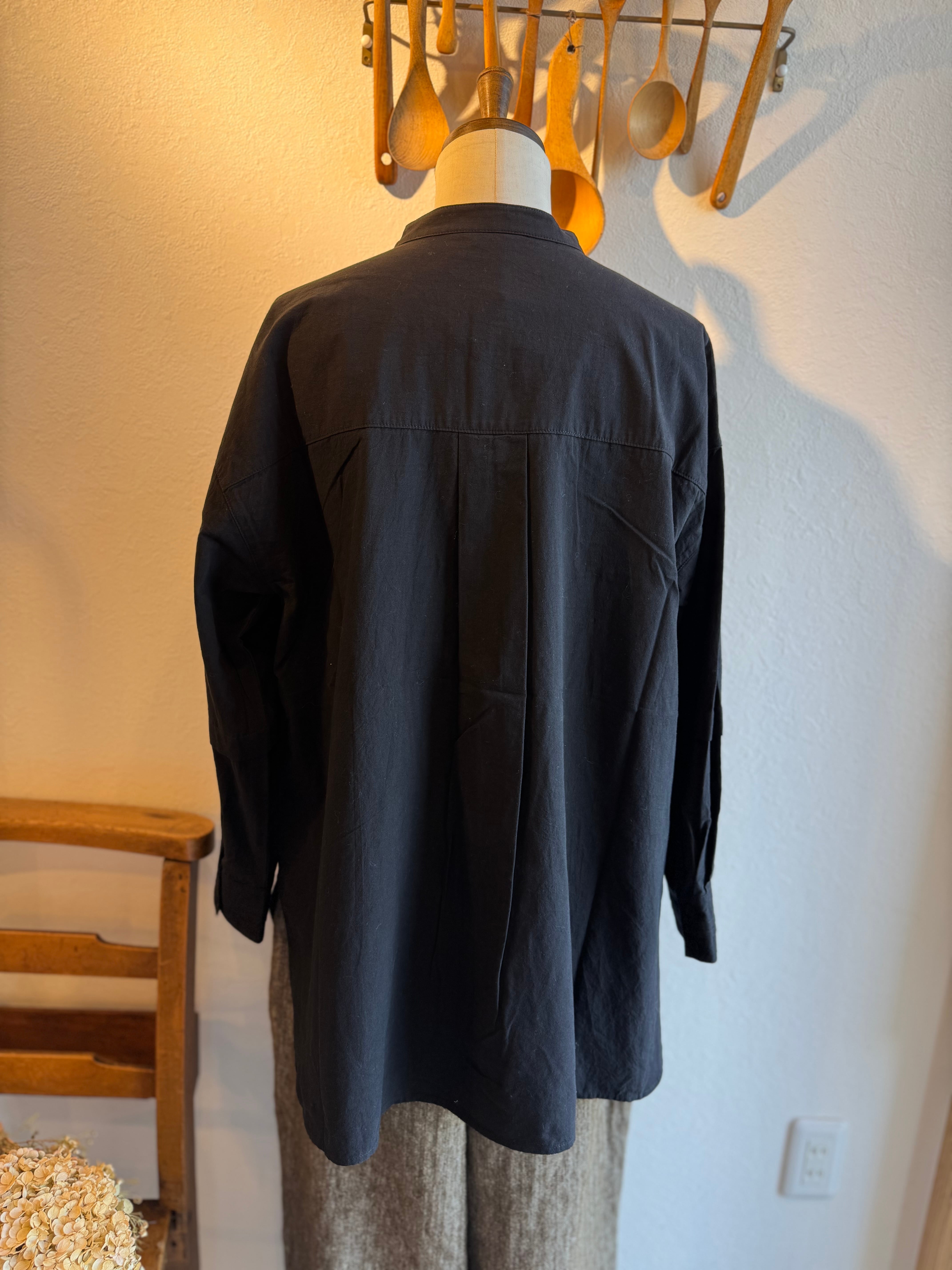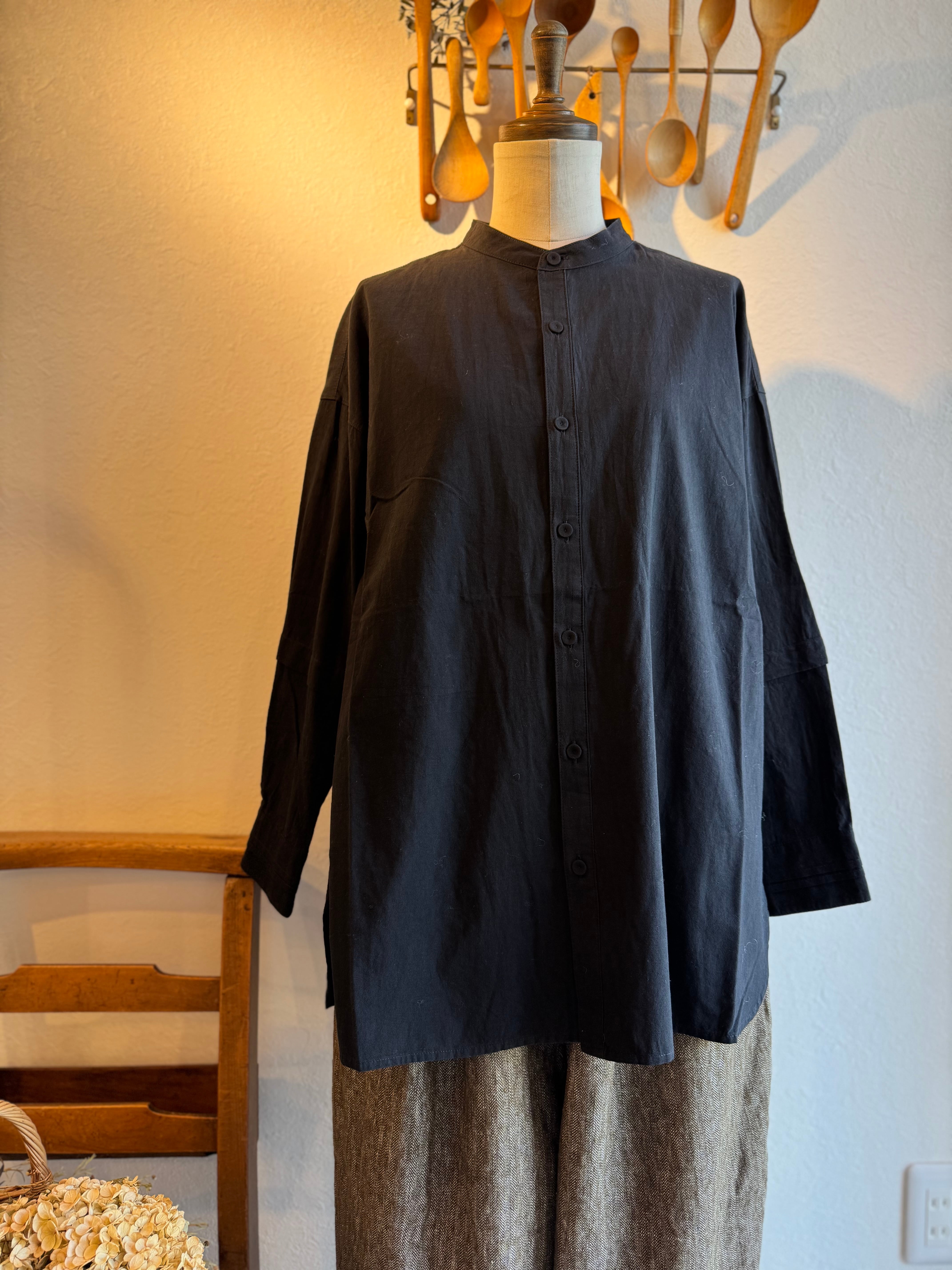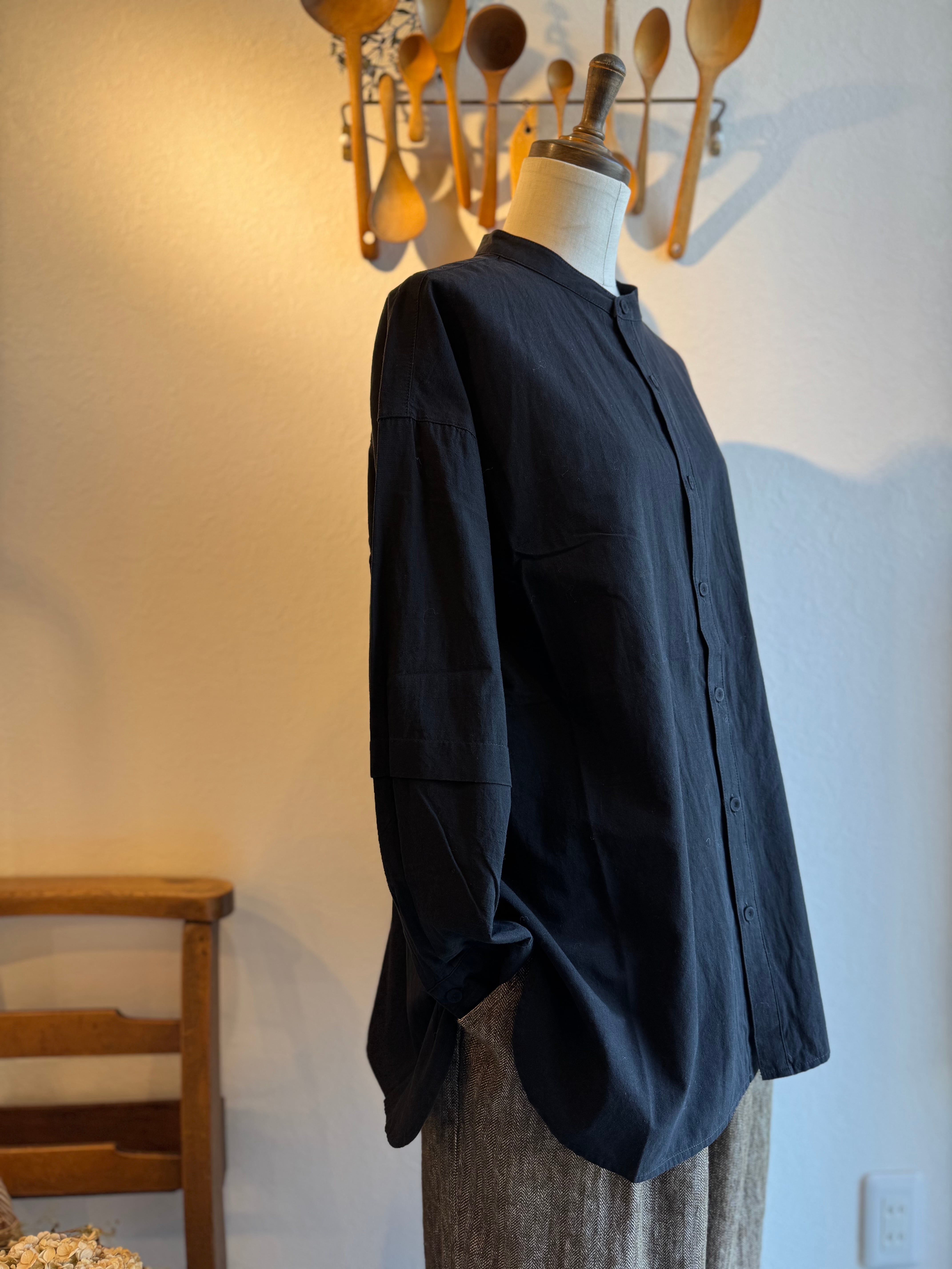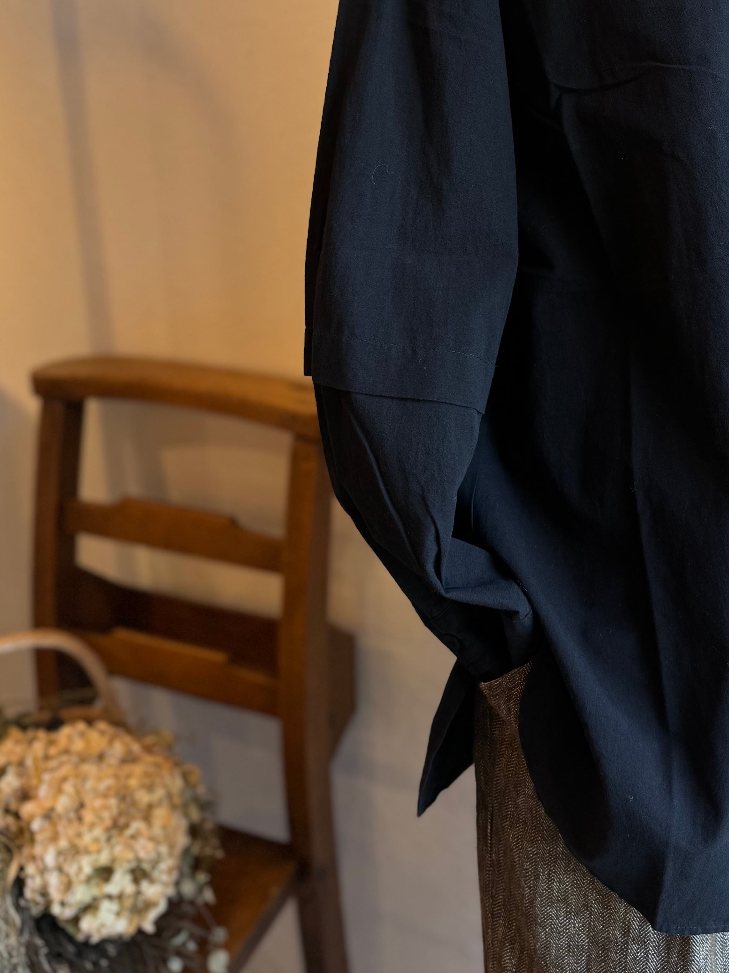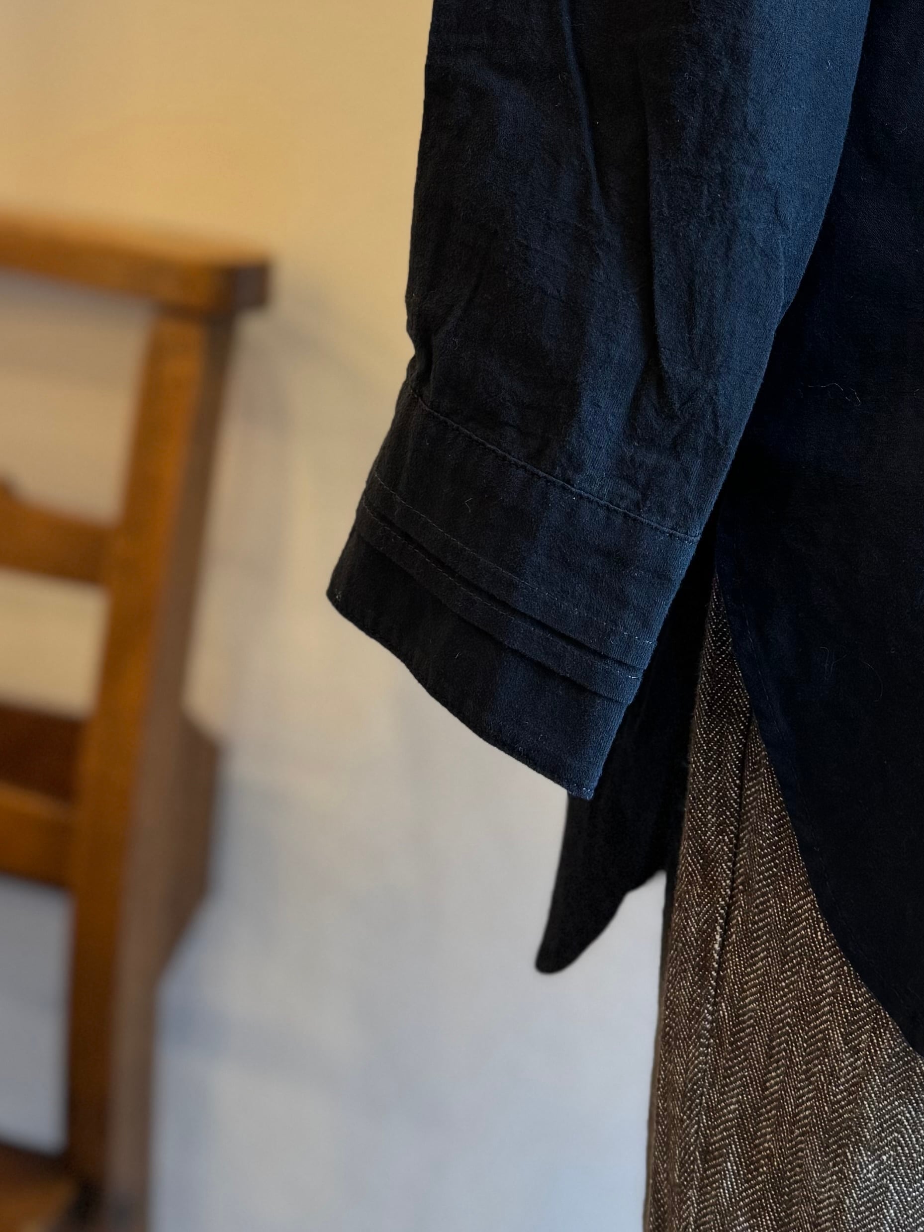すっきりバンドカラー、肘の辺りにもタックを入れ、袖口にもステッチを施すなど手の込んだデザインになっています!