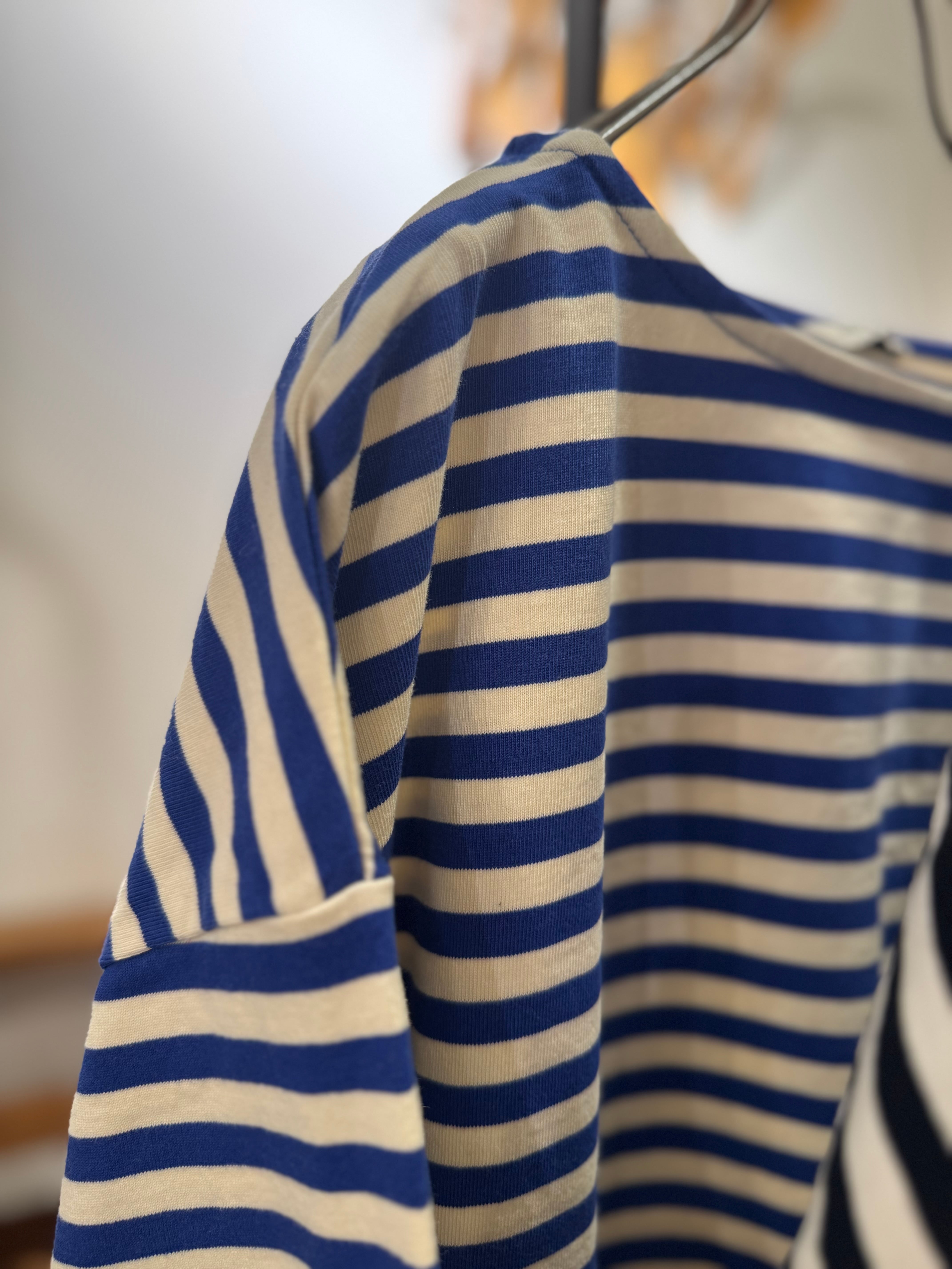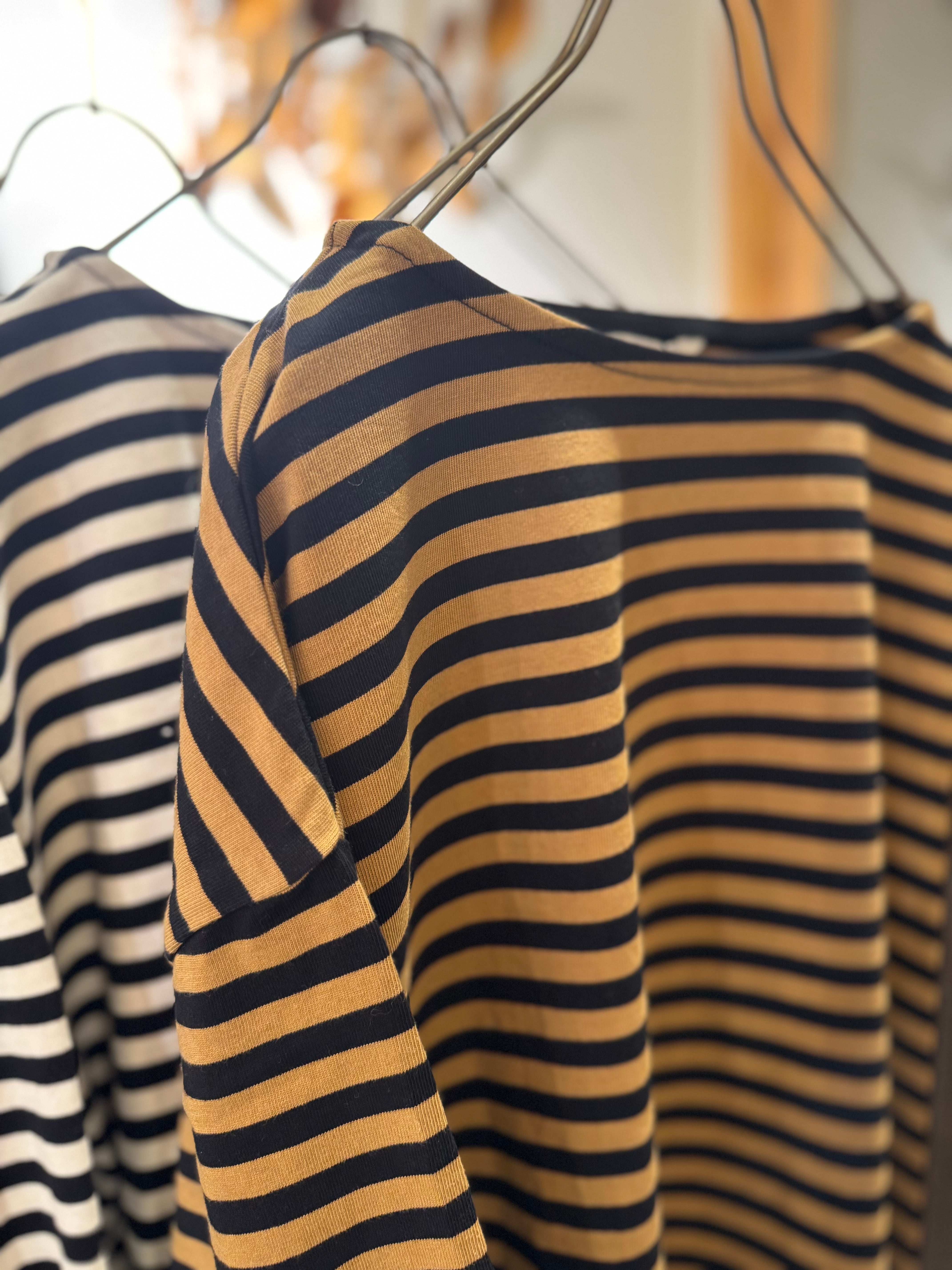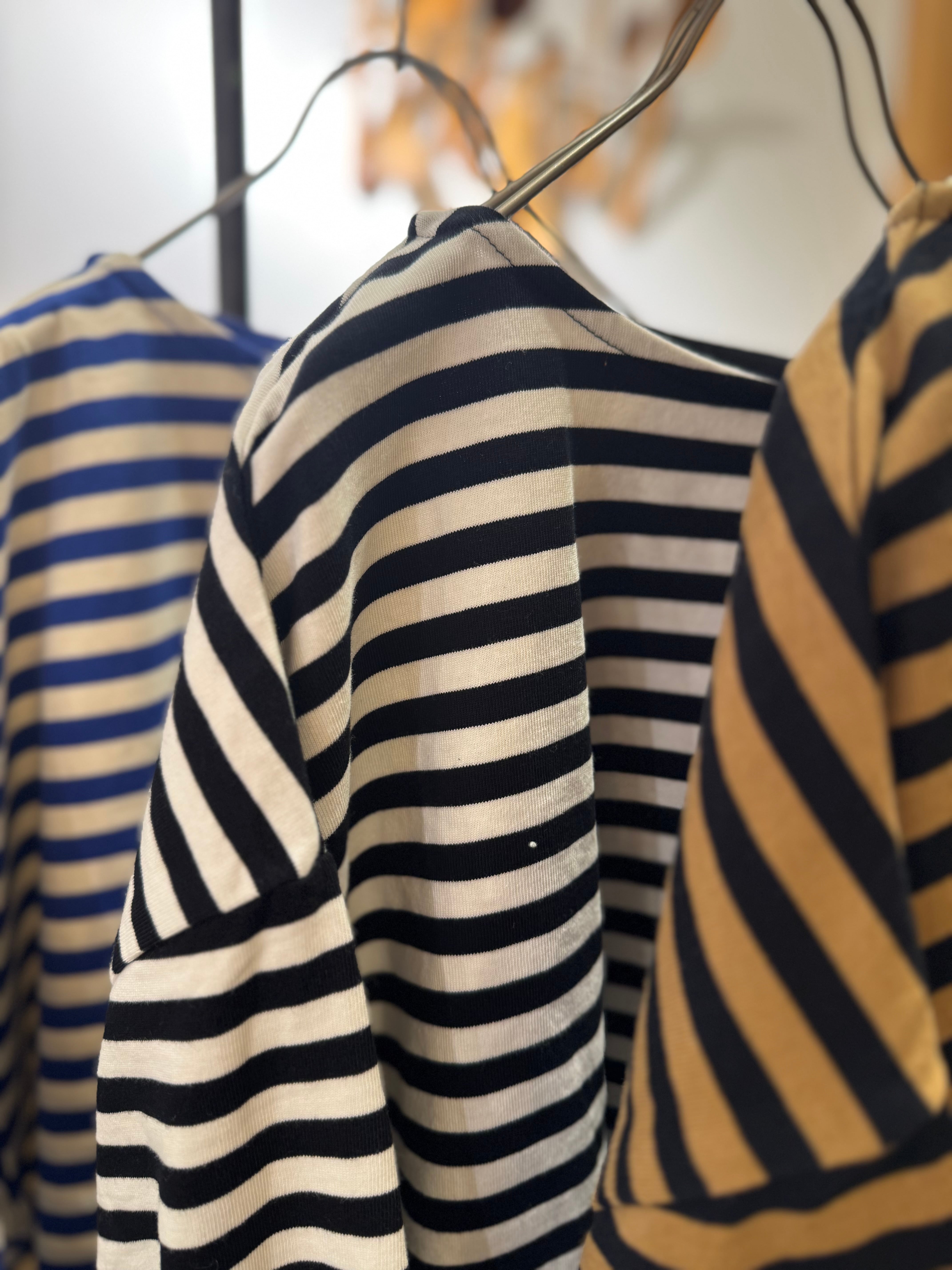 着こなしのポイントになってくれるボーダーは普段使いに欠かせないアイテム。あきすぎないボートネックやふんわりスリーブ、ゆったりシルエットで前後差のあるスリットデザインなどなど小さなこだわりポイントがたくさん!
