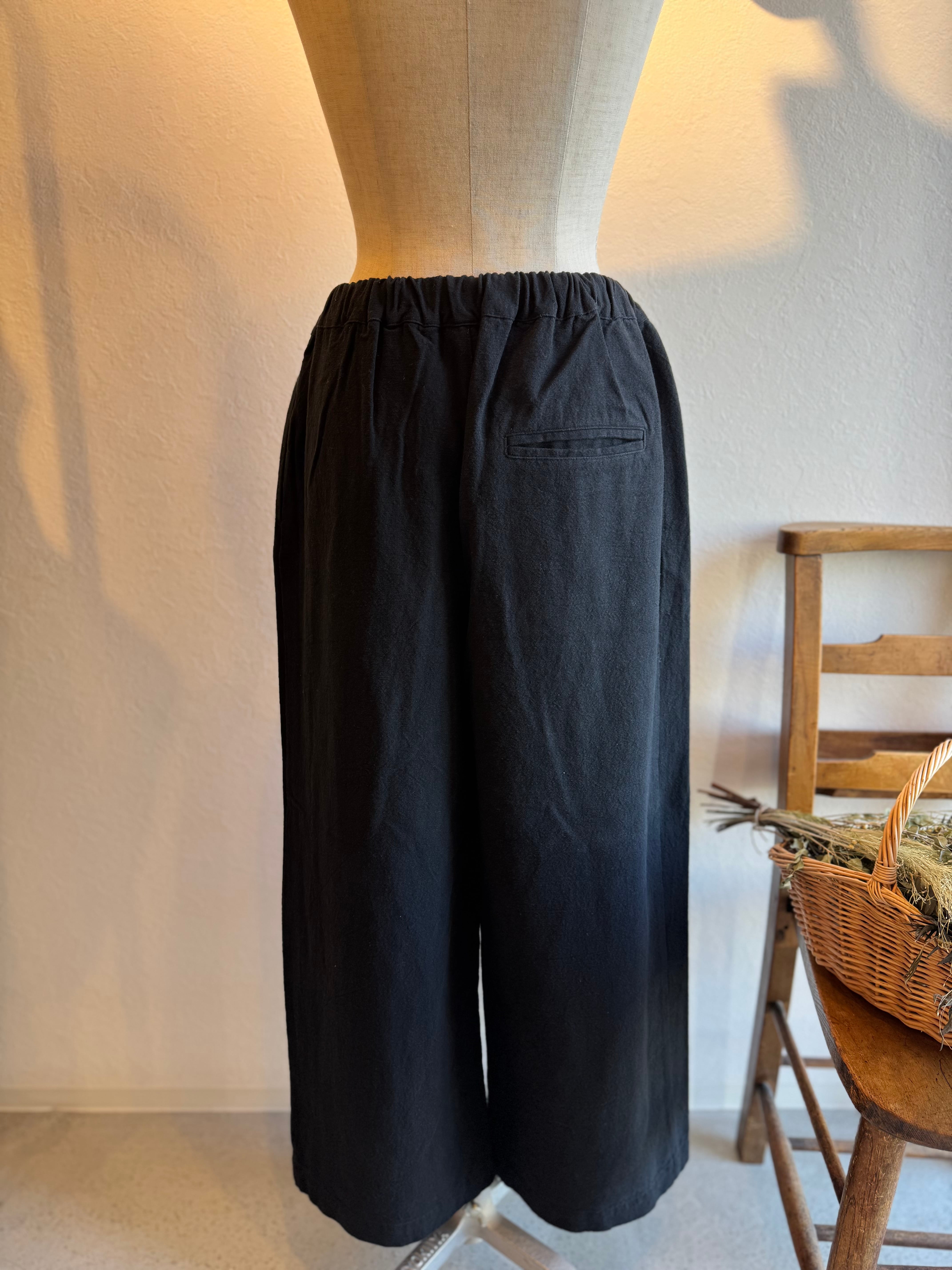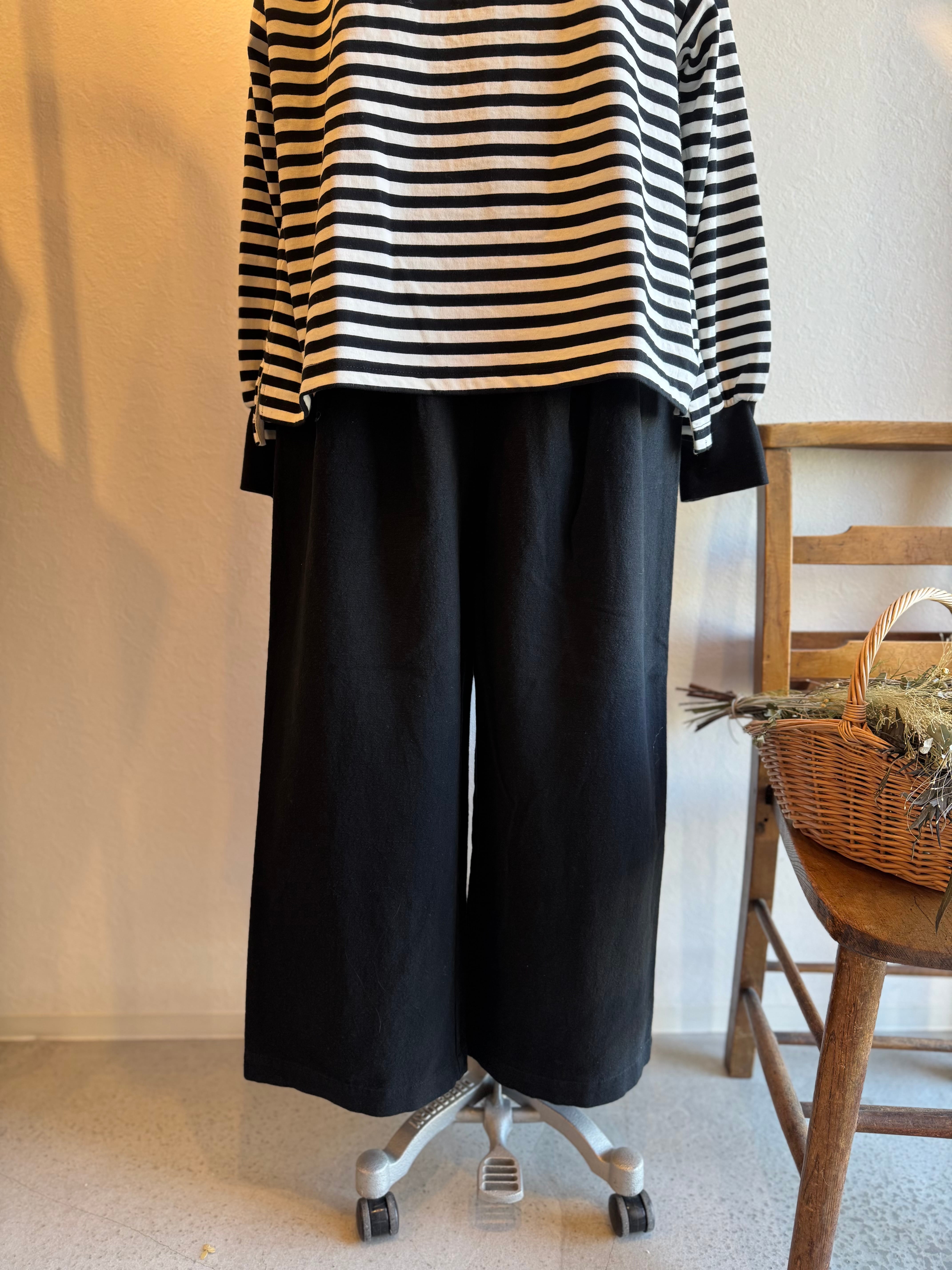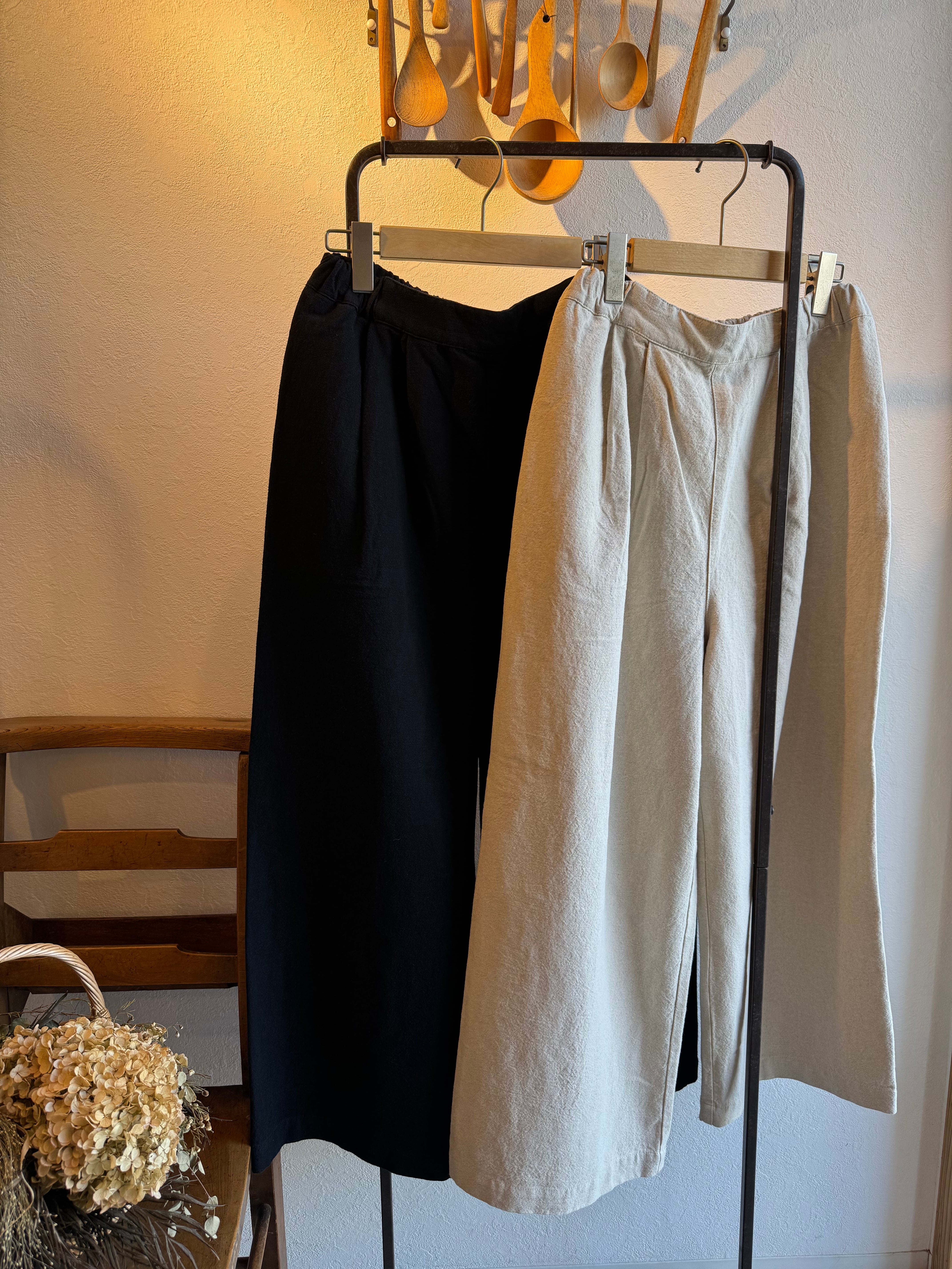 ワイドストレートなシルエットですっきりと着ていただけます。ウエストにはタック、後ろゴムの仕様でトップスをインスタイルにしてもきれいに見せてくれます。