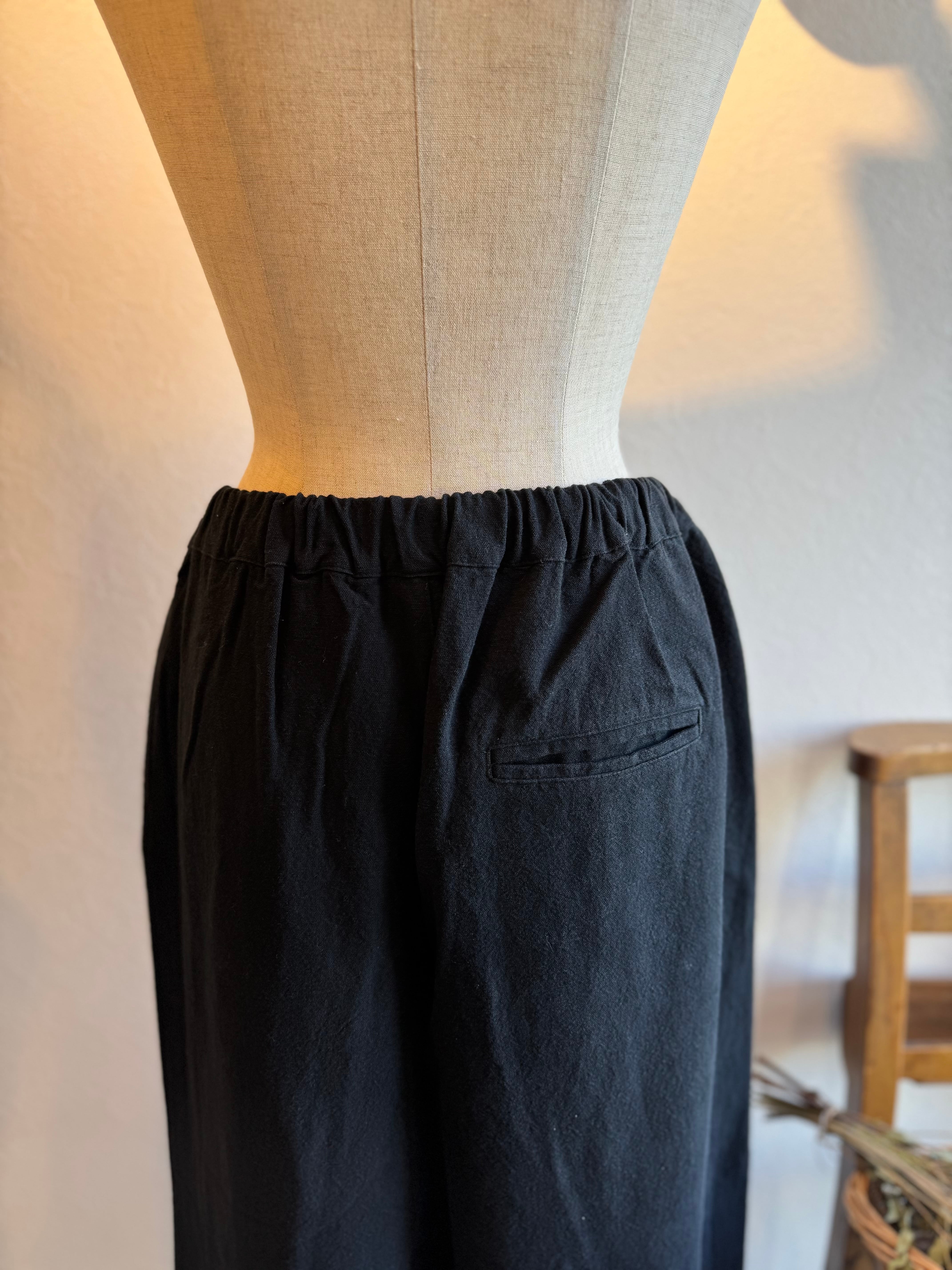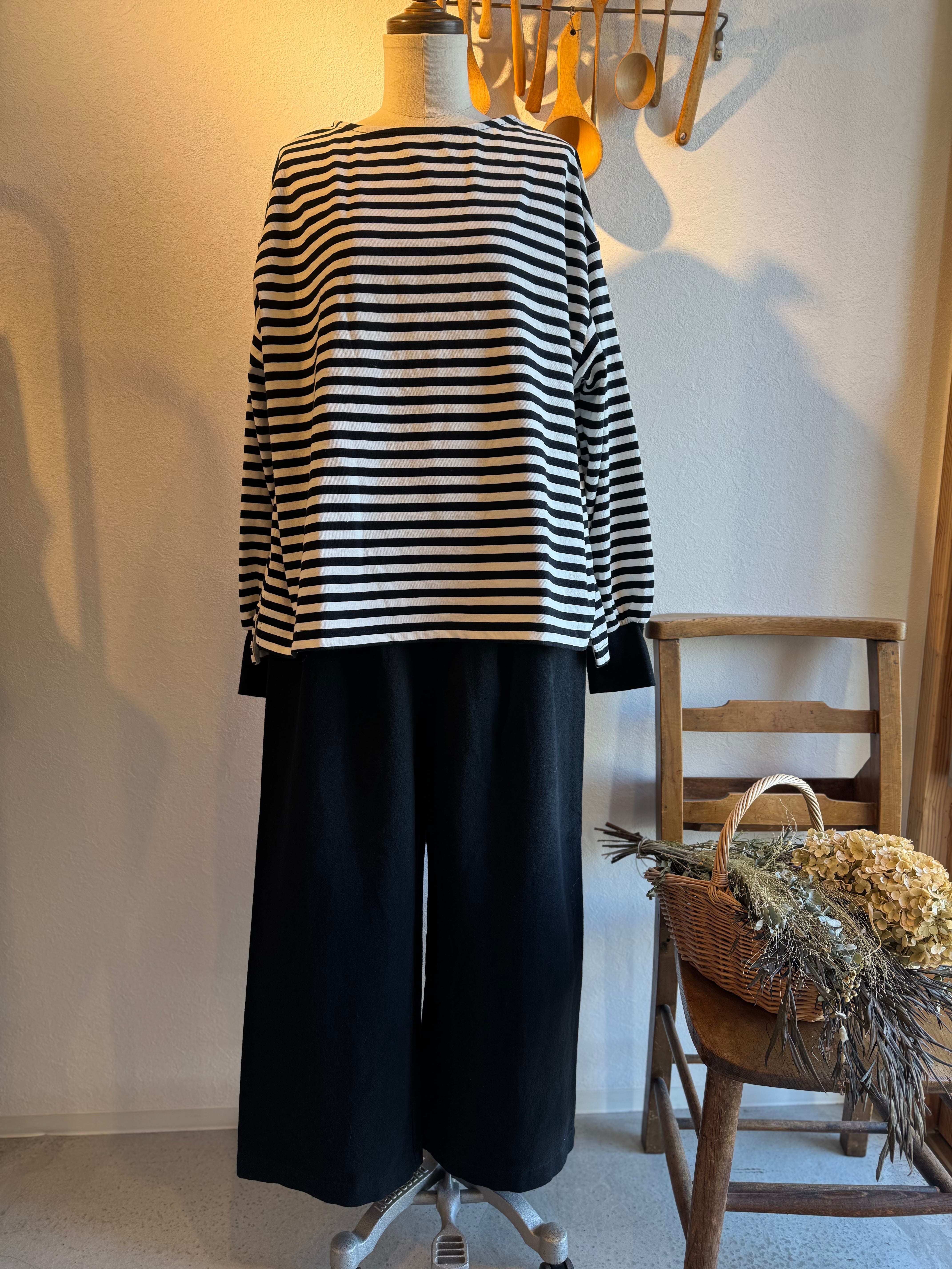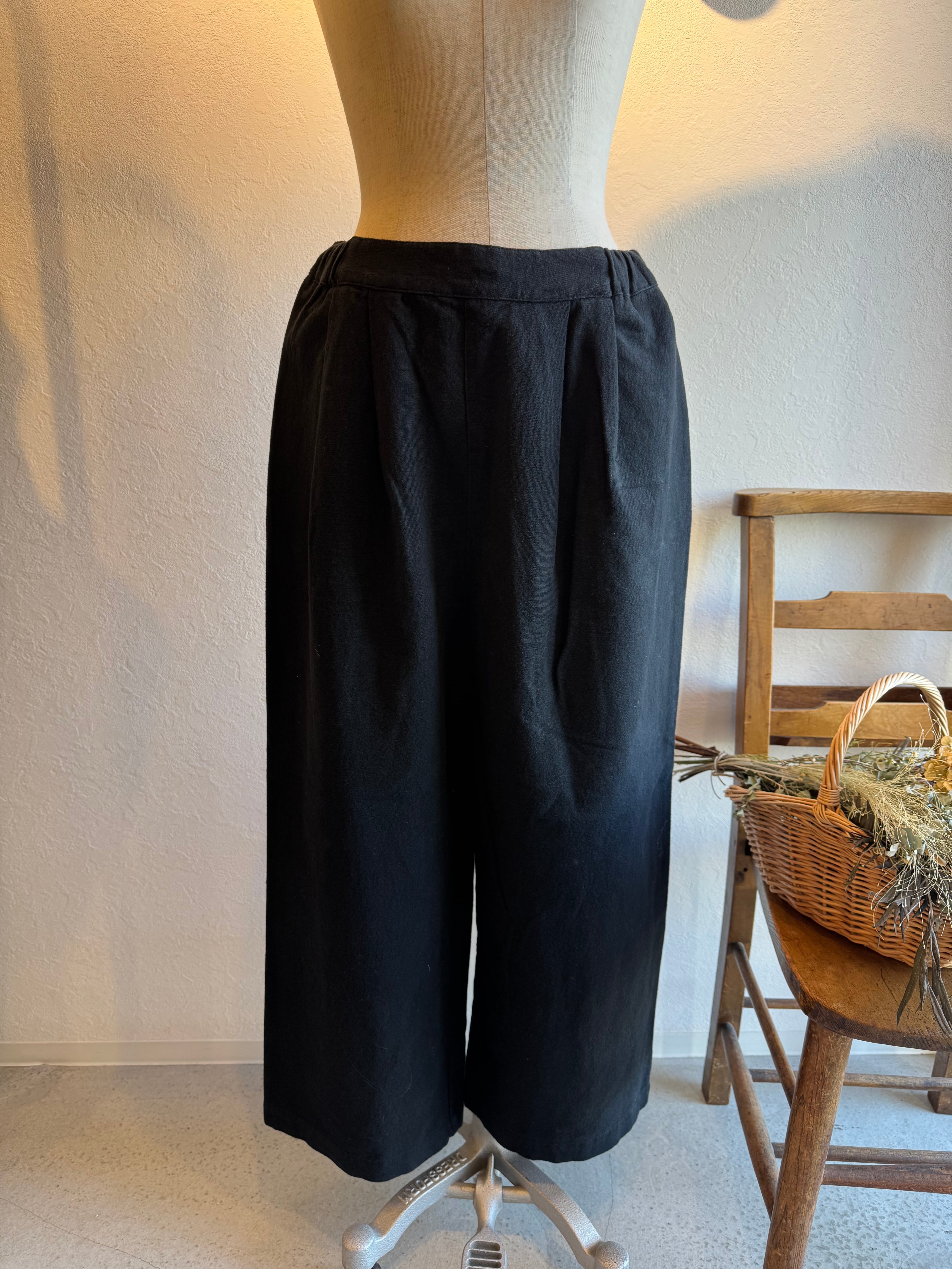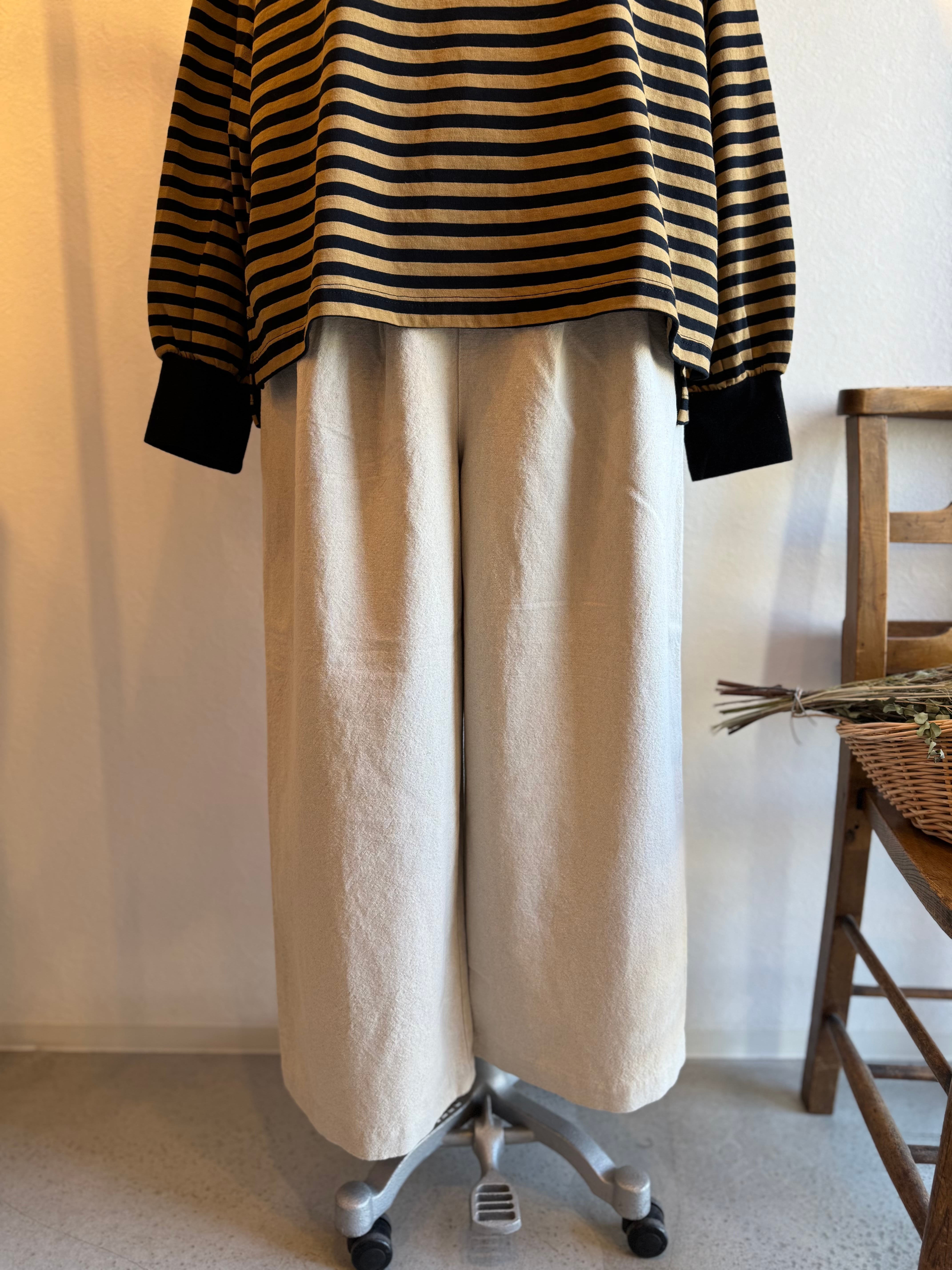 ワイドストレートなシルエットですっきりと着ていただけます。ウエストにはタック、後ろゴムの仕様でトップスをインスタイルにしてもきれいに見せてくれます。