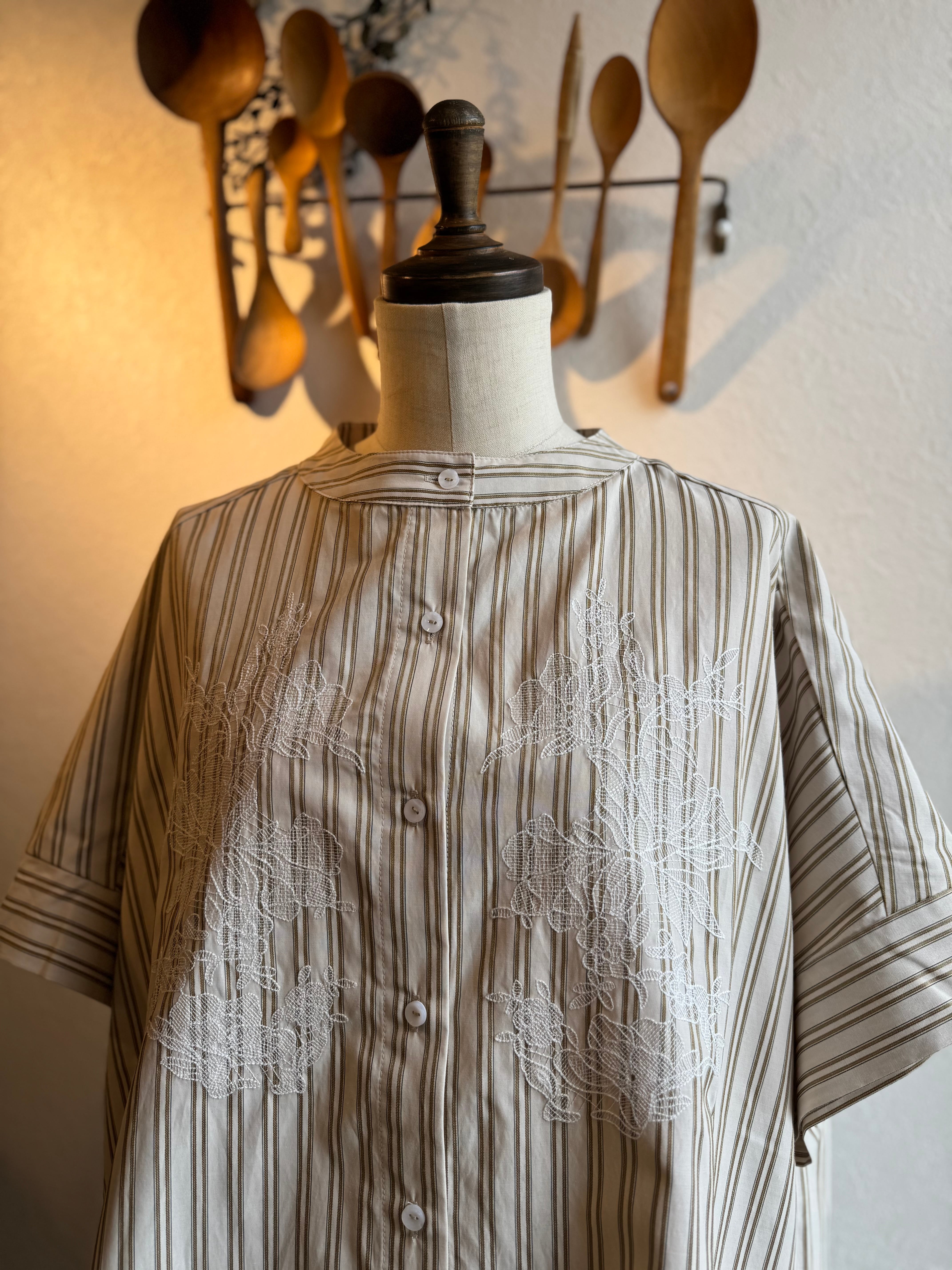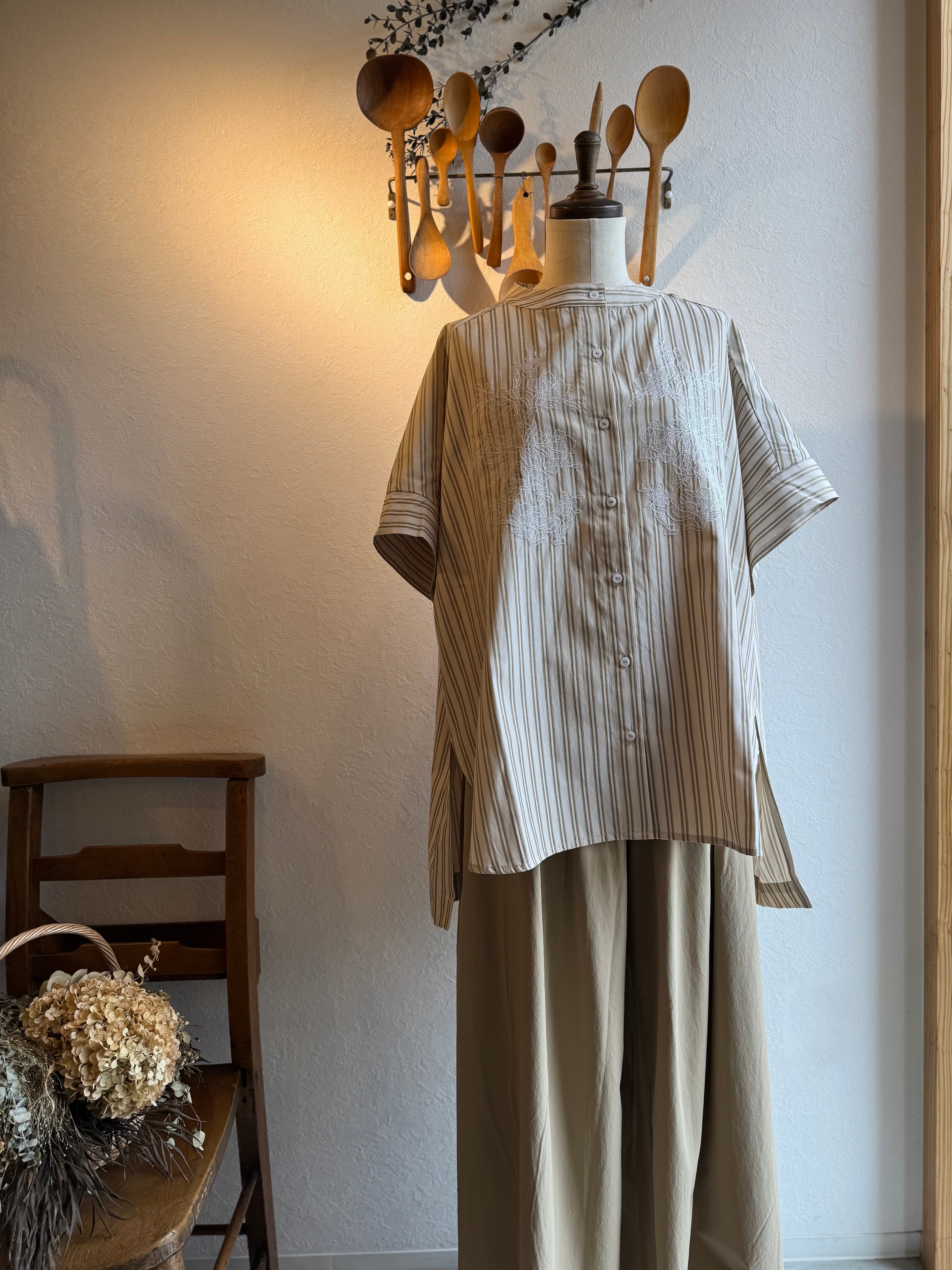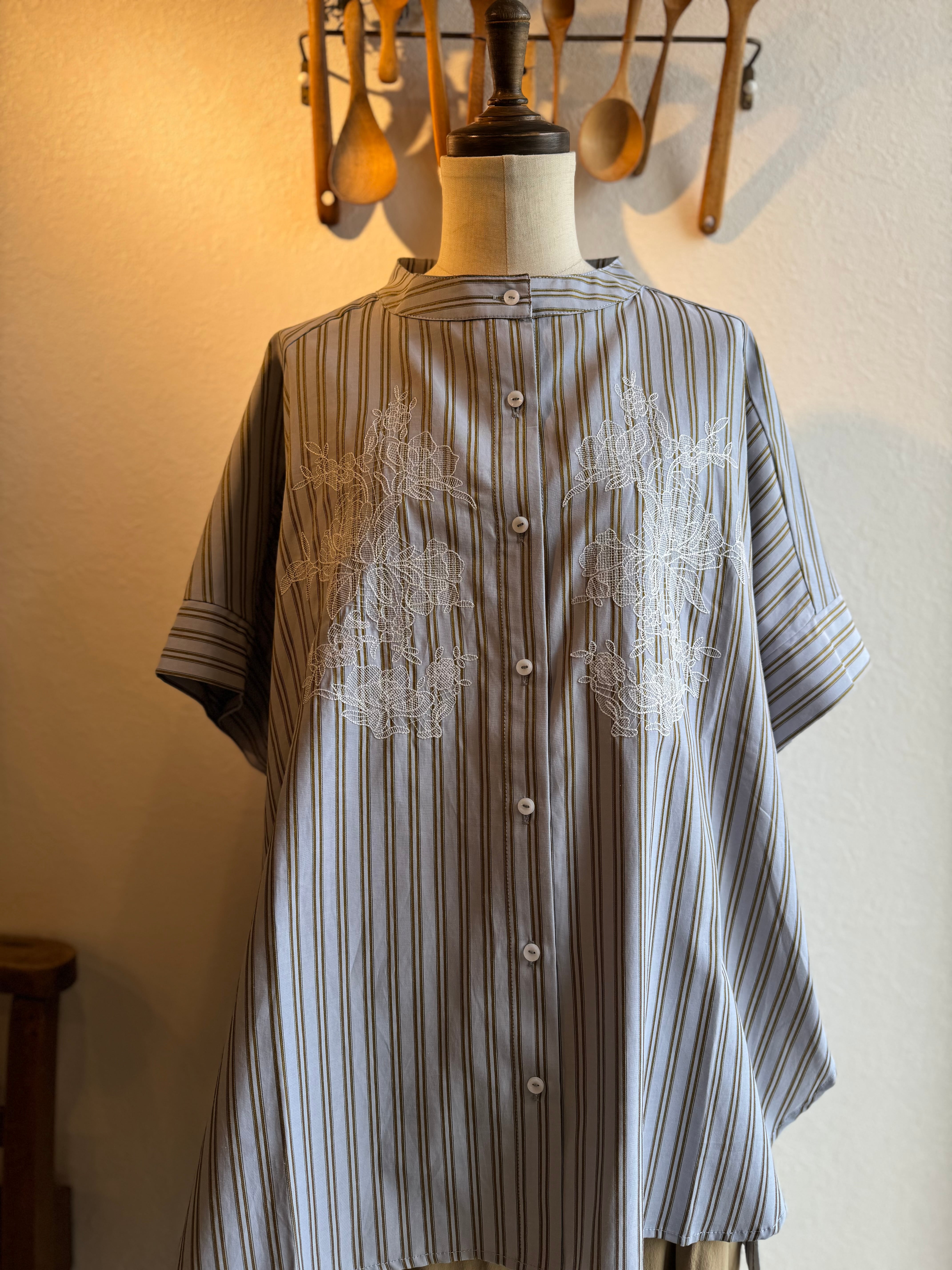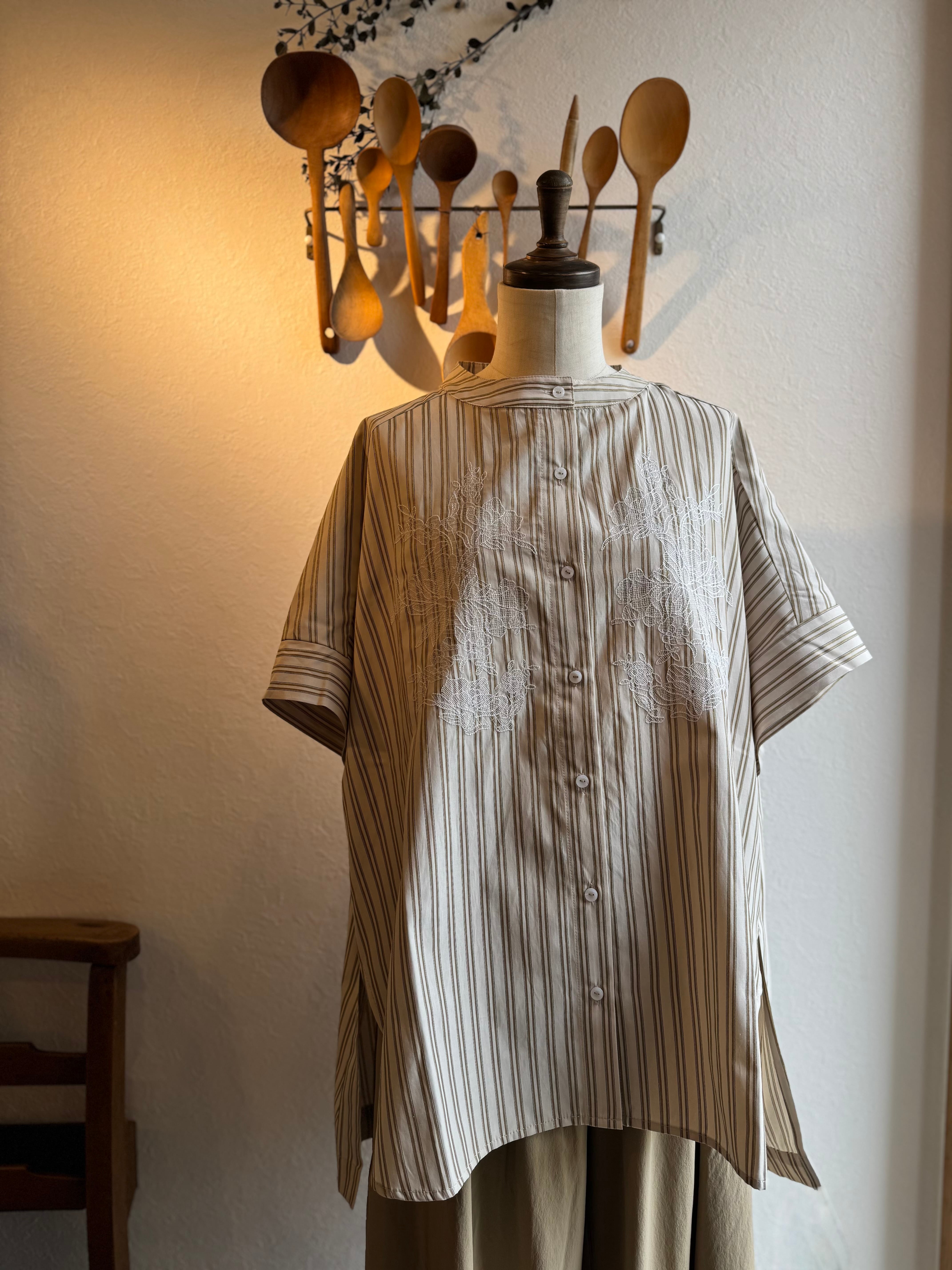 KELEN ストライプ×レース刺繍チュニックシャツ
