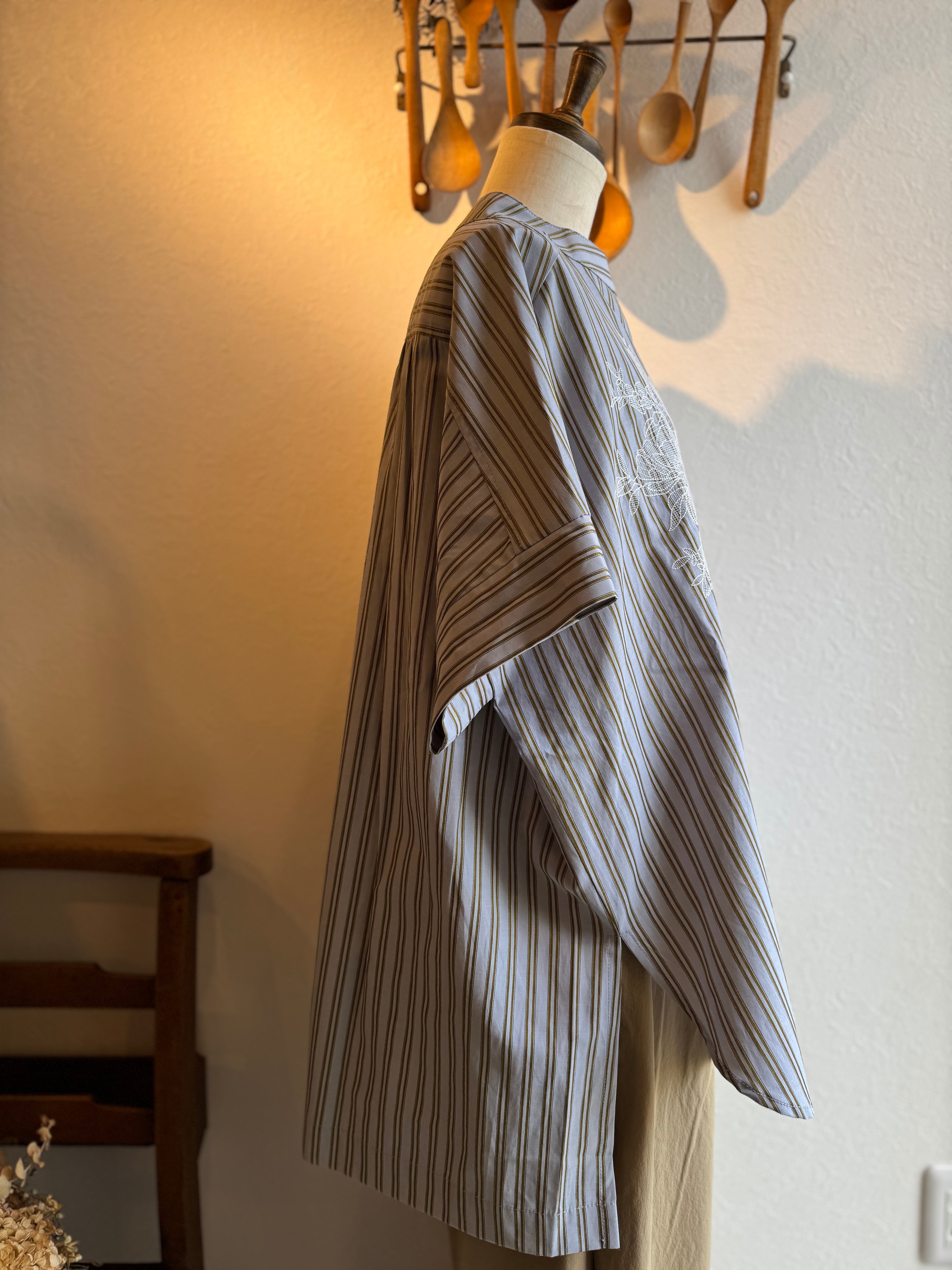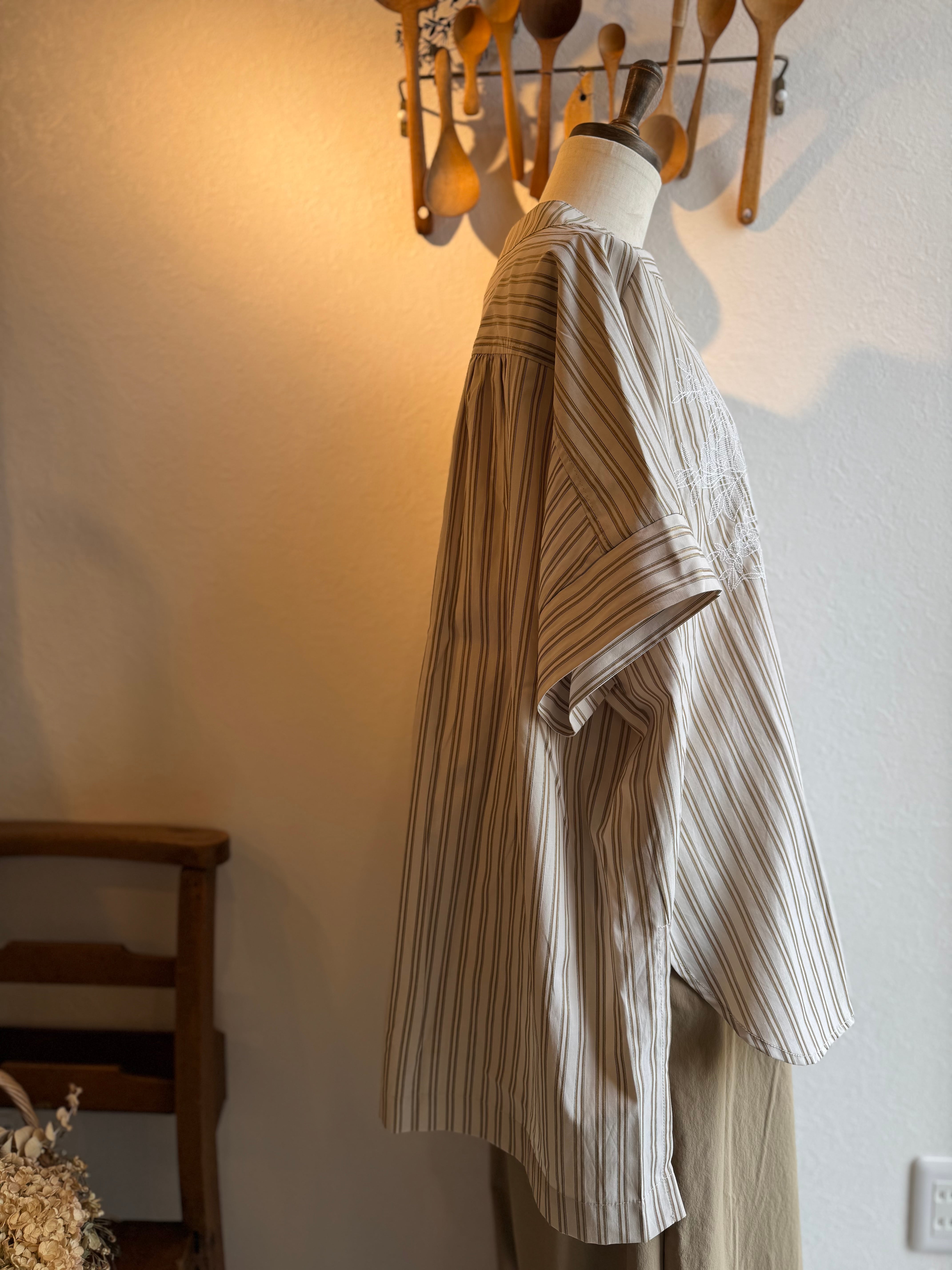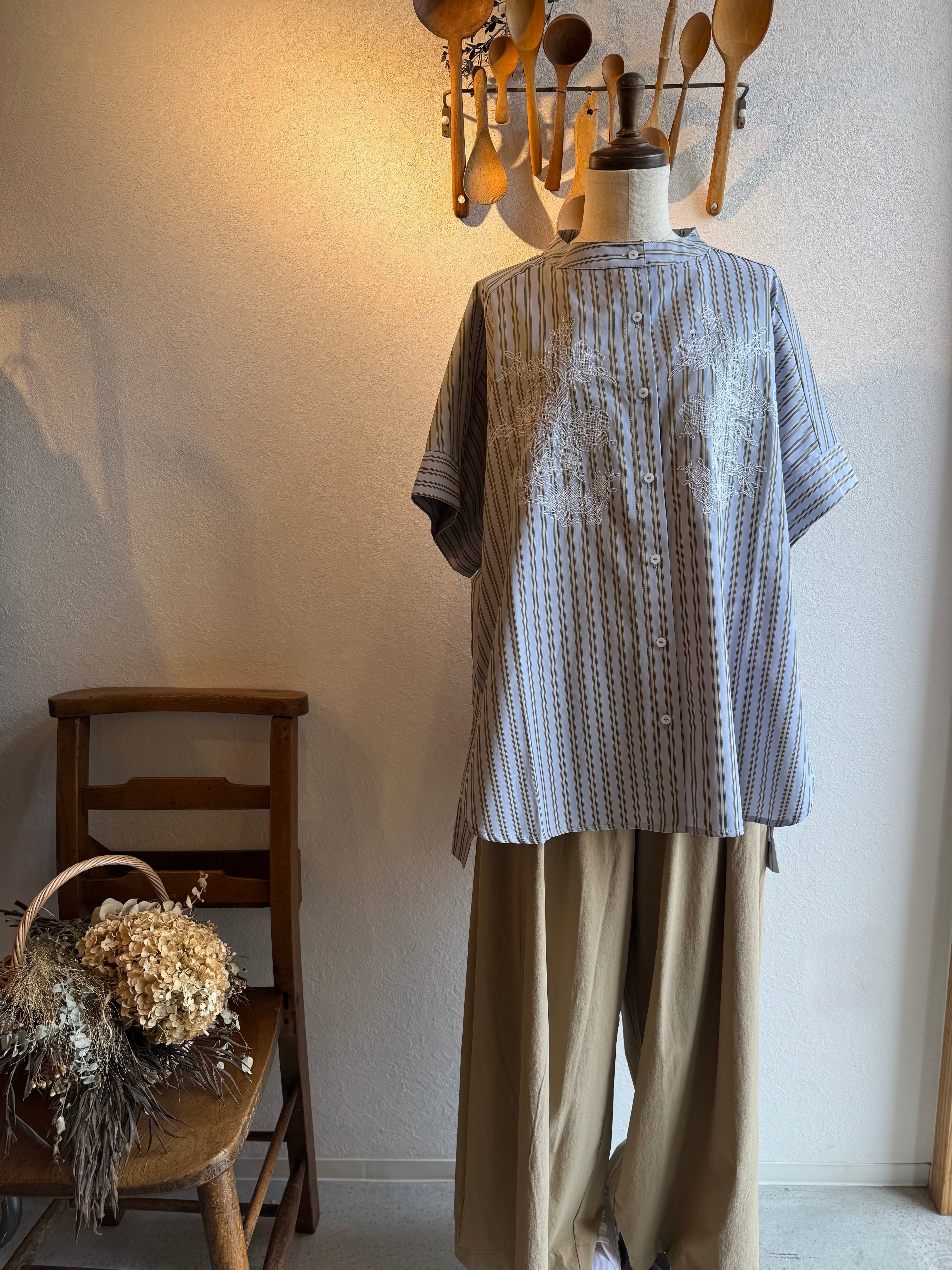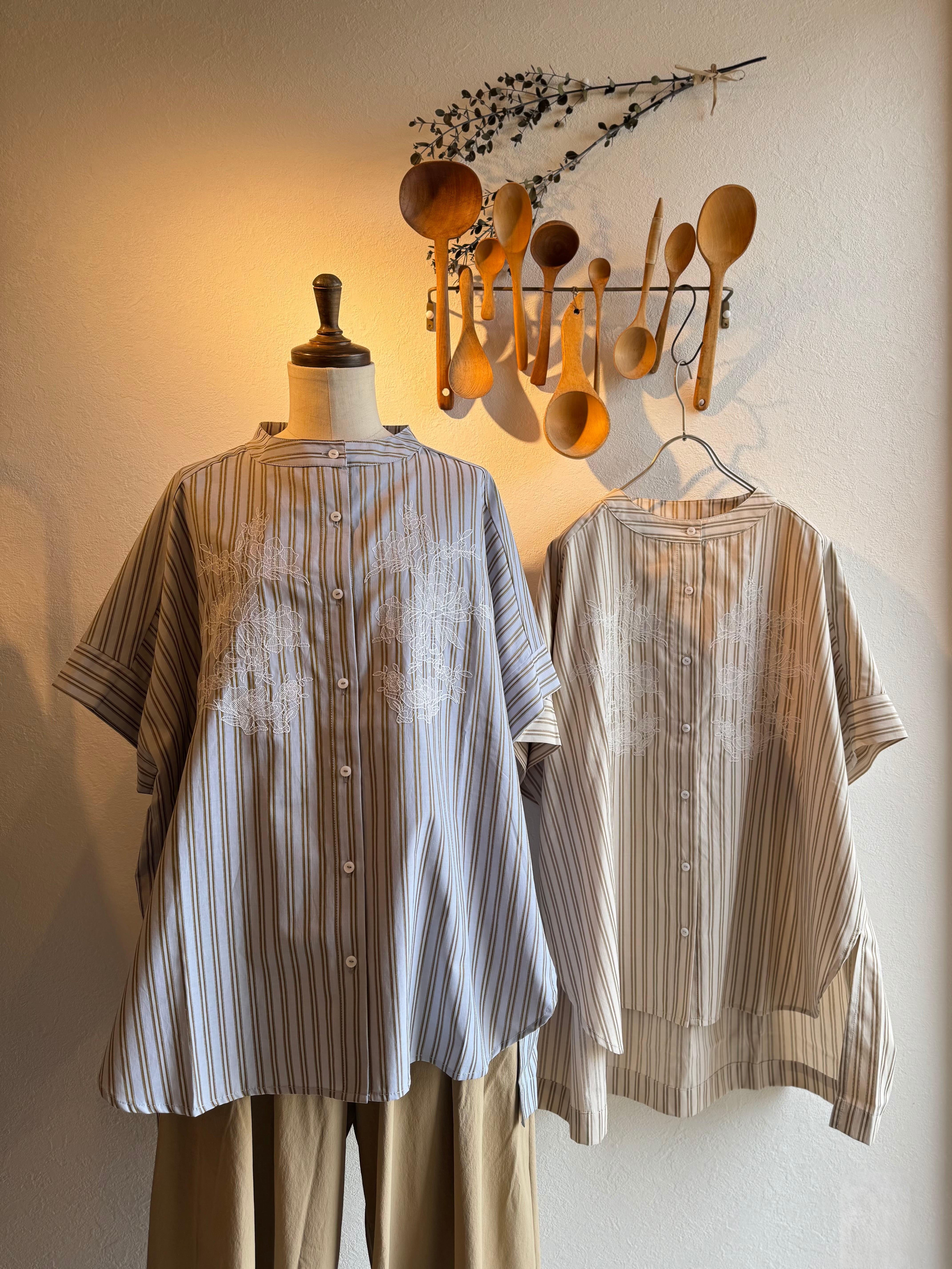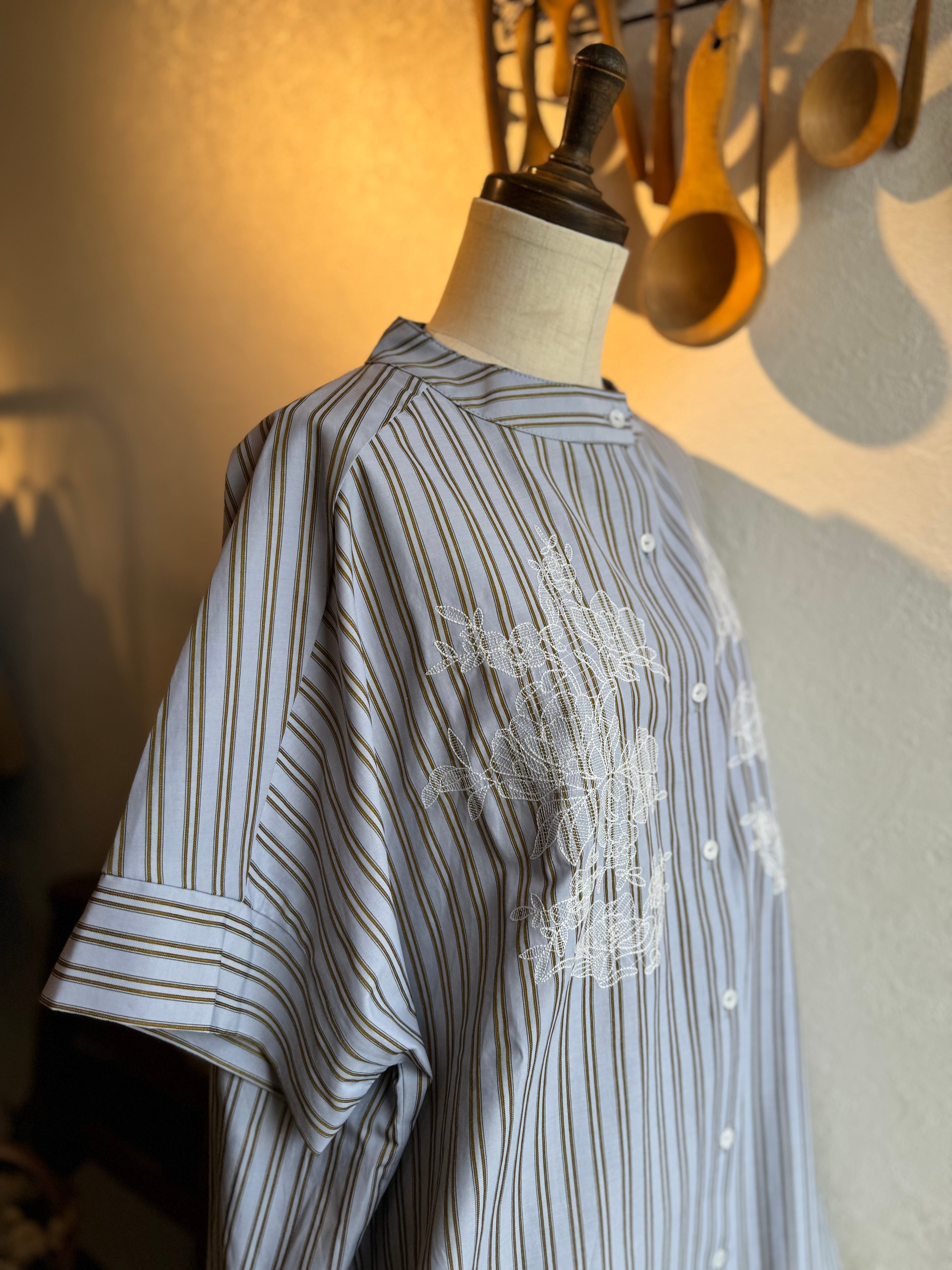 KELEN ストライプ×レース刺繍チュニックシャツ