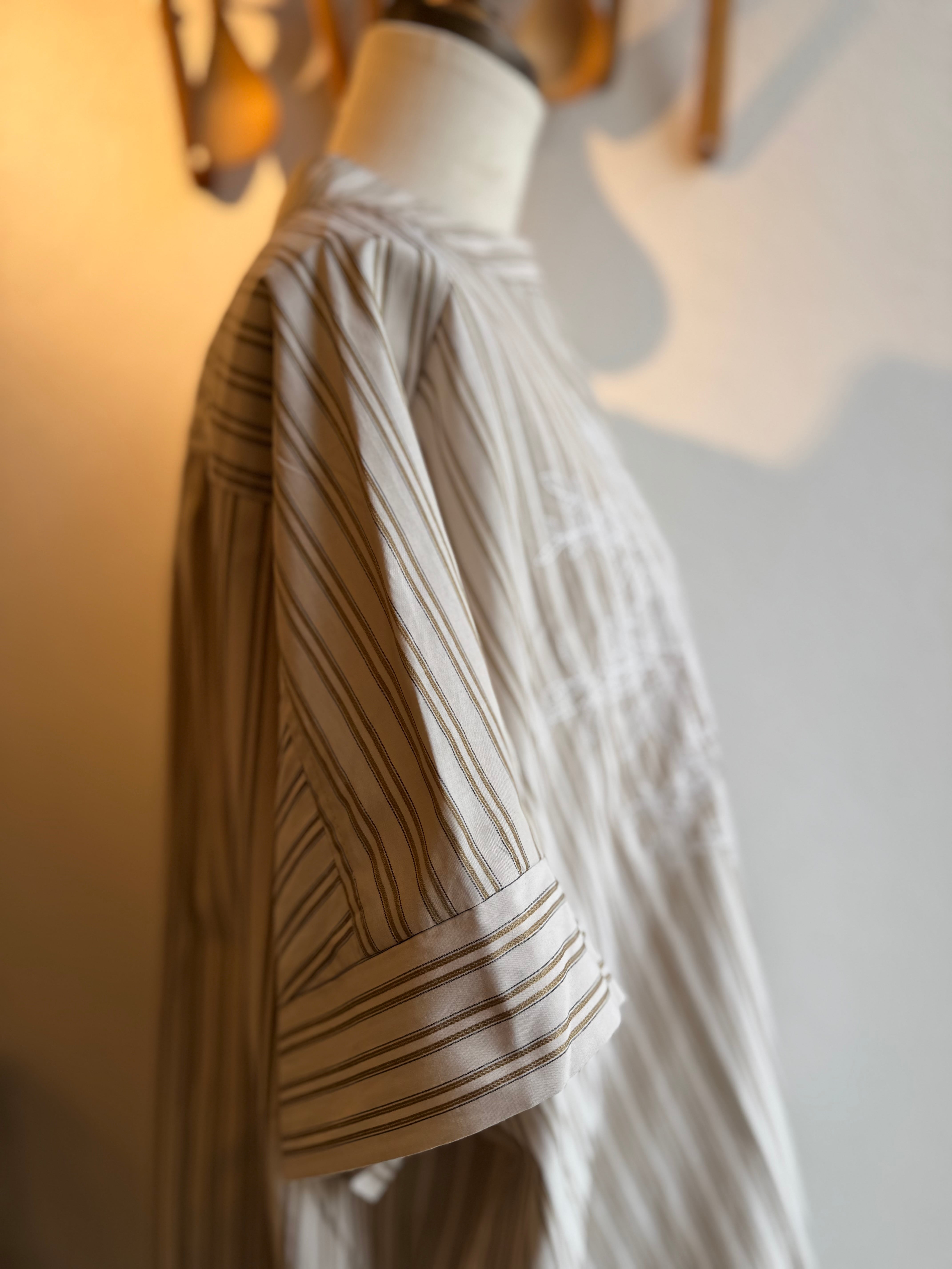 ベースのストライプ生地はツヤ感のあるきれいめな生地でストライプの織り柄がシャープな印象です。襟は広めのネックで少し立ち上がるのですっきりと◎シャープな生地にすっきりとした襟もと、甘めなレース刺繍に抜け感のあるロングシルエット、と様々な雰囲気がミックスされたKELENらしい凝ったデザイン!