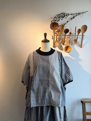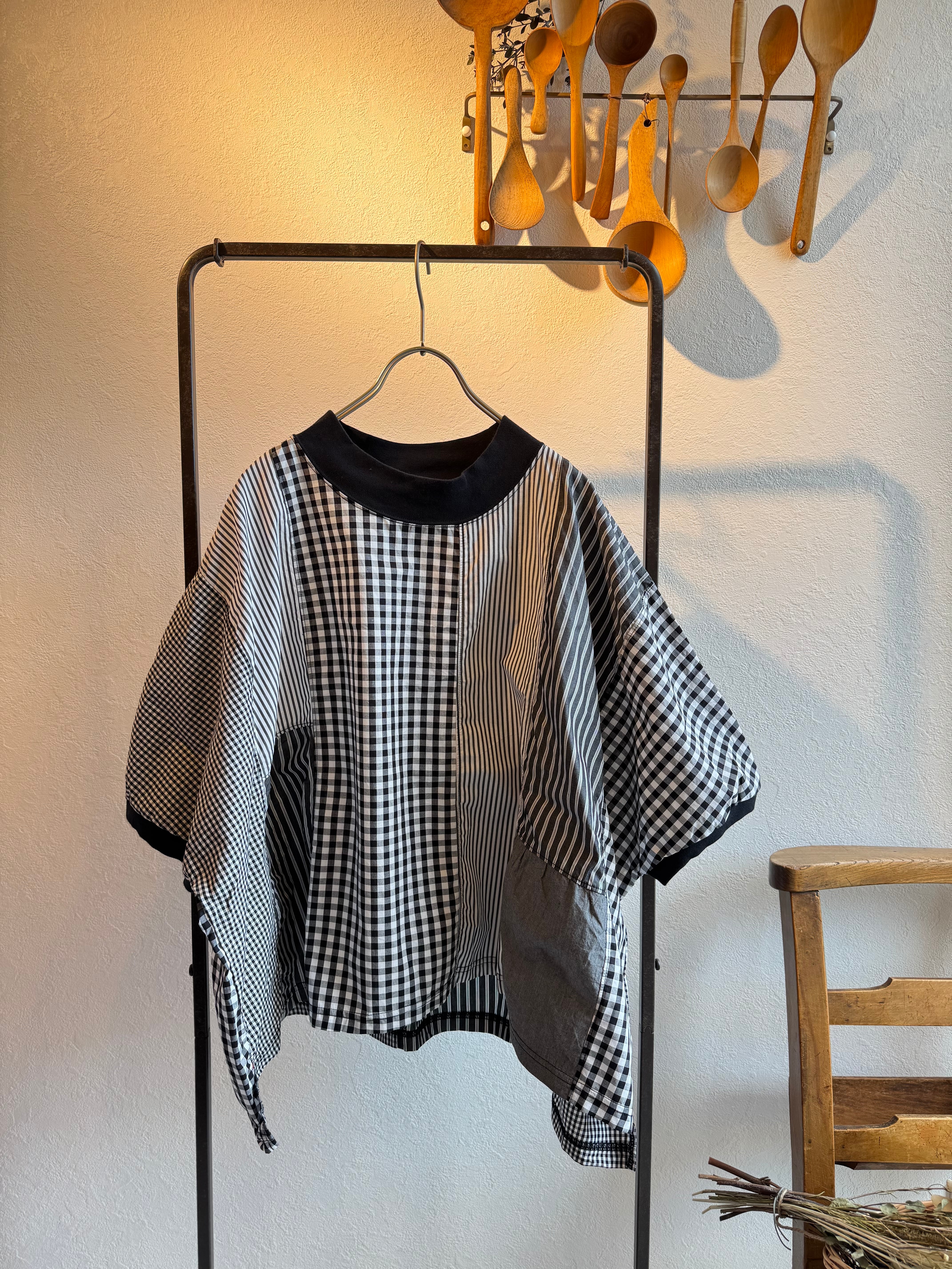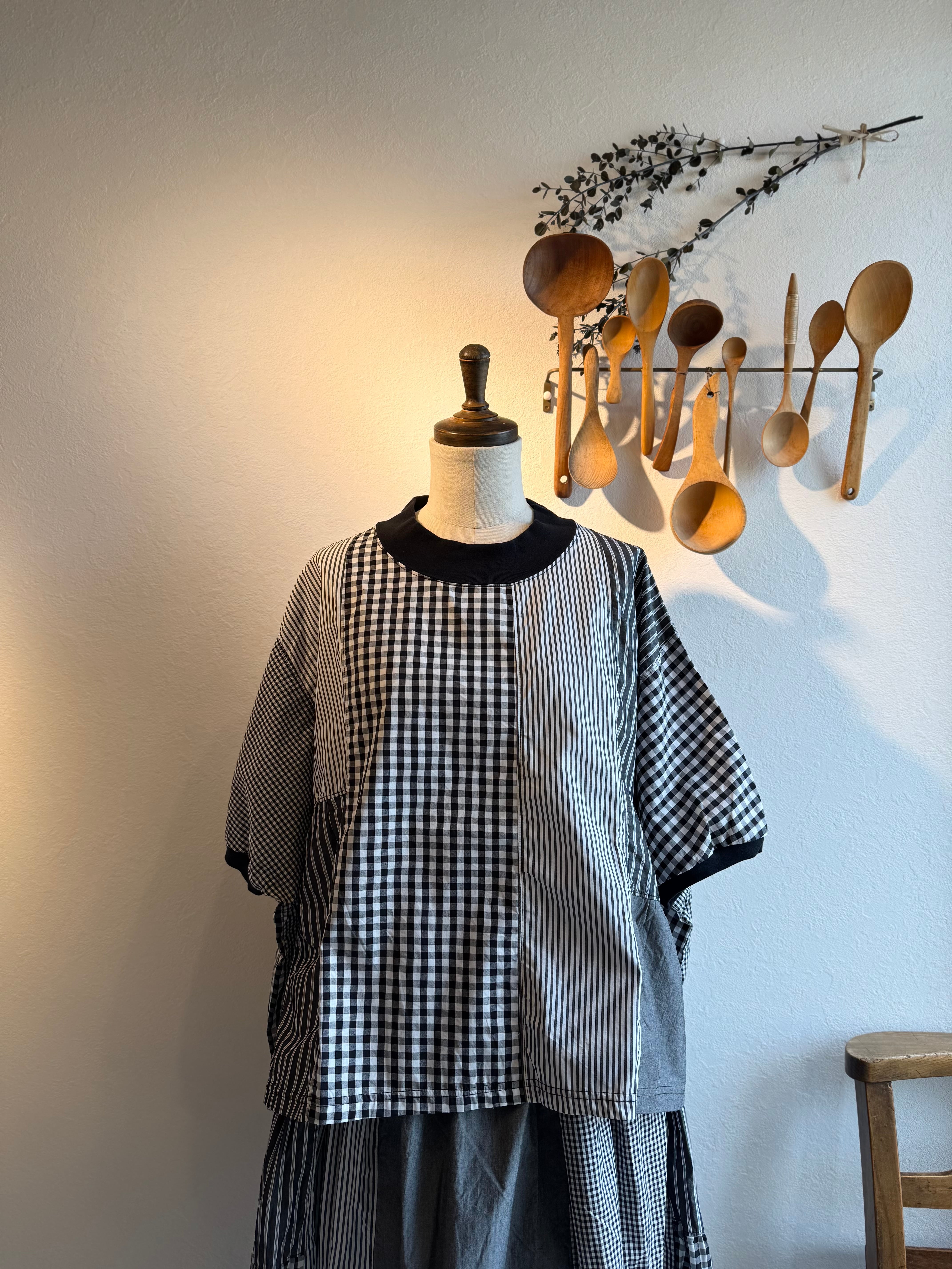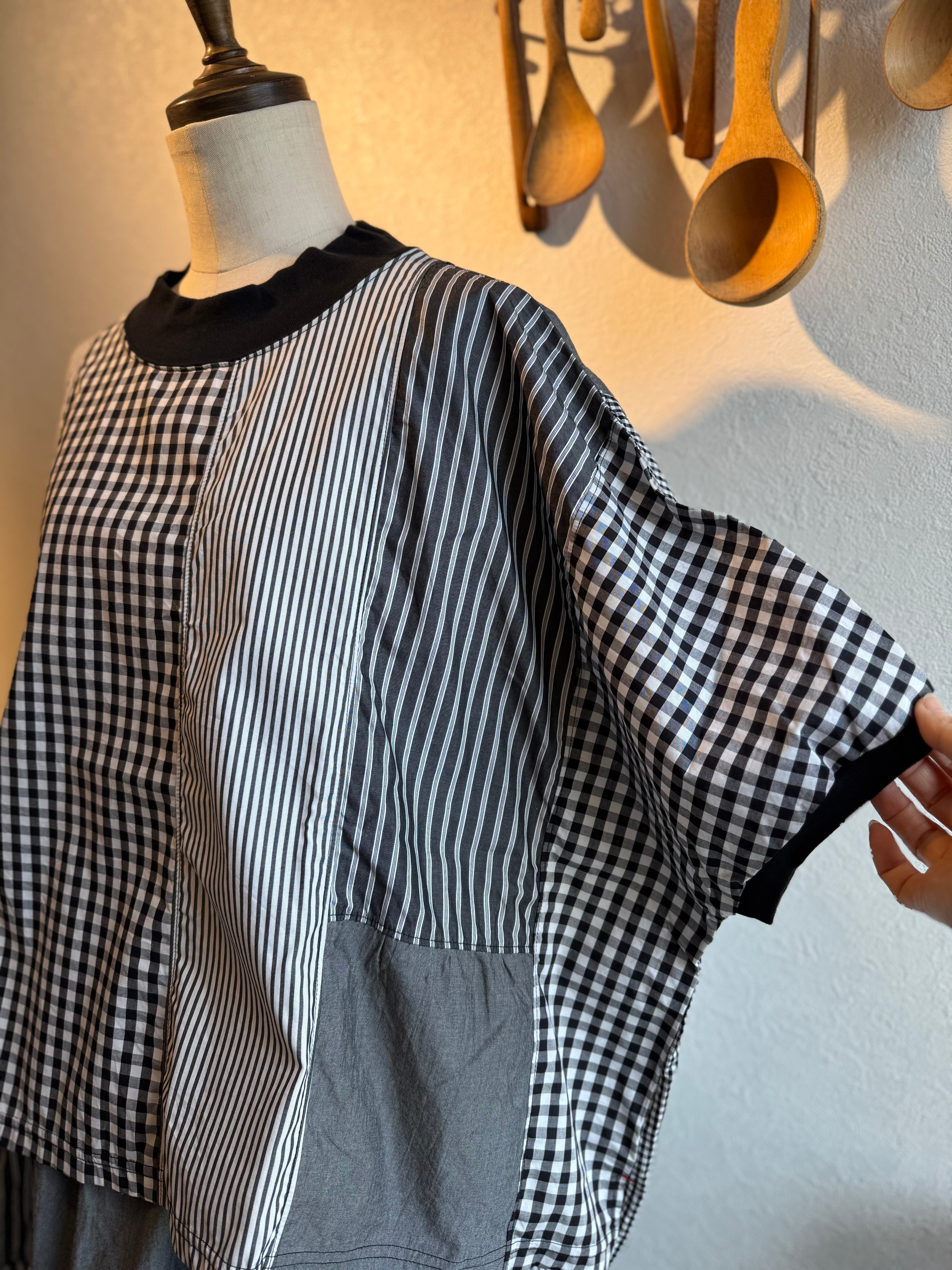 様々な種類の布帛生地を組み合わせてパッチワーク状にしたクラフトパネルブラウス。