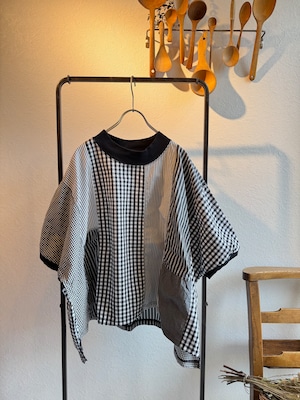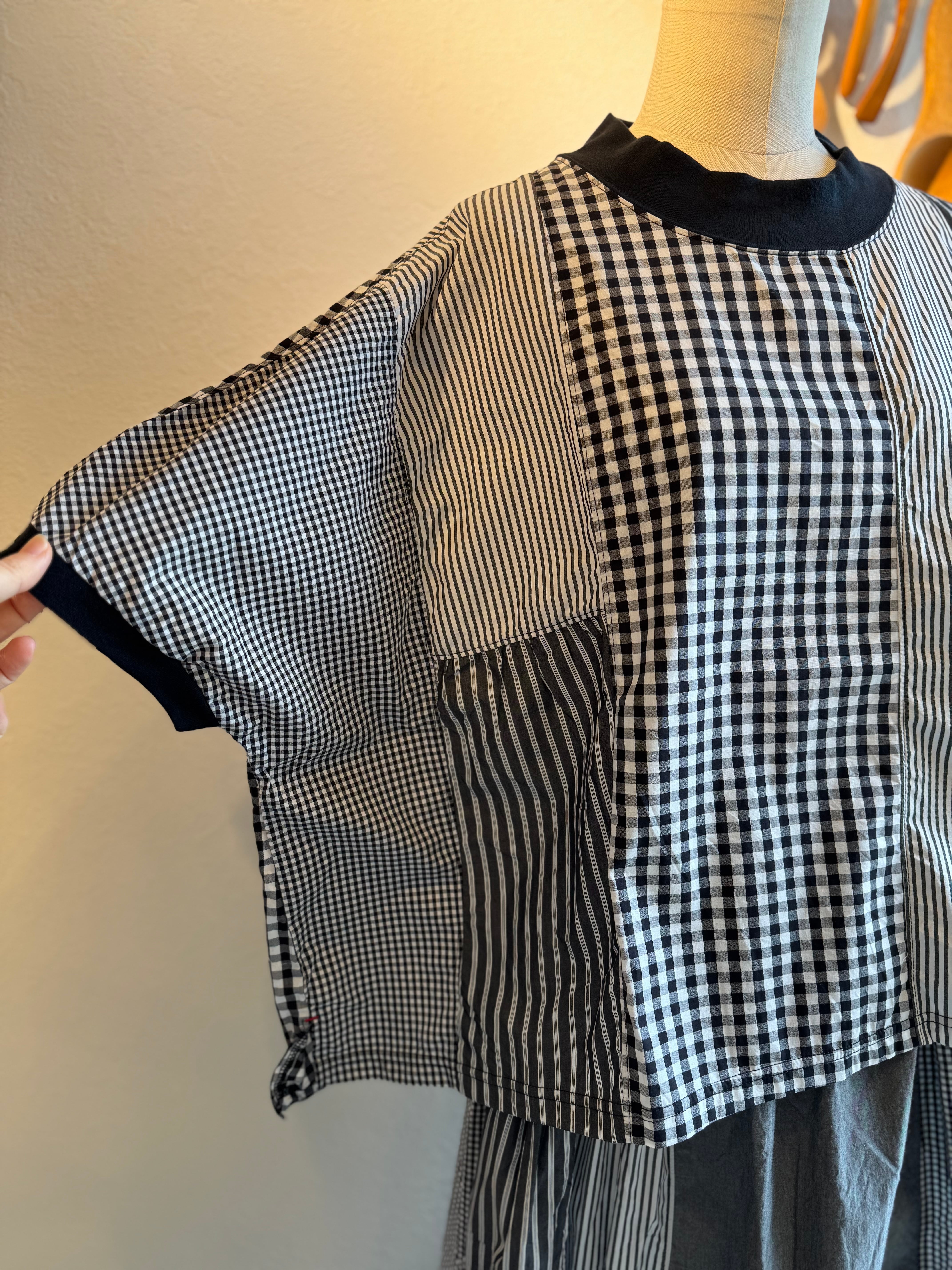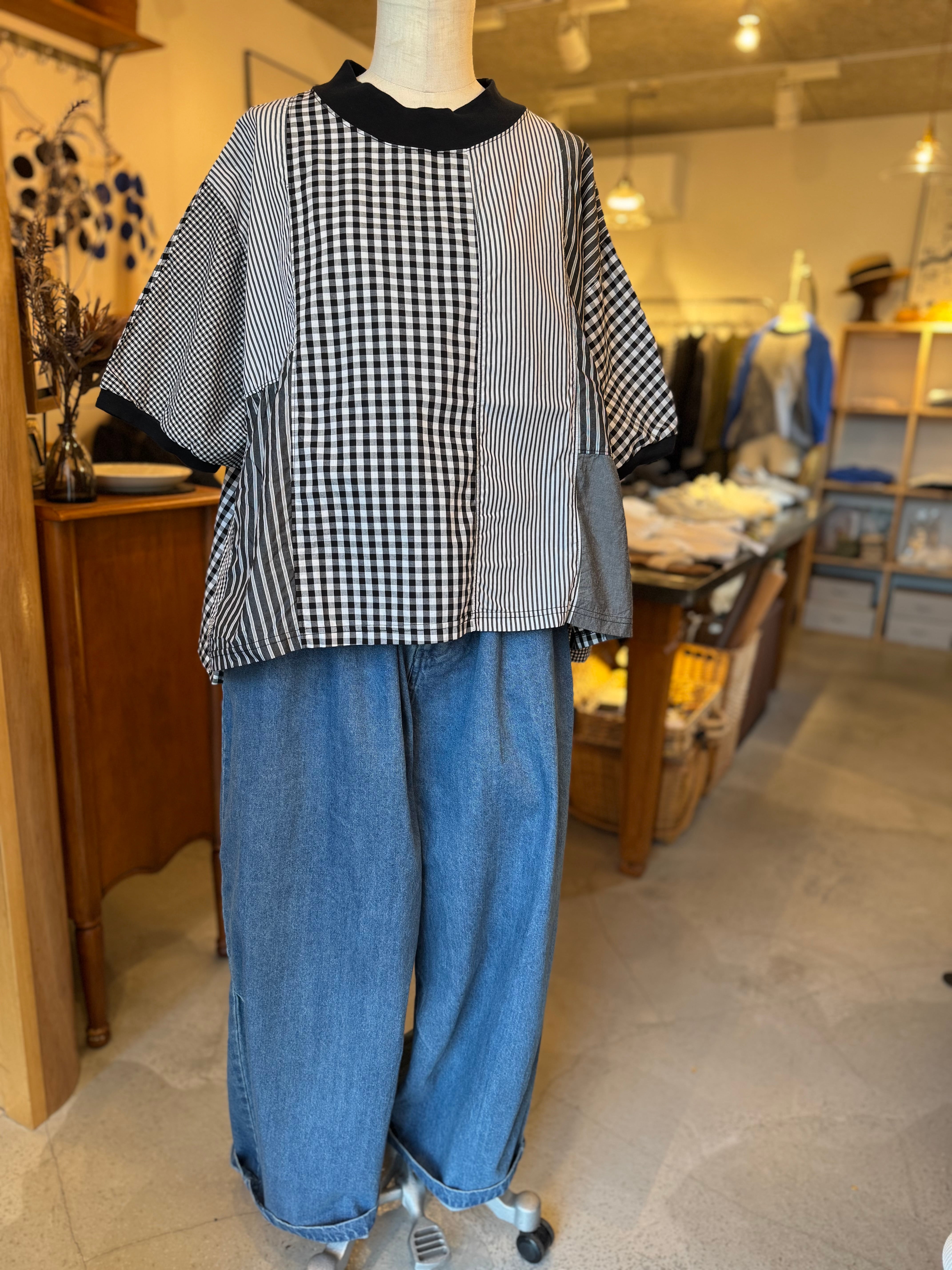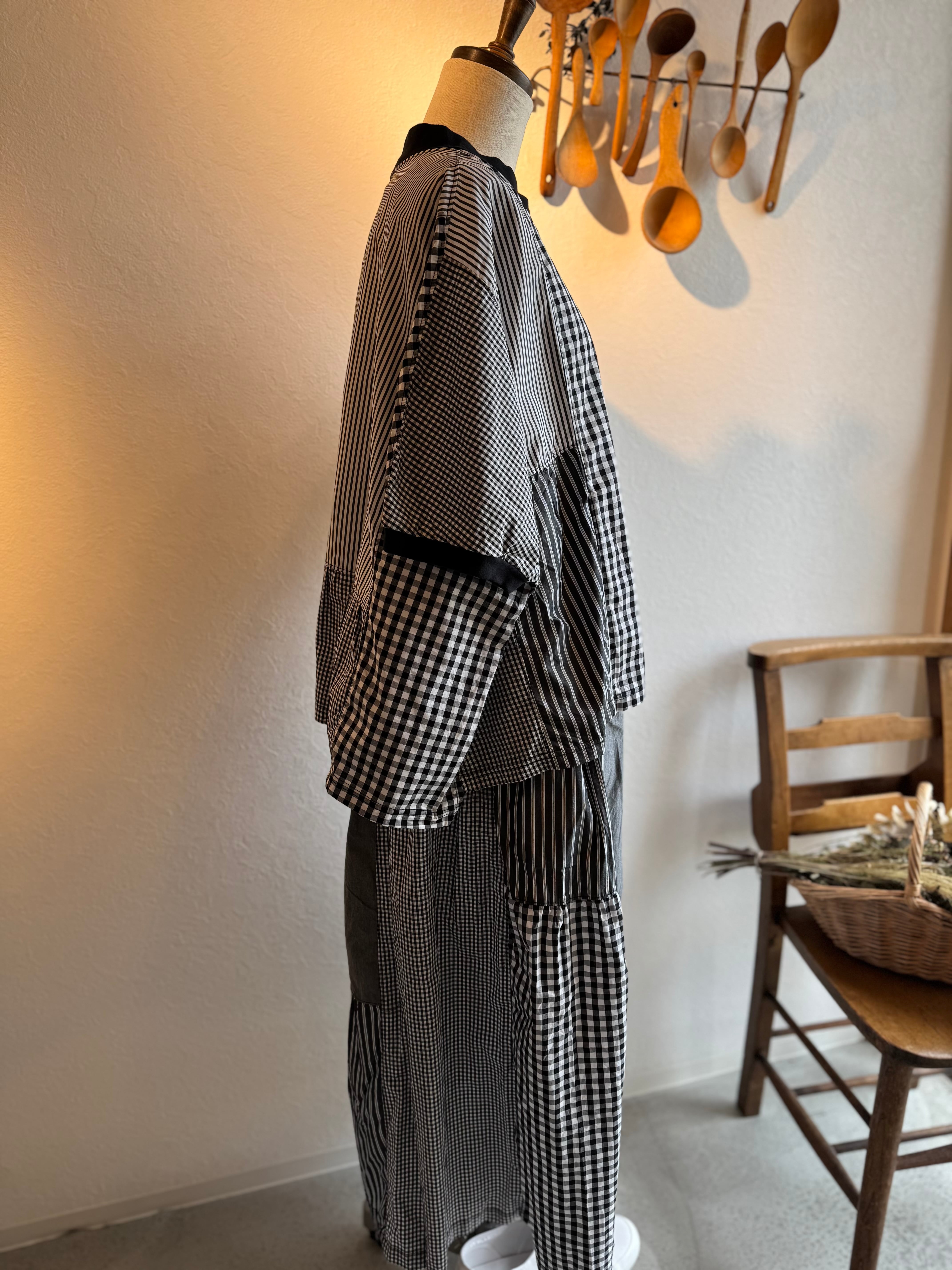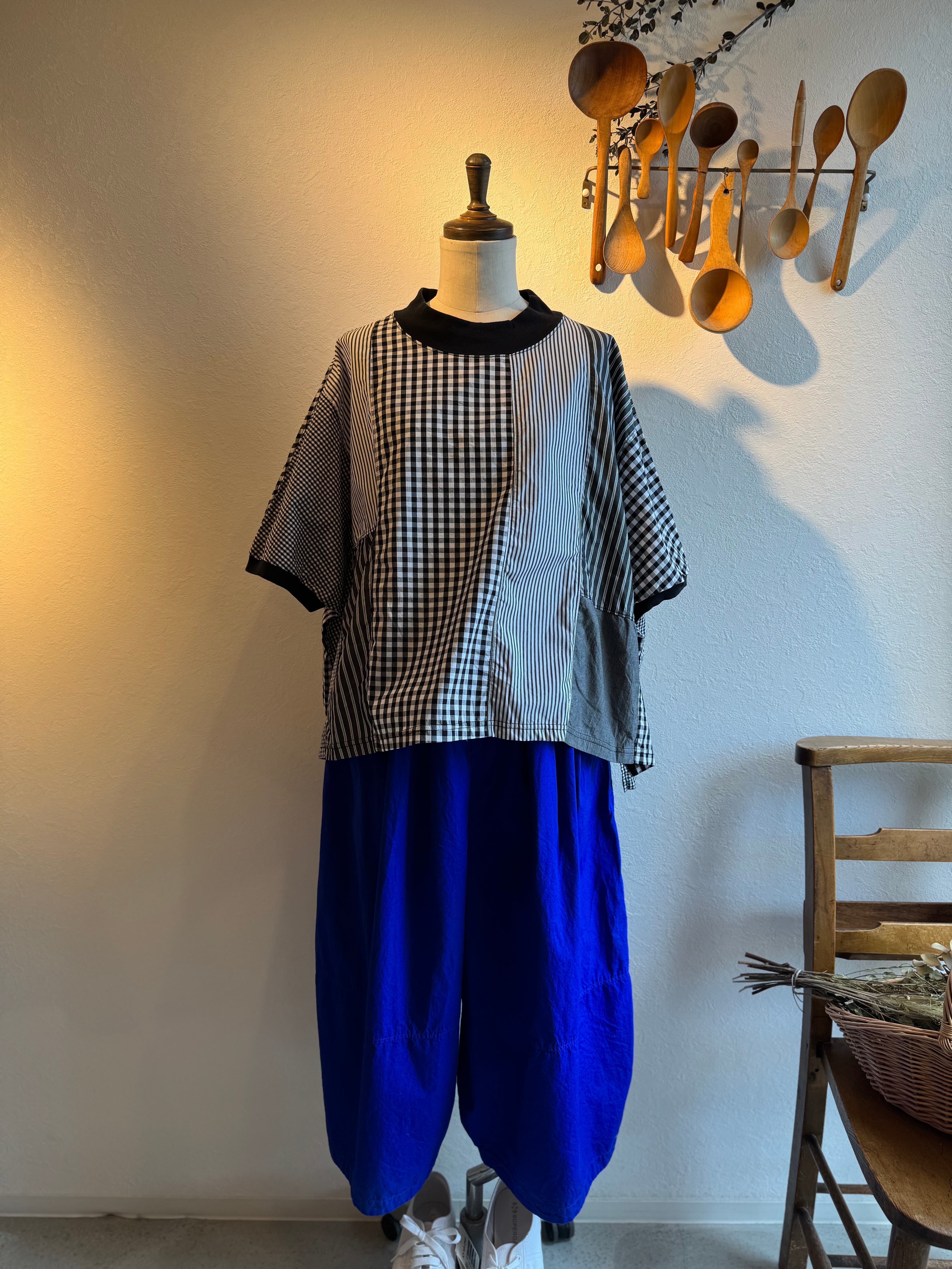 様々な種類の布帛生地を組み合わせてパッチワーク状にしたクラフトパネルブラウス。