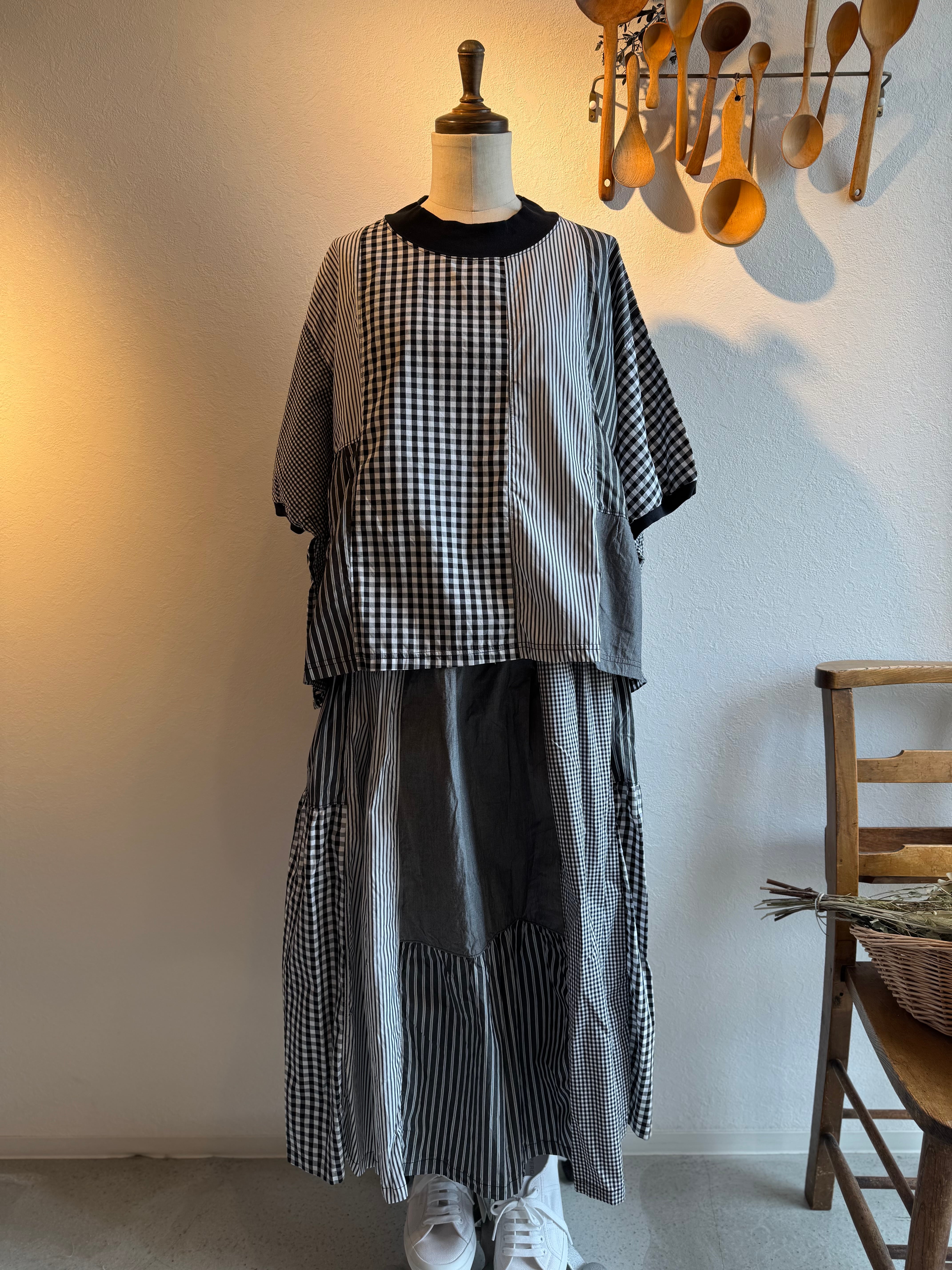 大小チェックや太細ストライプをたくさん組み合わせています。