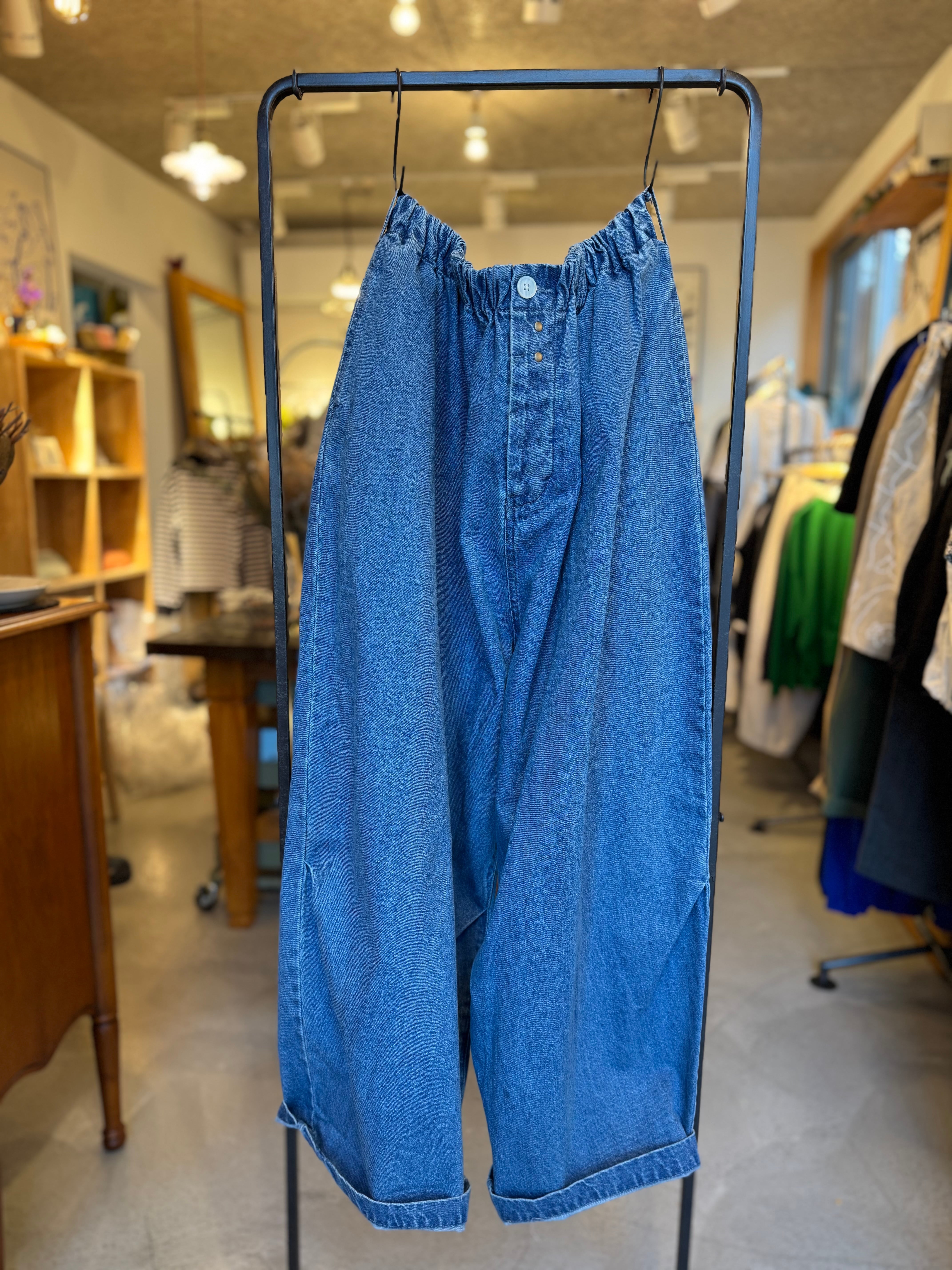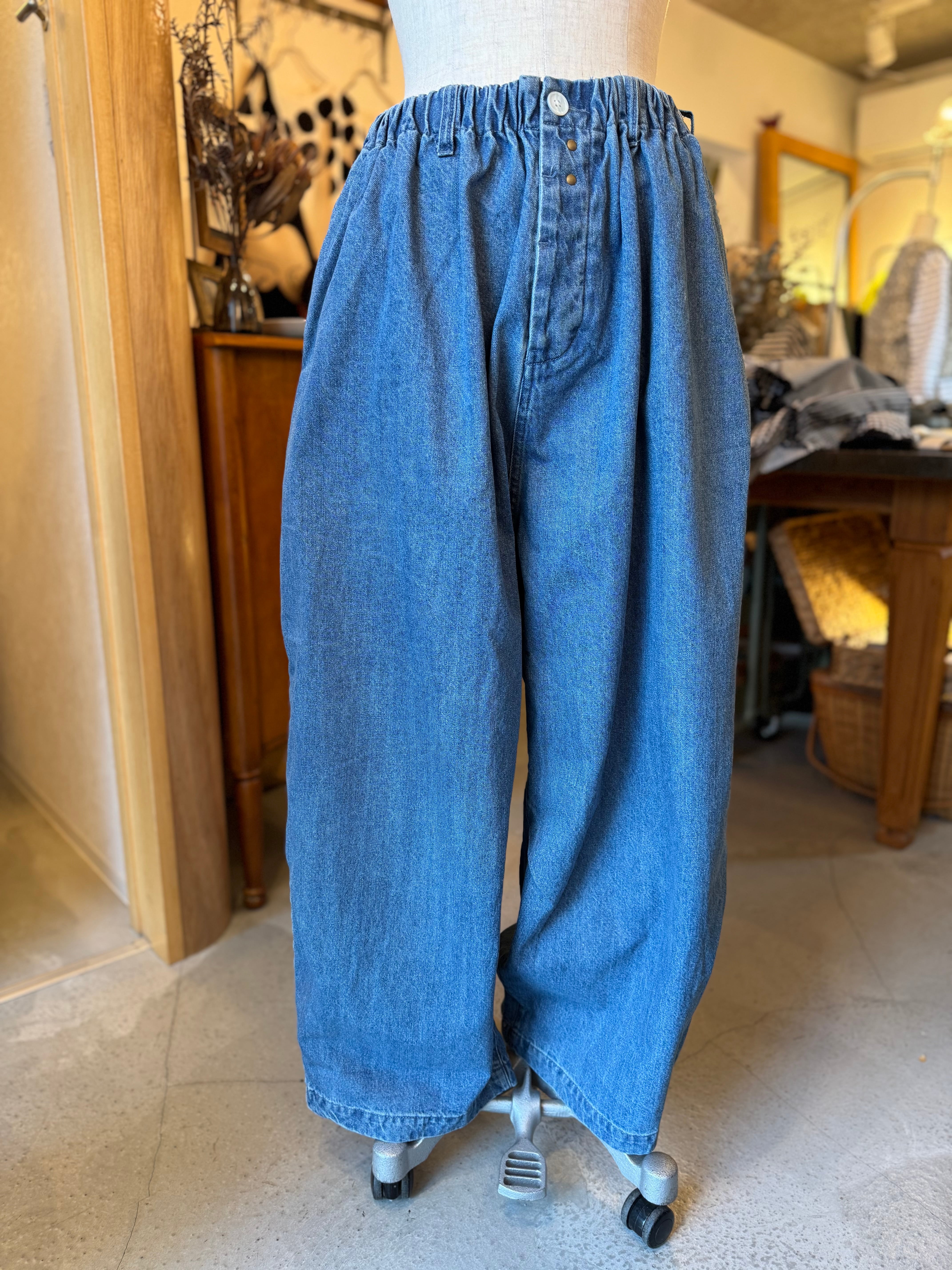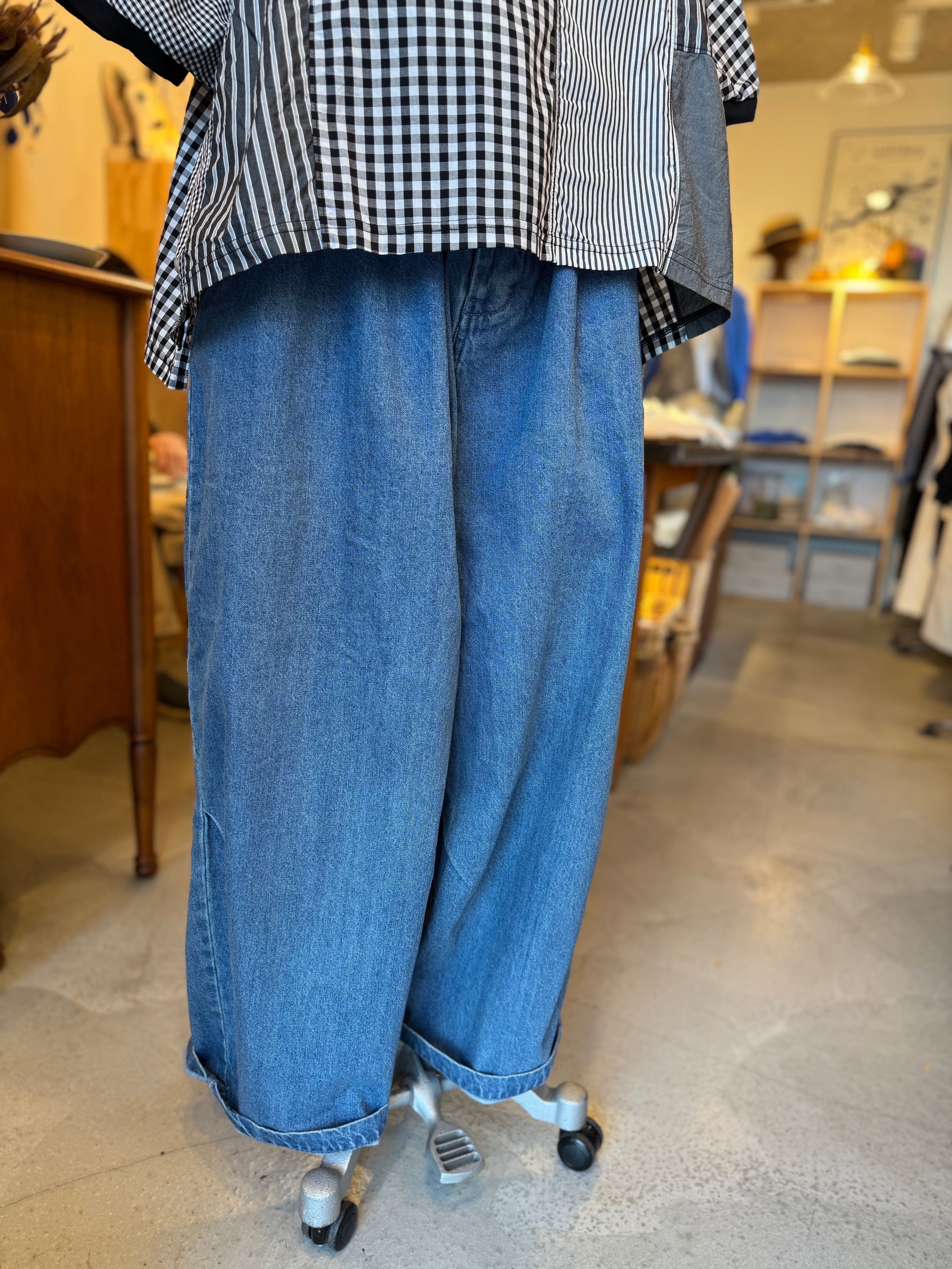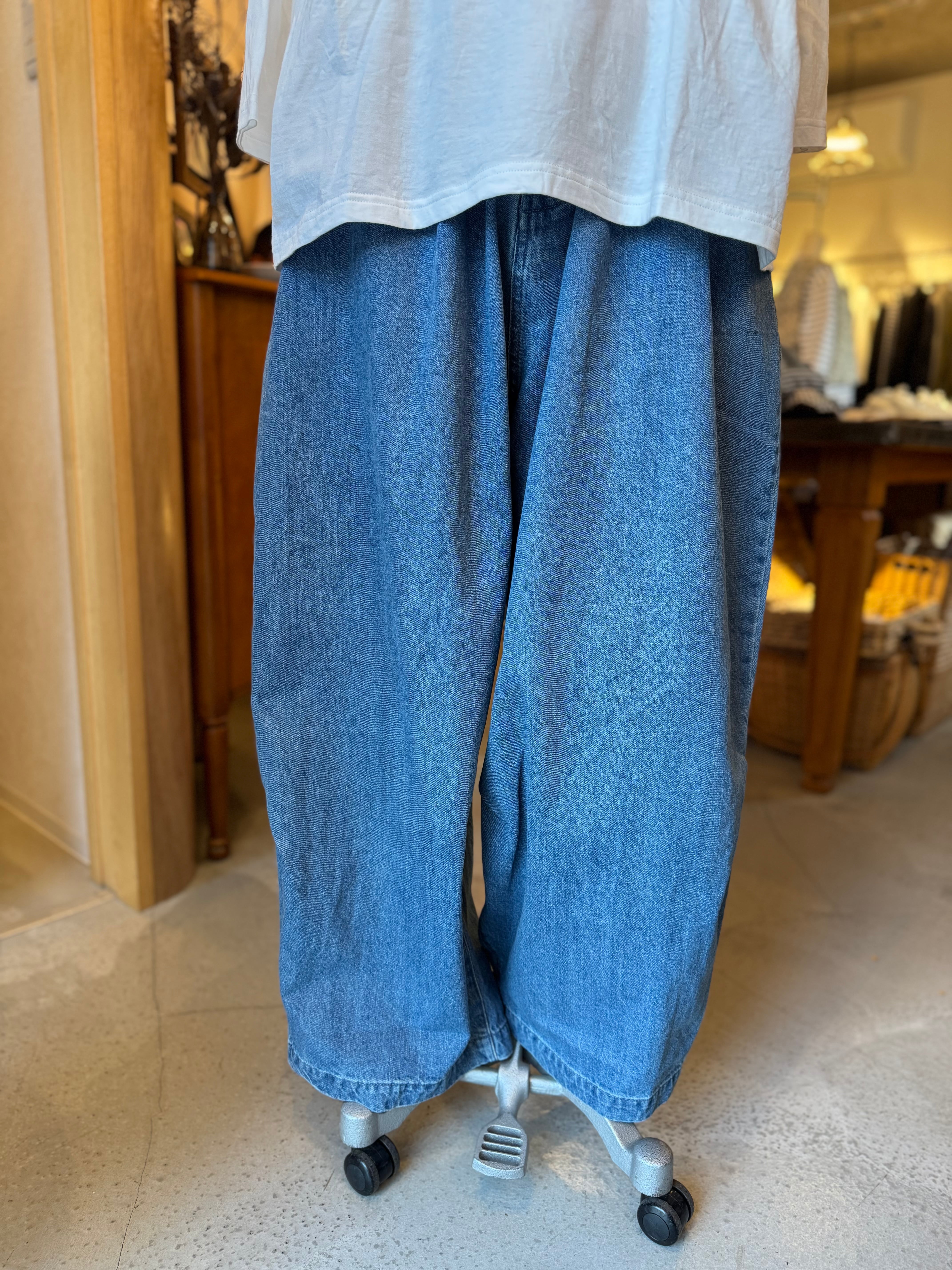 今回は春らしく色落ちさせたライトインディゴです。たくさんのタックやたっぷりとしたシルエットで唯一無二なシルエットはデニムになっても変わりません!
