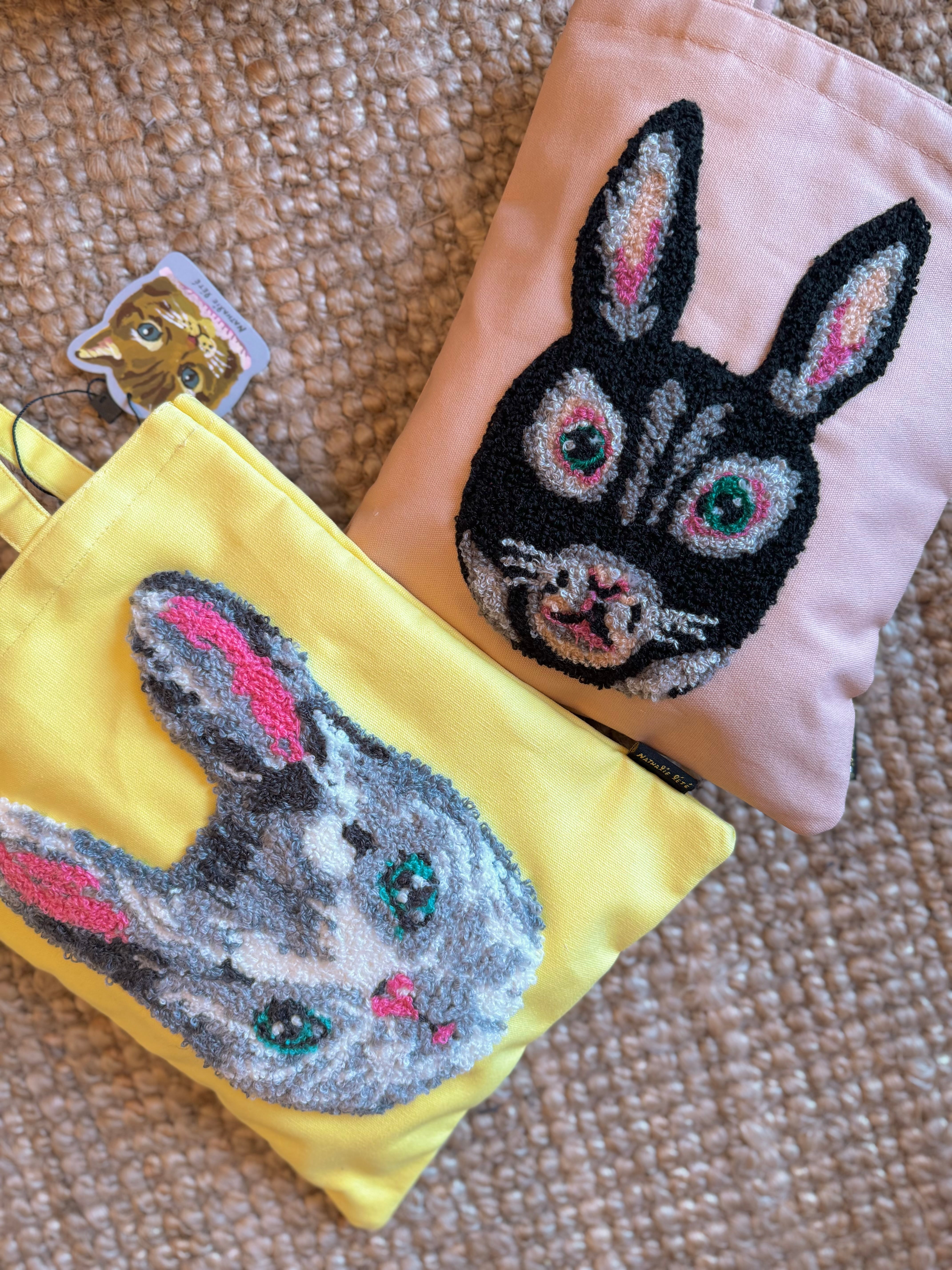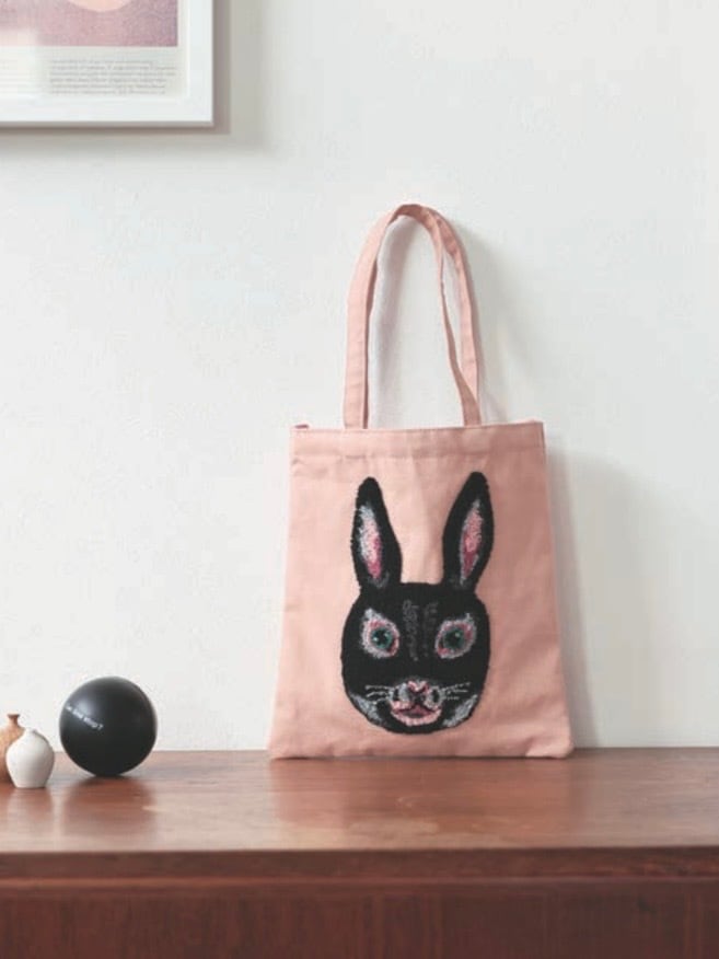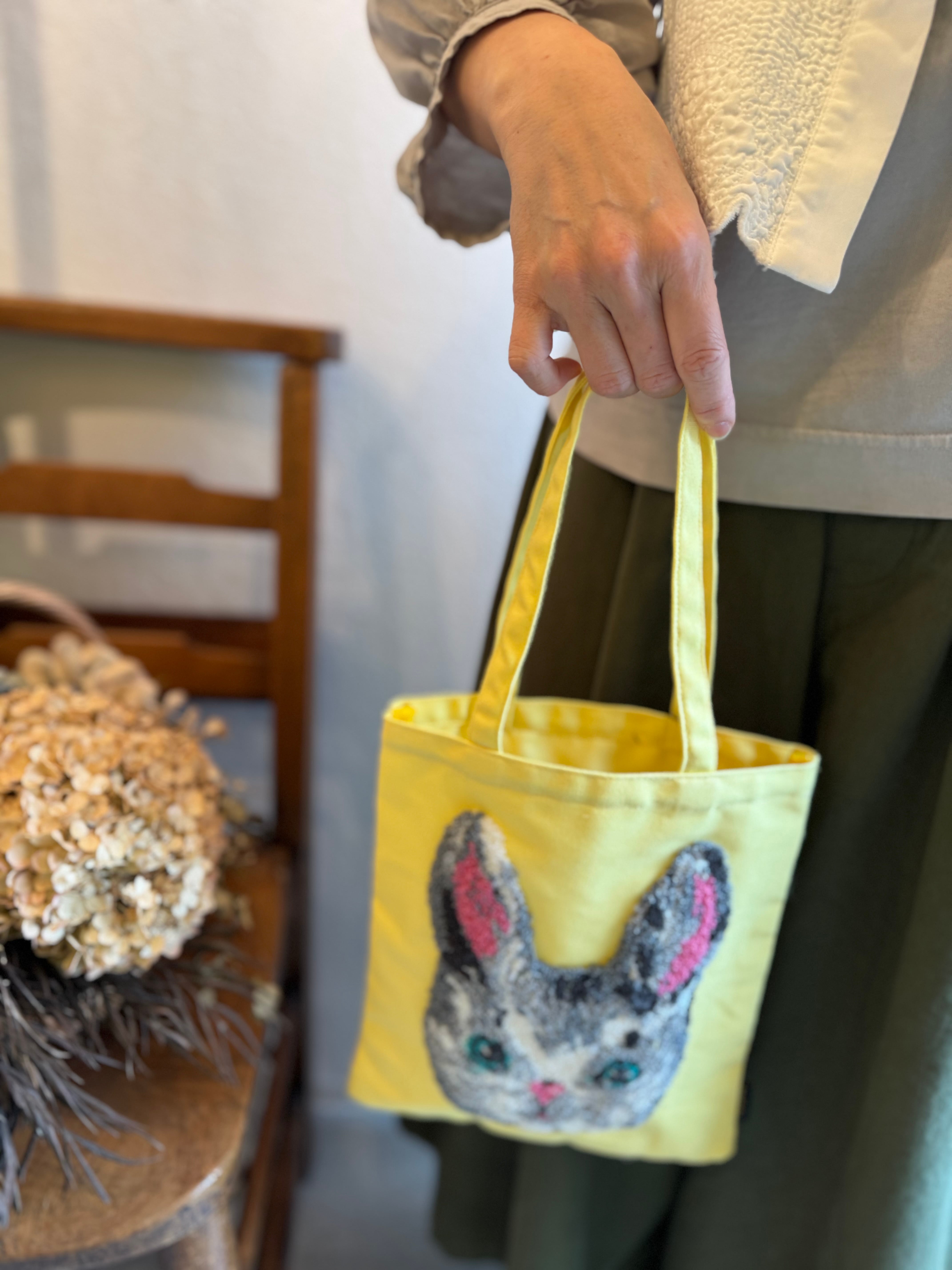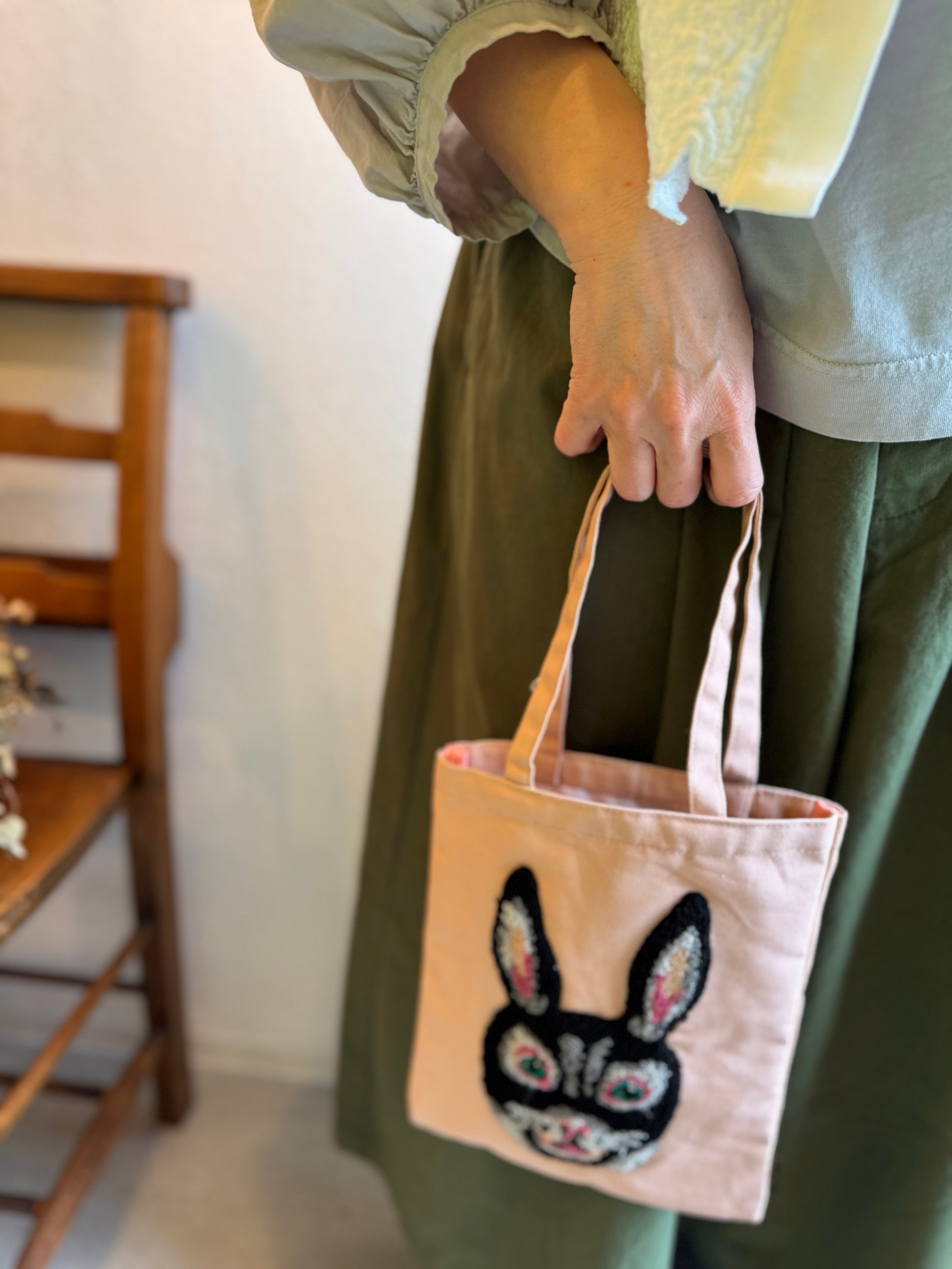 ムクムクと立体感のある刺繍で描かれたウサギ。きらりと光るような目が印象的です!