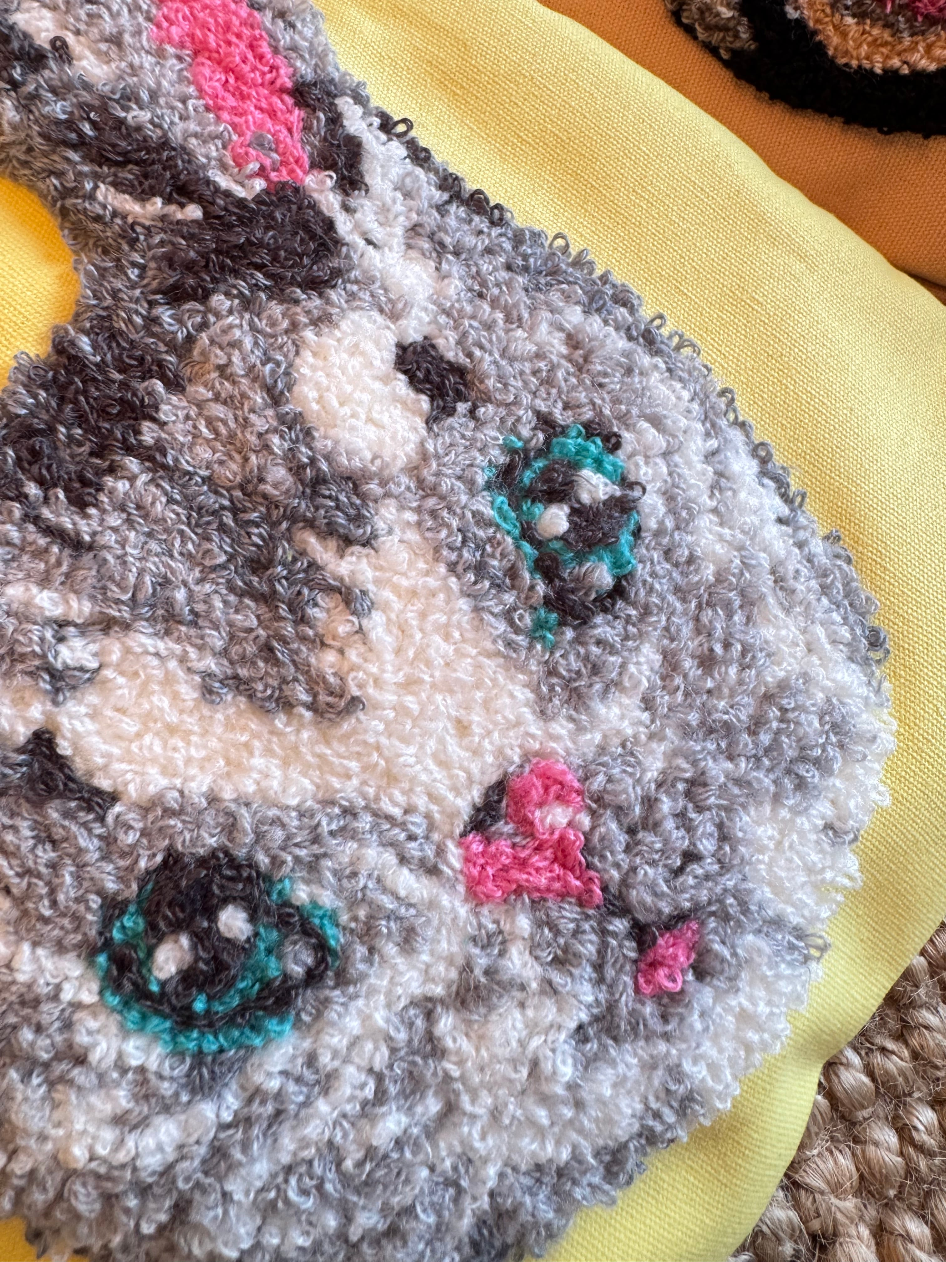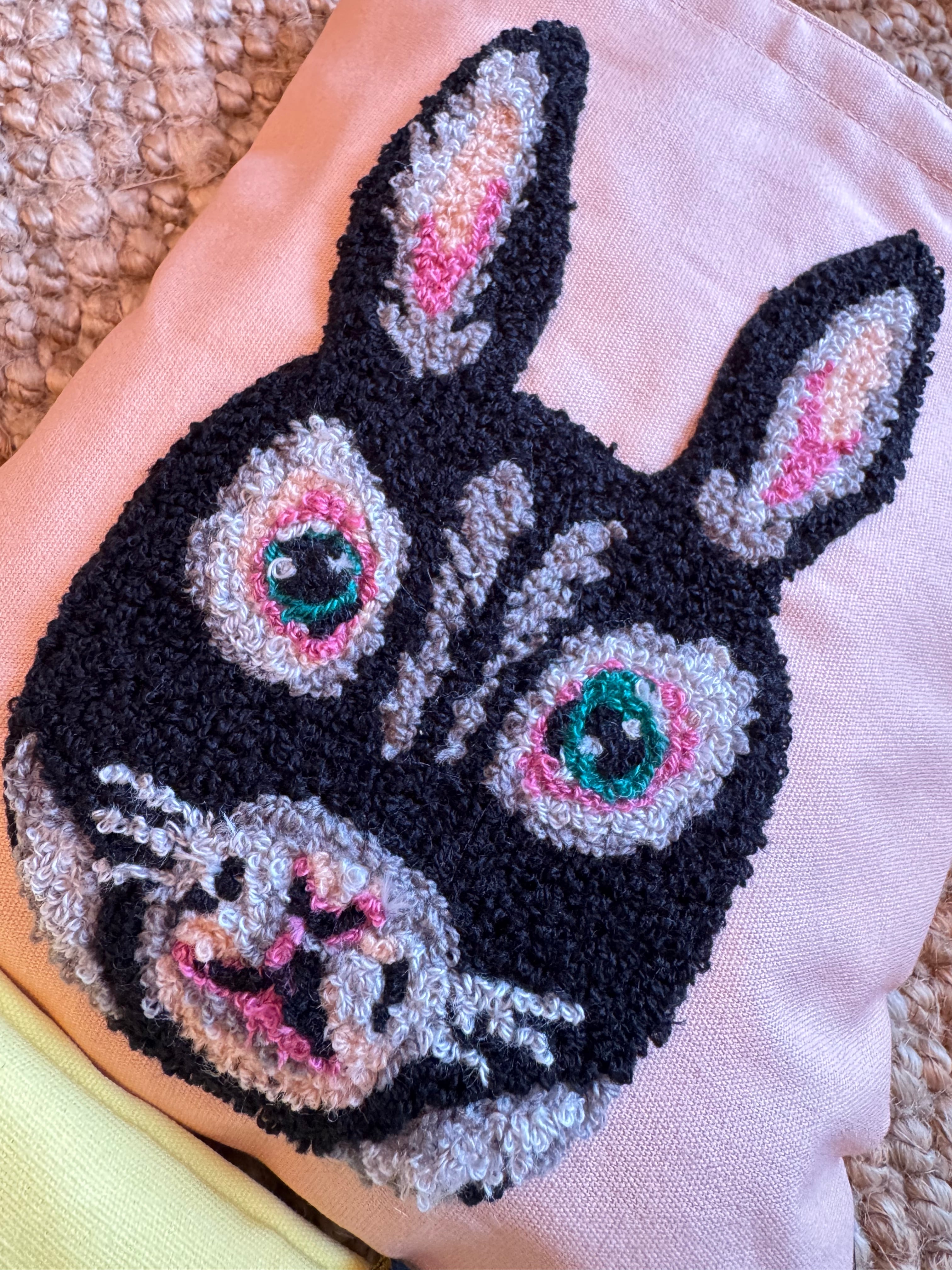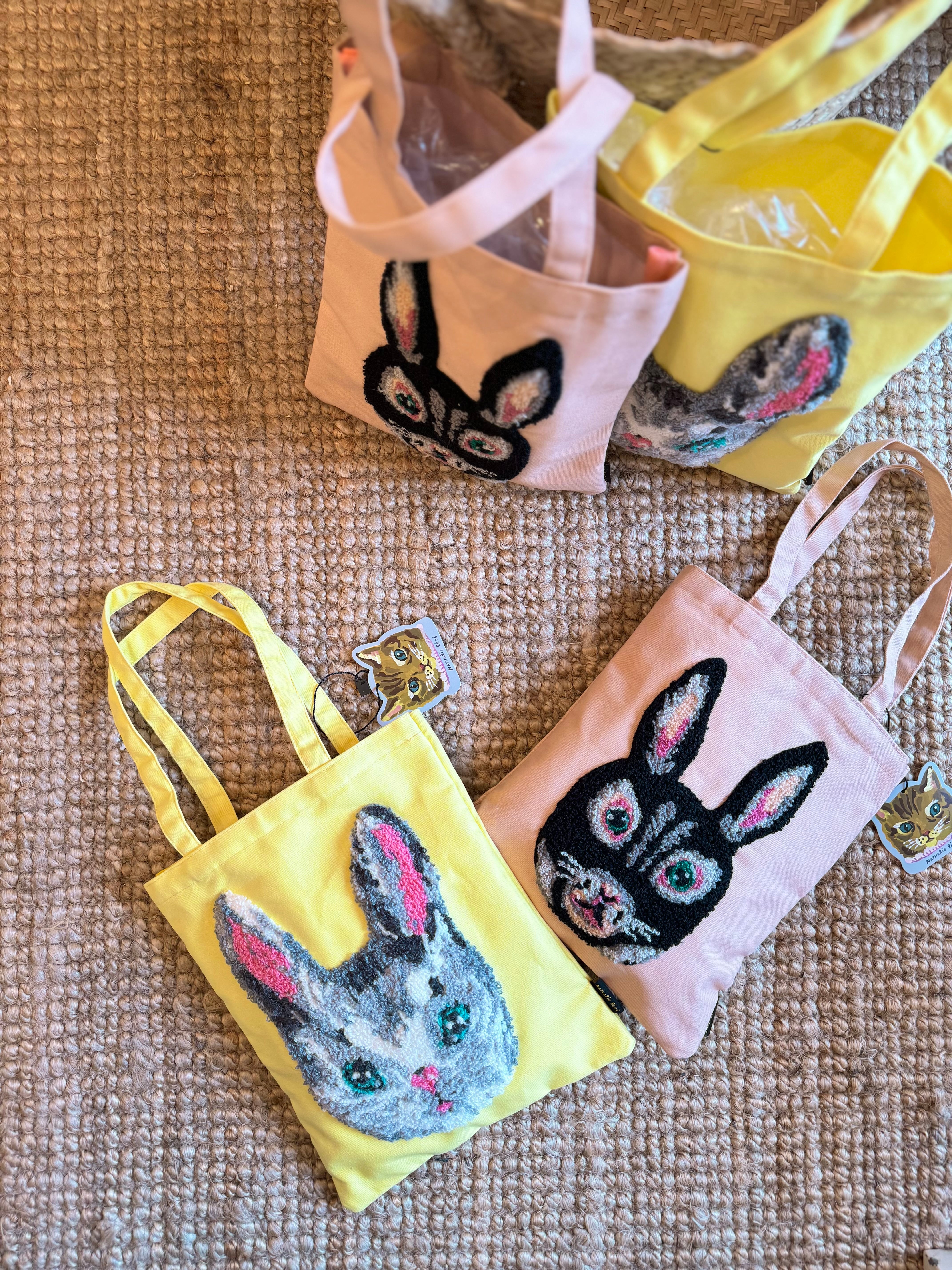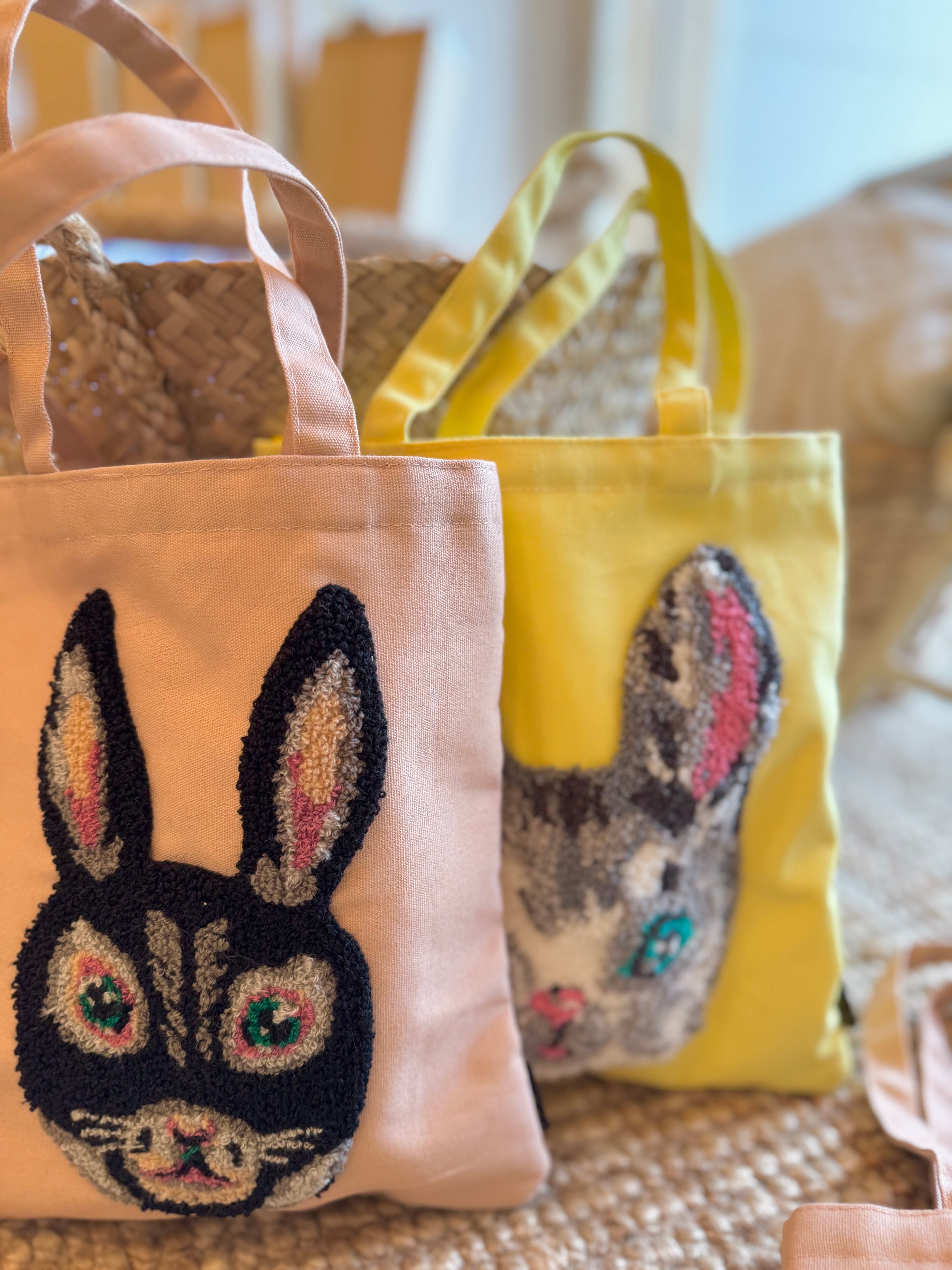ムクムクと立体感のある刺繍で描かれたウサギ。きらりと光るような目が印象的です!