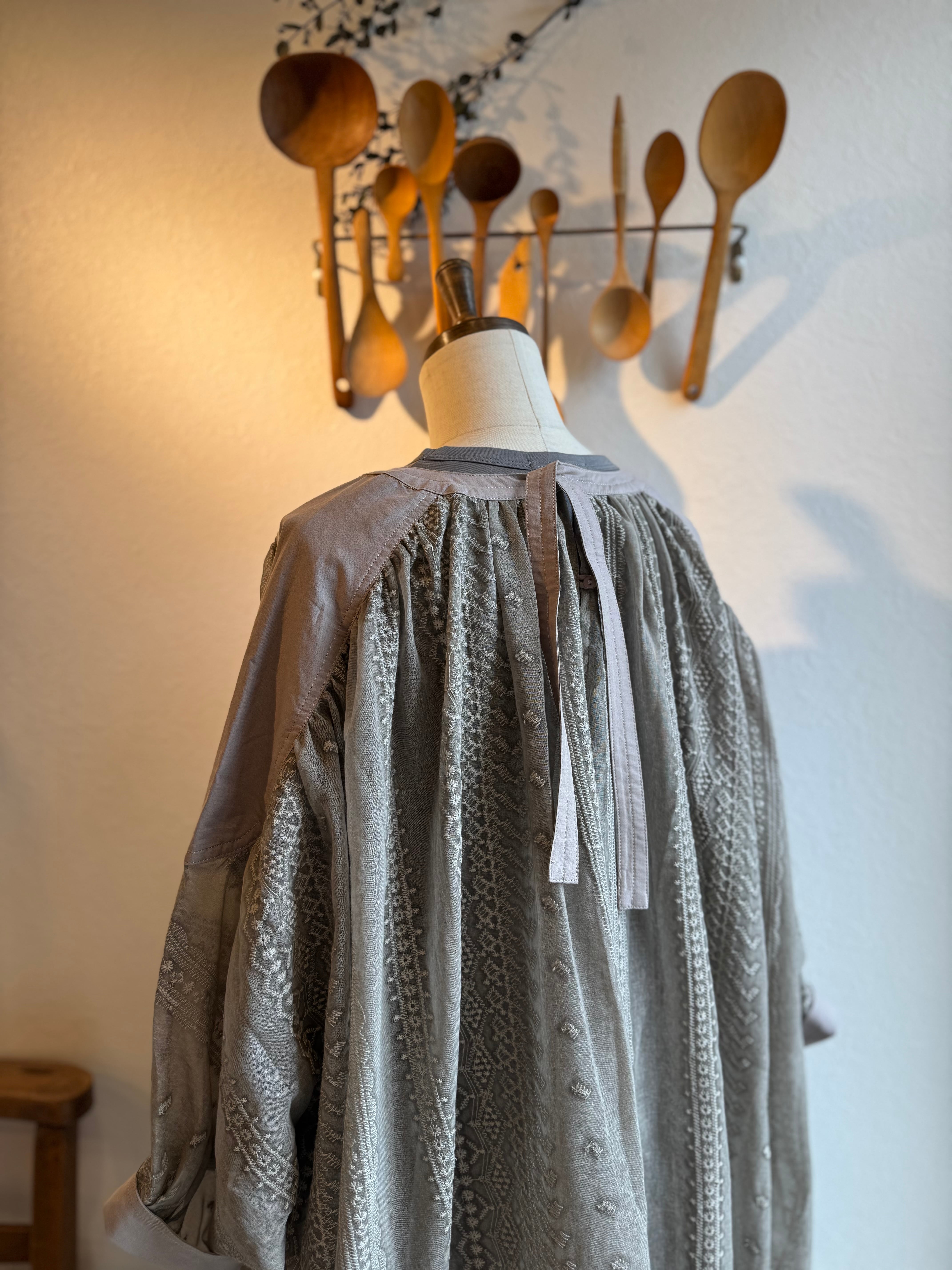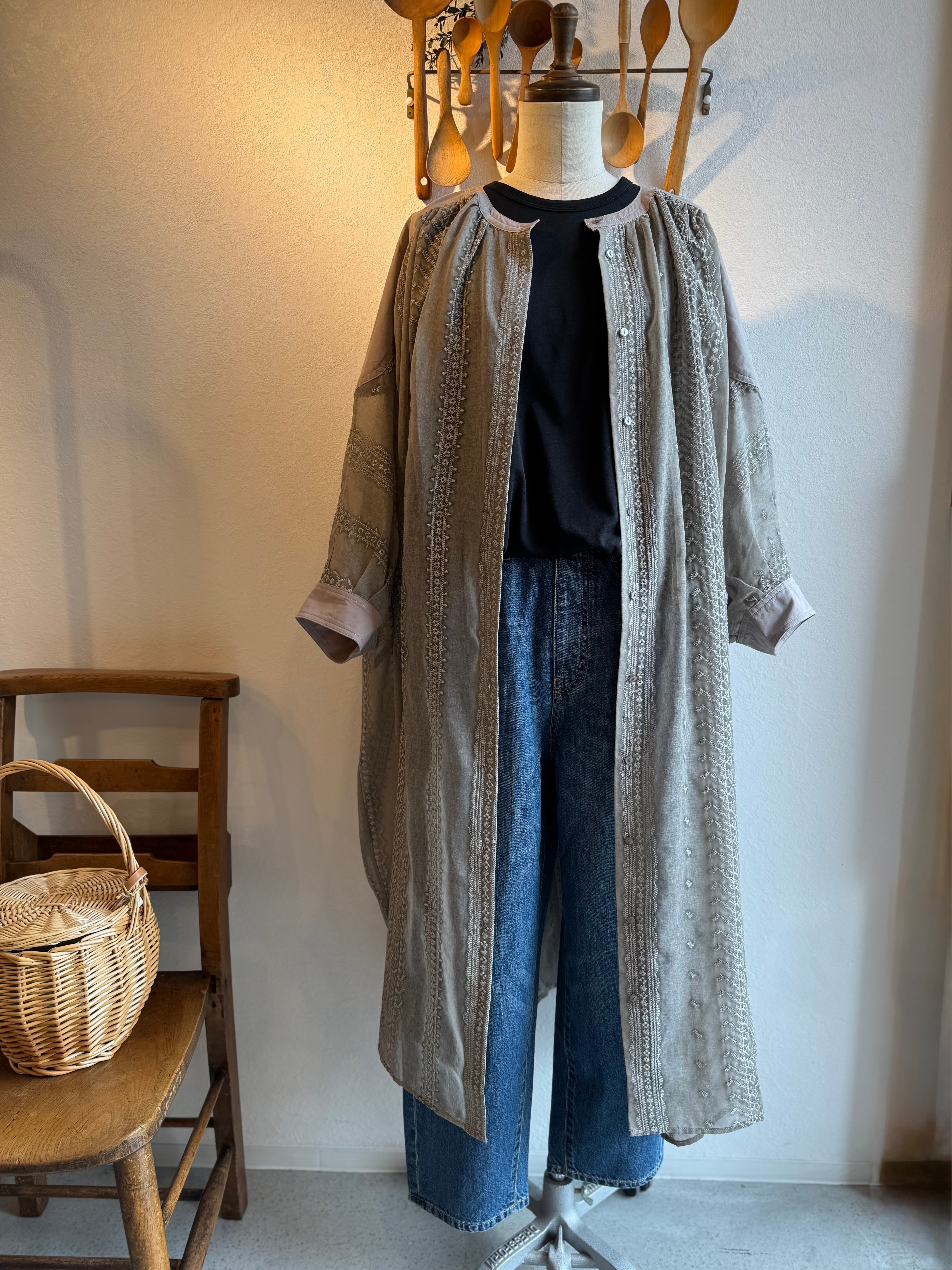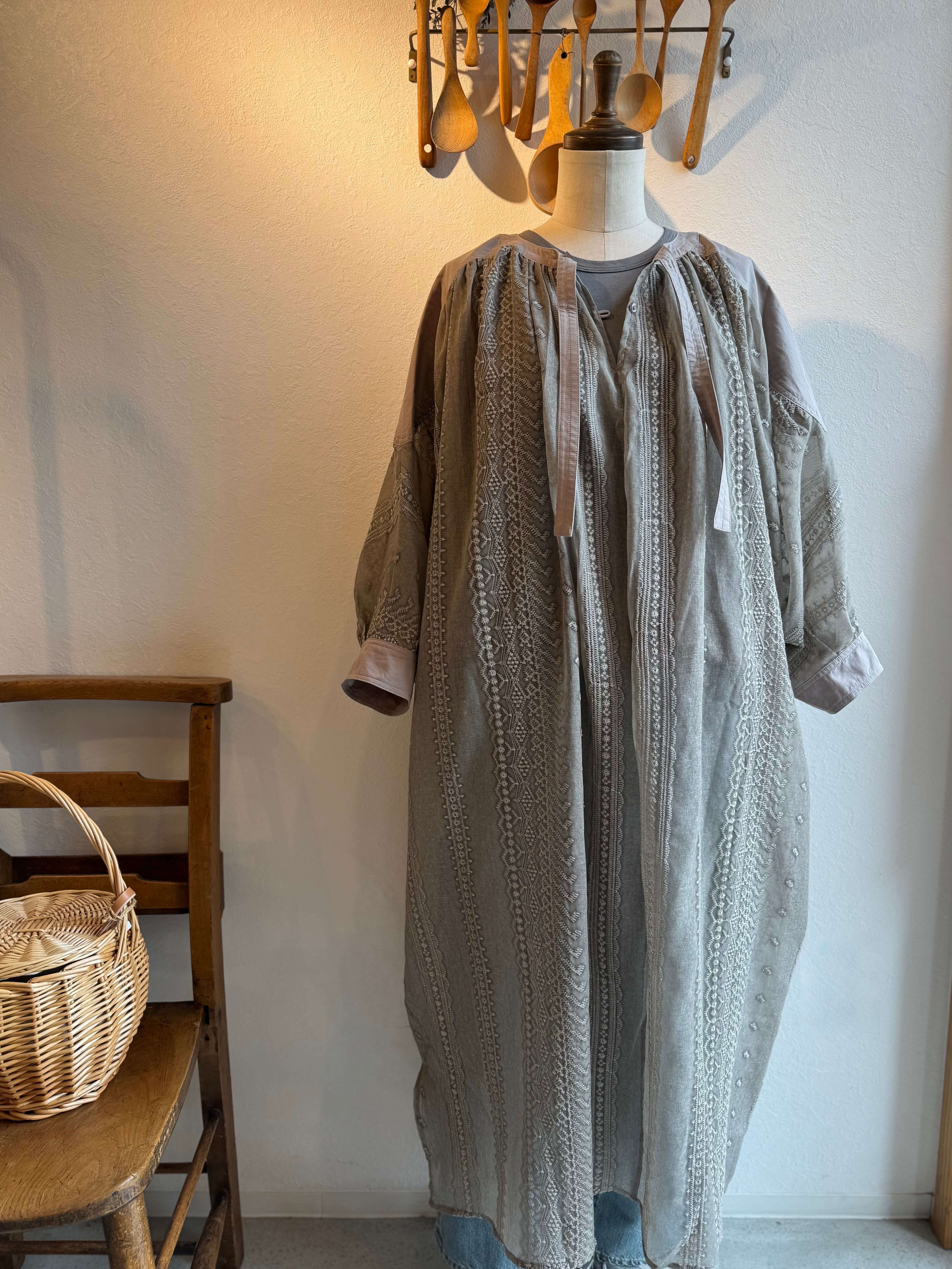 アンティーク感のある刺繍はいろいろなステッチを使っておりとても丁寧に仕上げられています。コットンのような手触りのポリエステル素材の薄いボイル生地にたっぷりの刺繍。肩の切り替えから細かなギャザーを入れて裾に向けてふんわりとしたシルエットを作っていてとても素敵な雰囲気です!